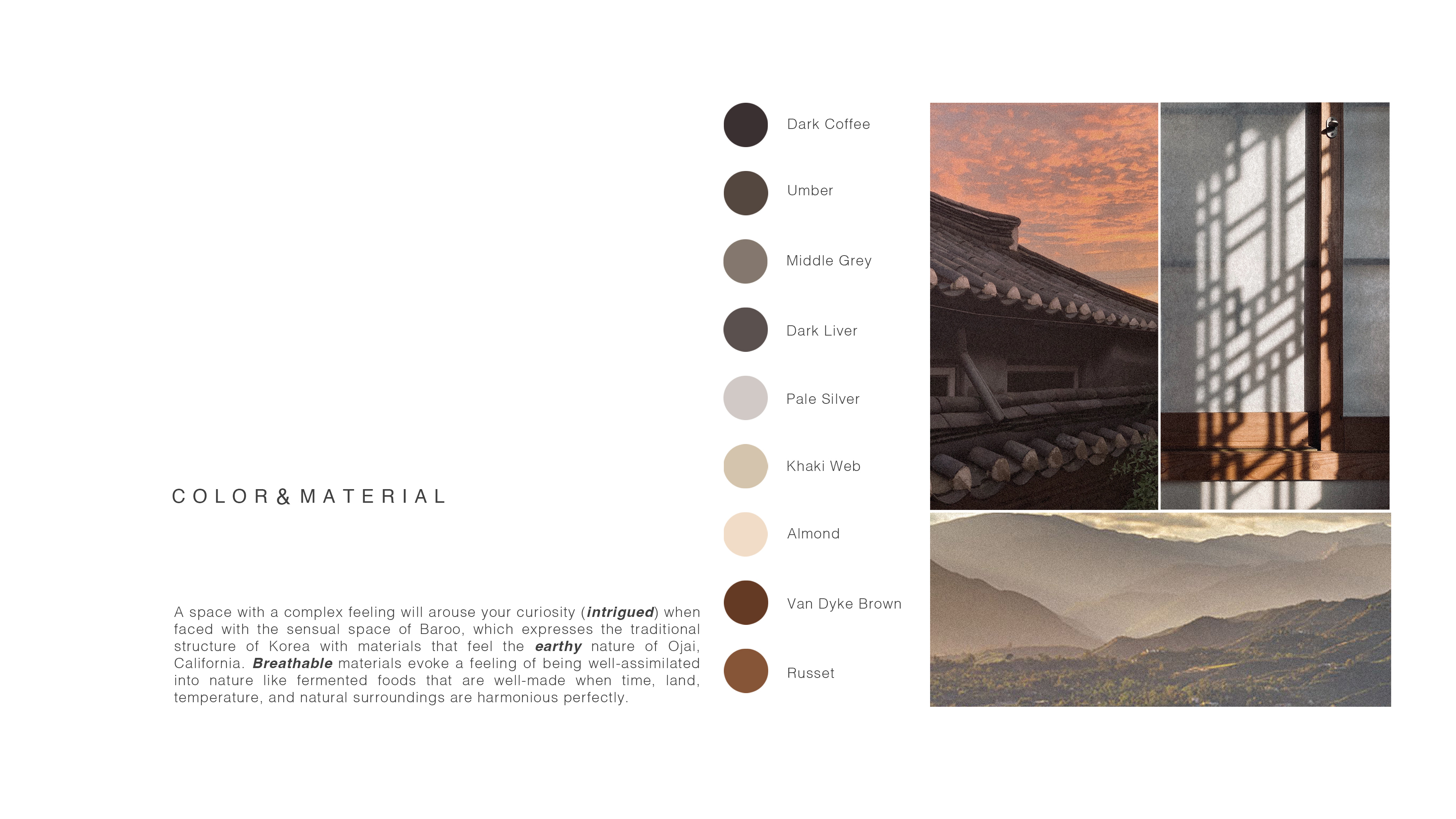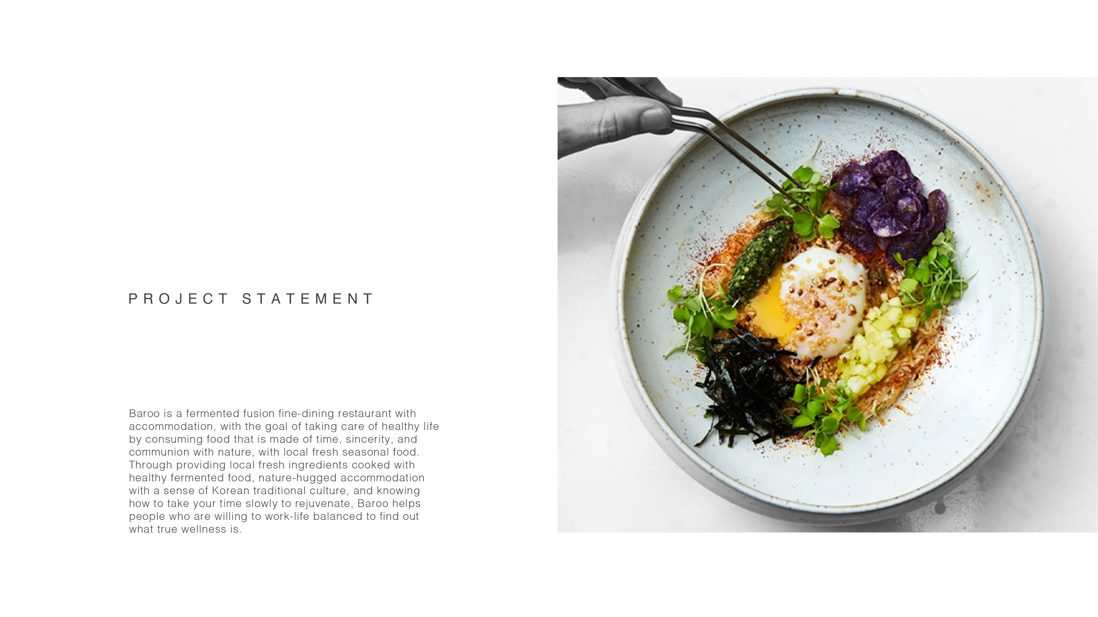 Baroo is a fermented fusion fine-dining restaurant with accommodation, with the goal of taking care of healthy life by consuming food that is made of time, sincerity, and communion with nature, with local fresh seasonal food.