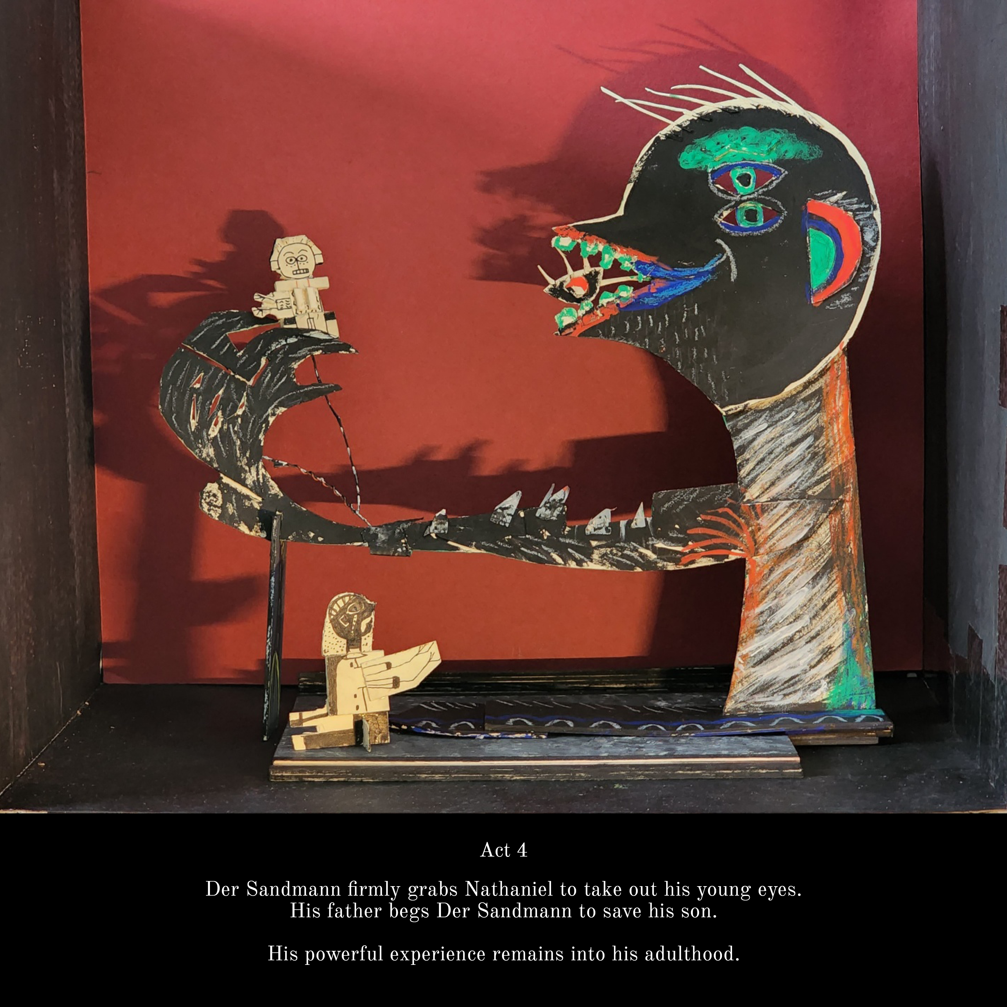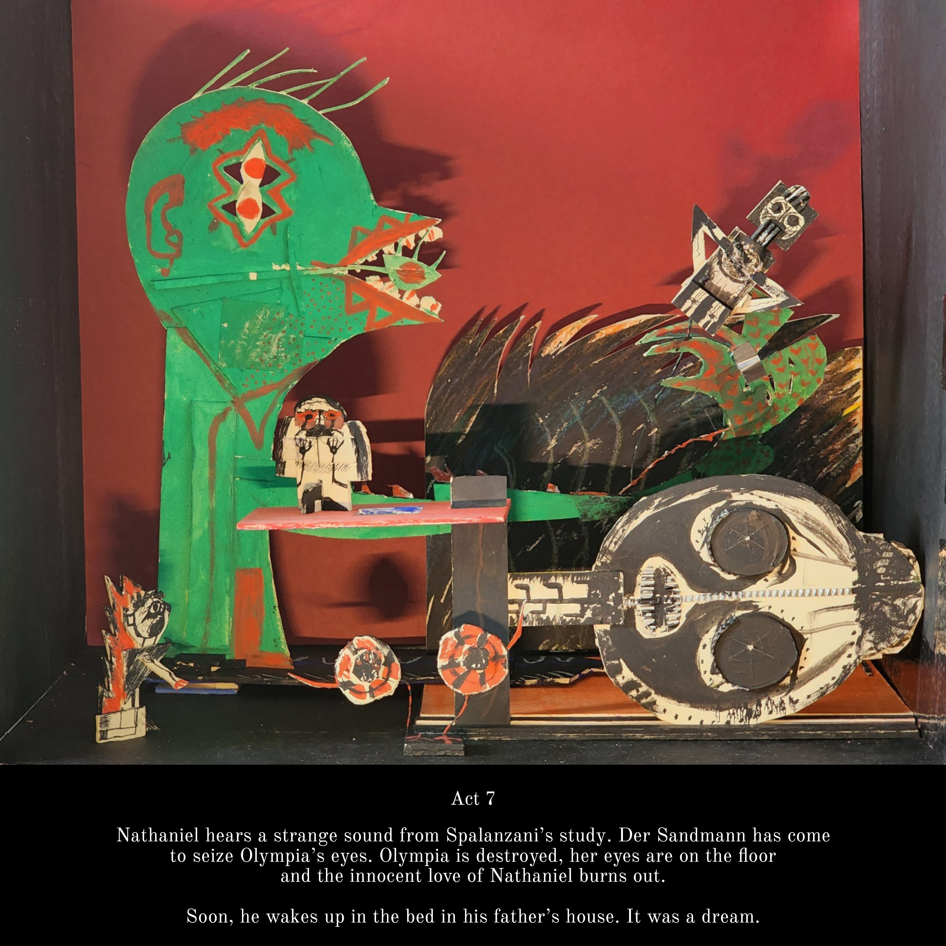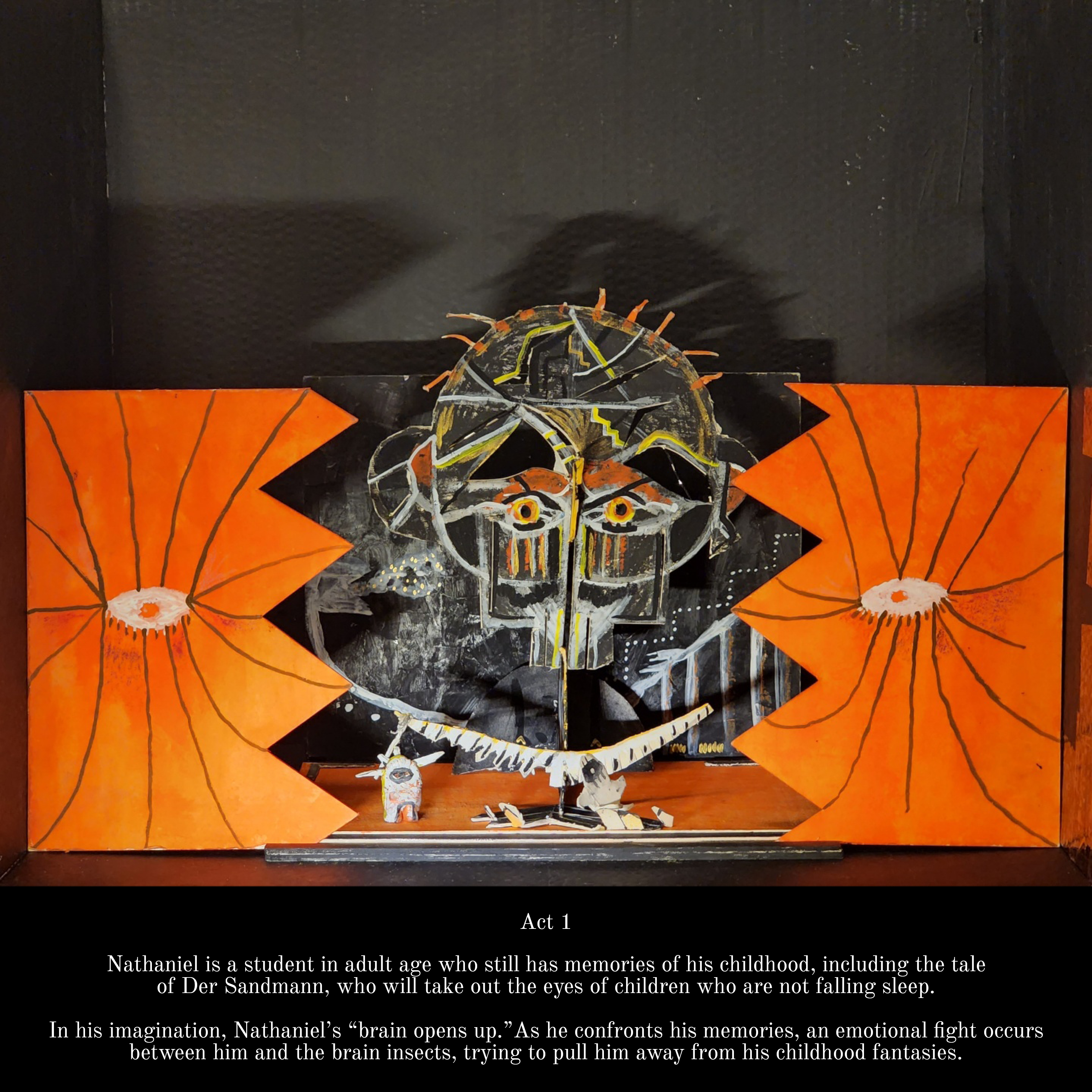 During the Berlin Study Away Program, I am inspired by cultural invitations, such as operas and the value to continue its creative handcrafts. I believe that keeping the old memories and sharing them today are significant, which I found a need to create a nostalgic theater for dreamers. I researched tales in Germany, Der Sandmann by E. T. A. Hoffmann as a great story for me to go deeper with its honesty. I used papers, clays, and wires for the stage.