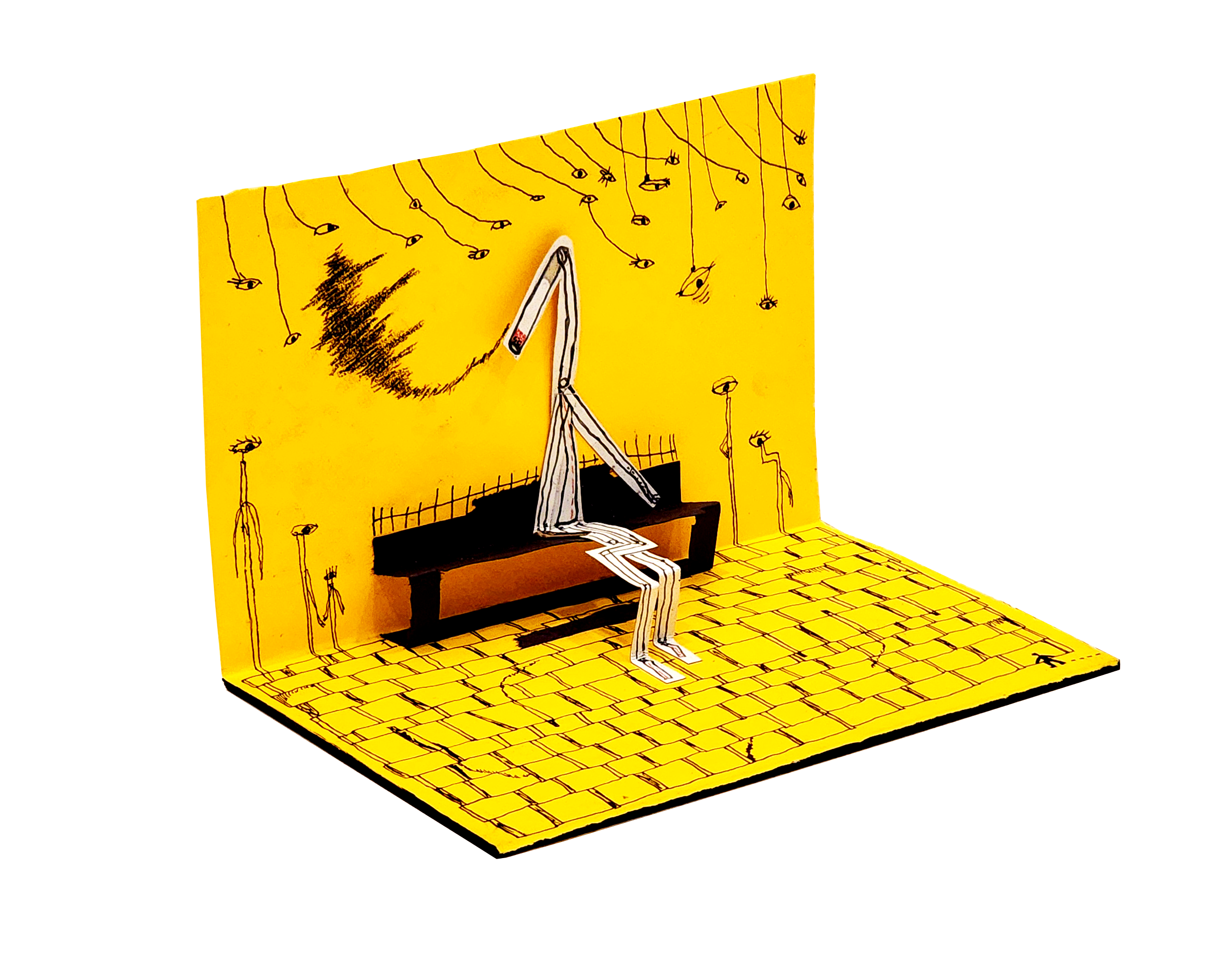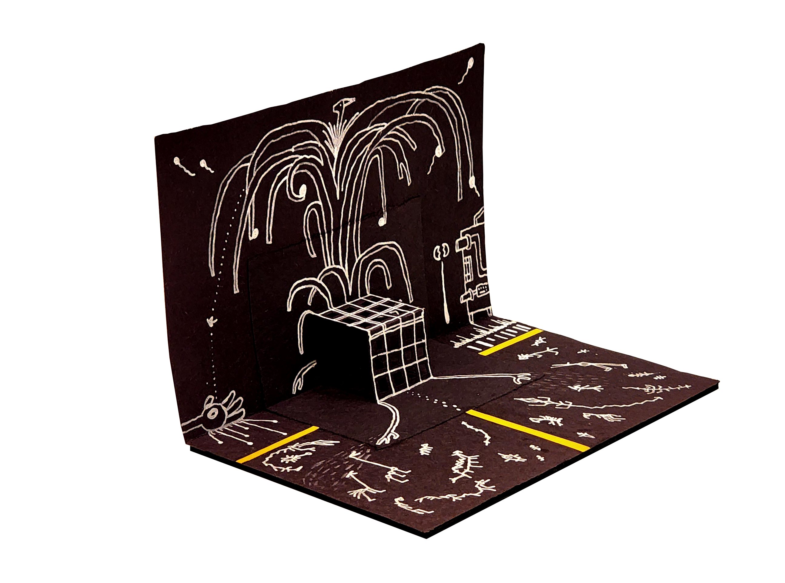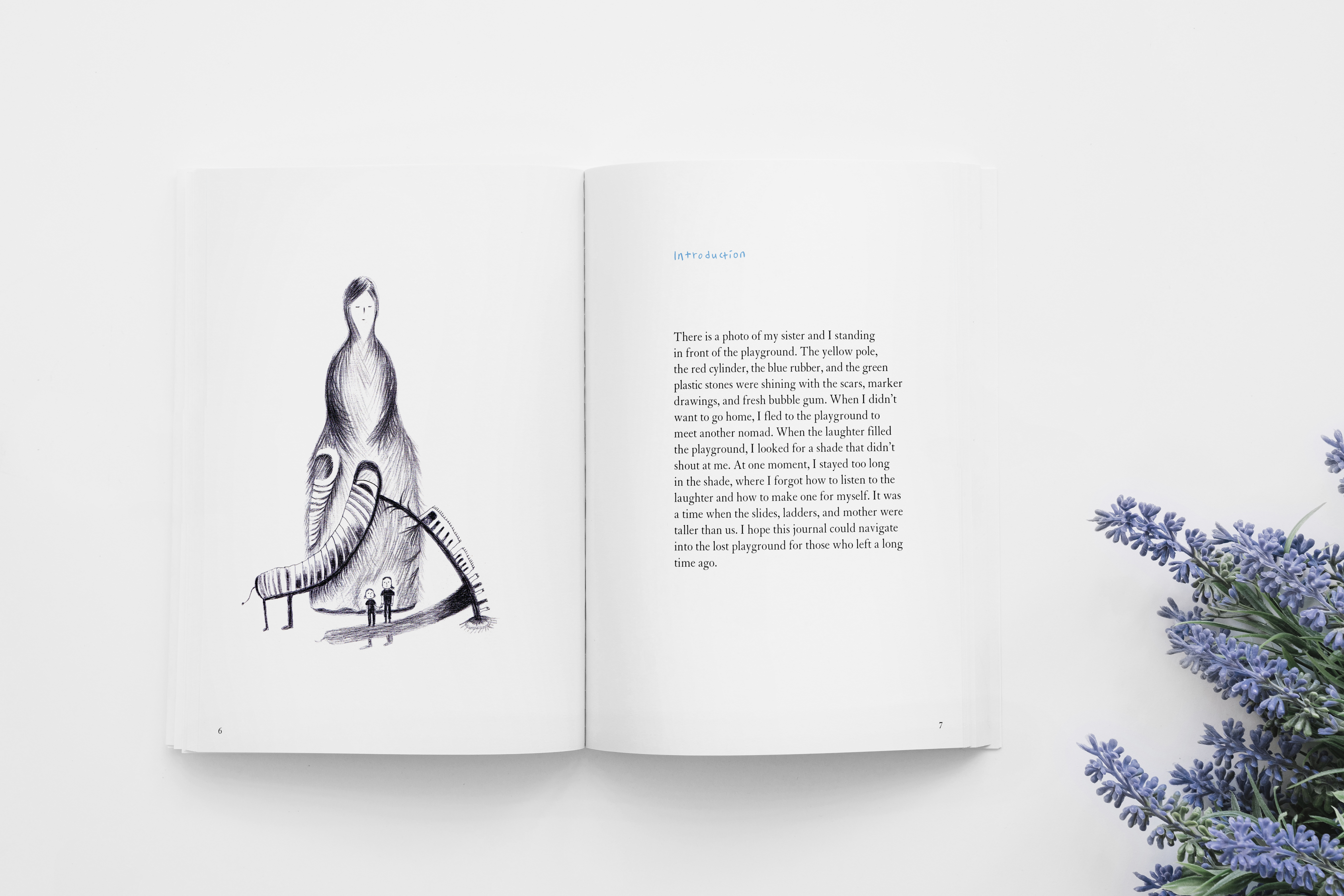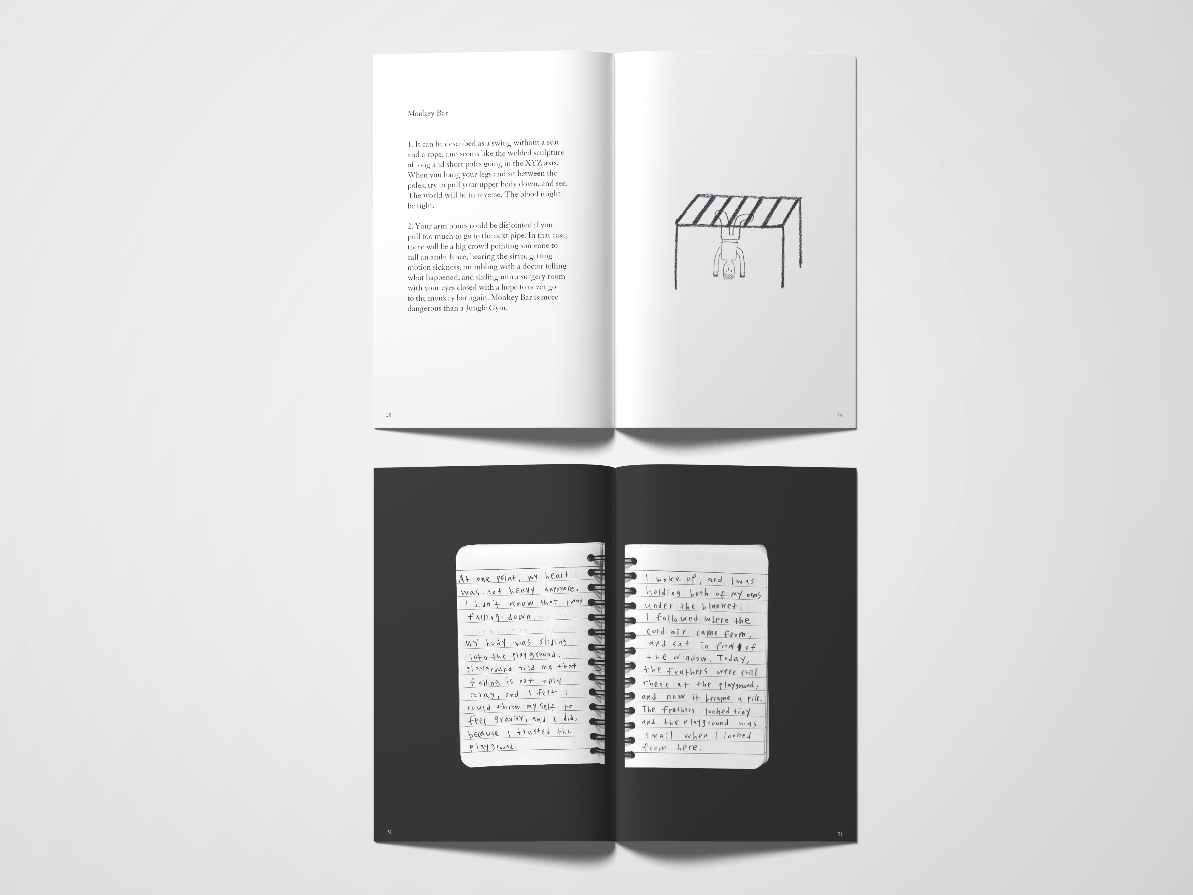 I experimented with the visual references of the playground structures and imagination from remembering back the moments from the past. I produced this as the hardcover book along with the pop up images for the final presentation. Please find the link below to experience a full story.