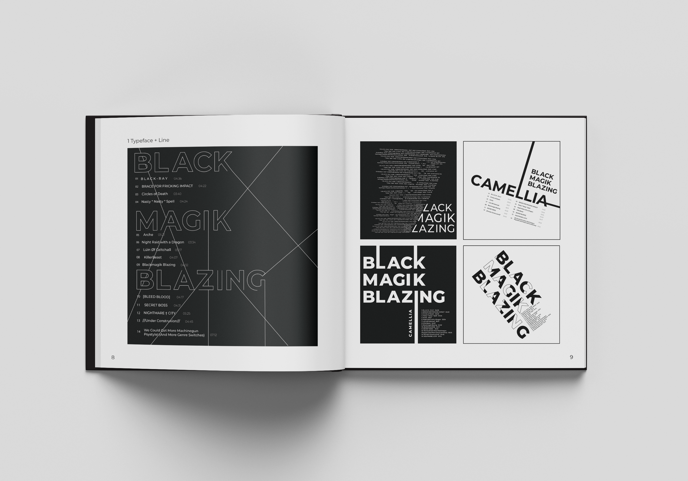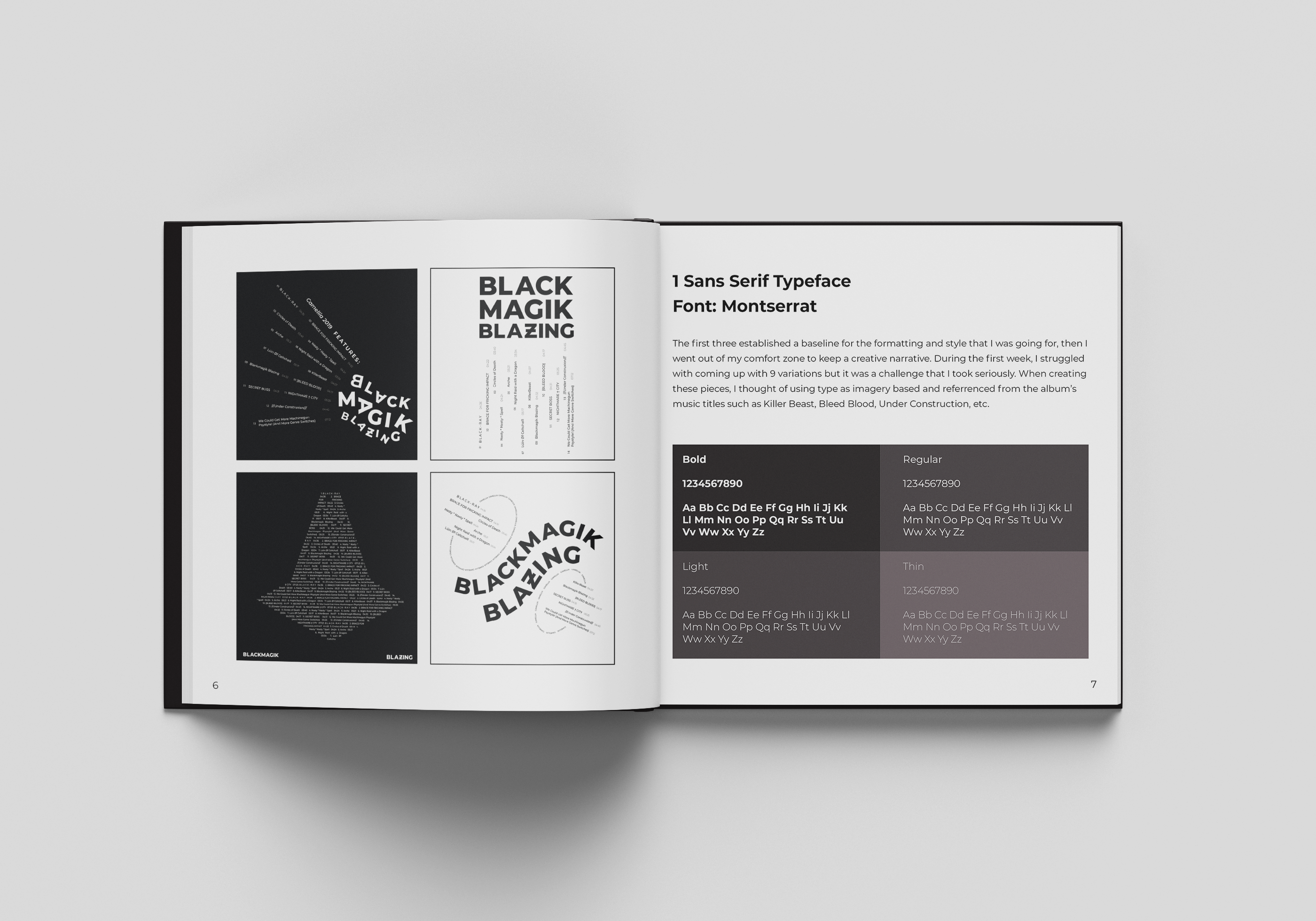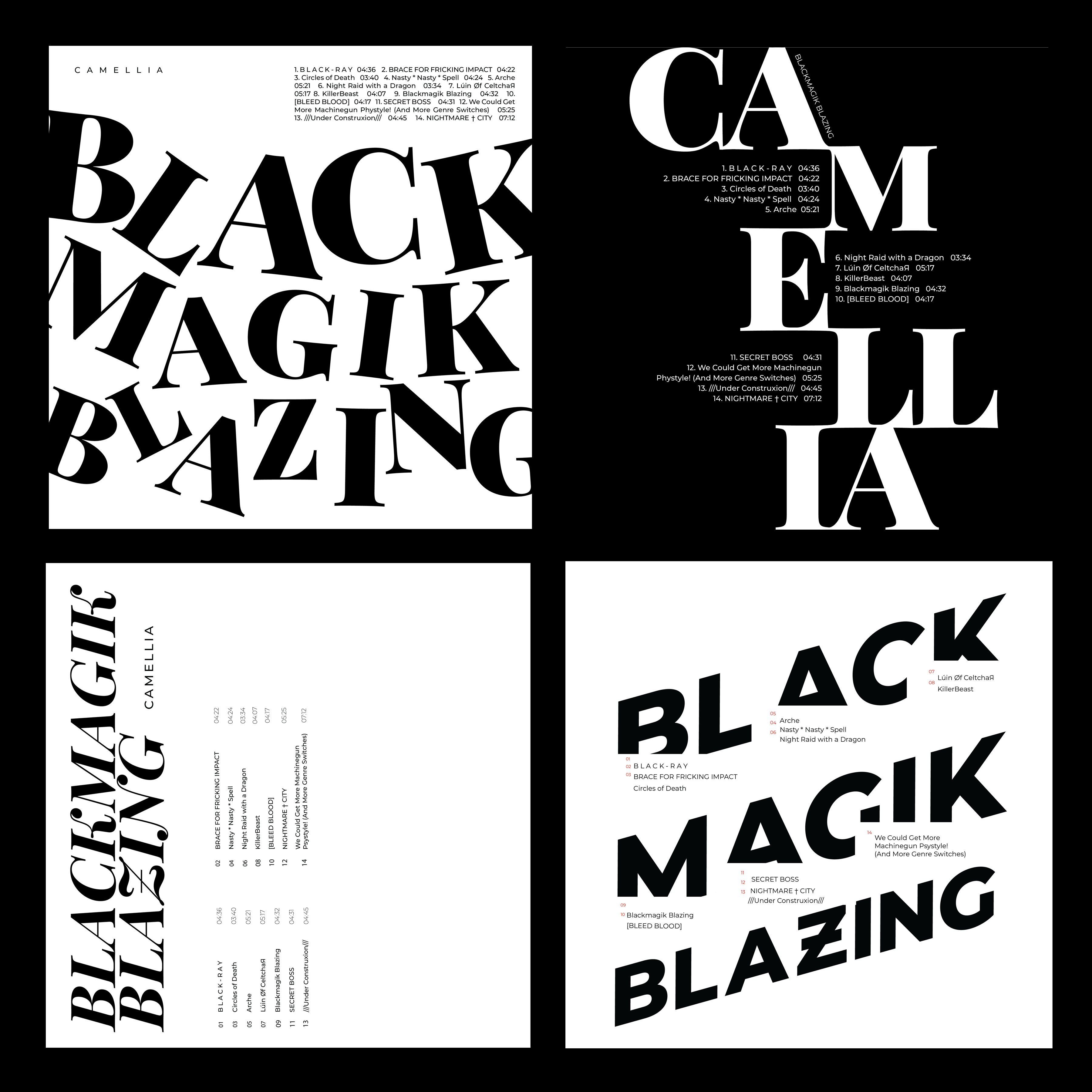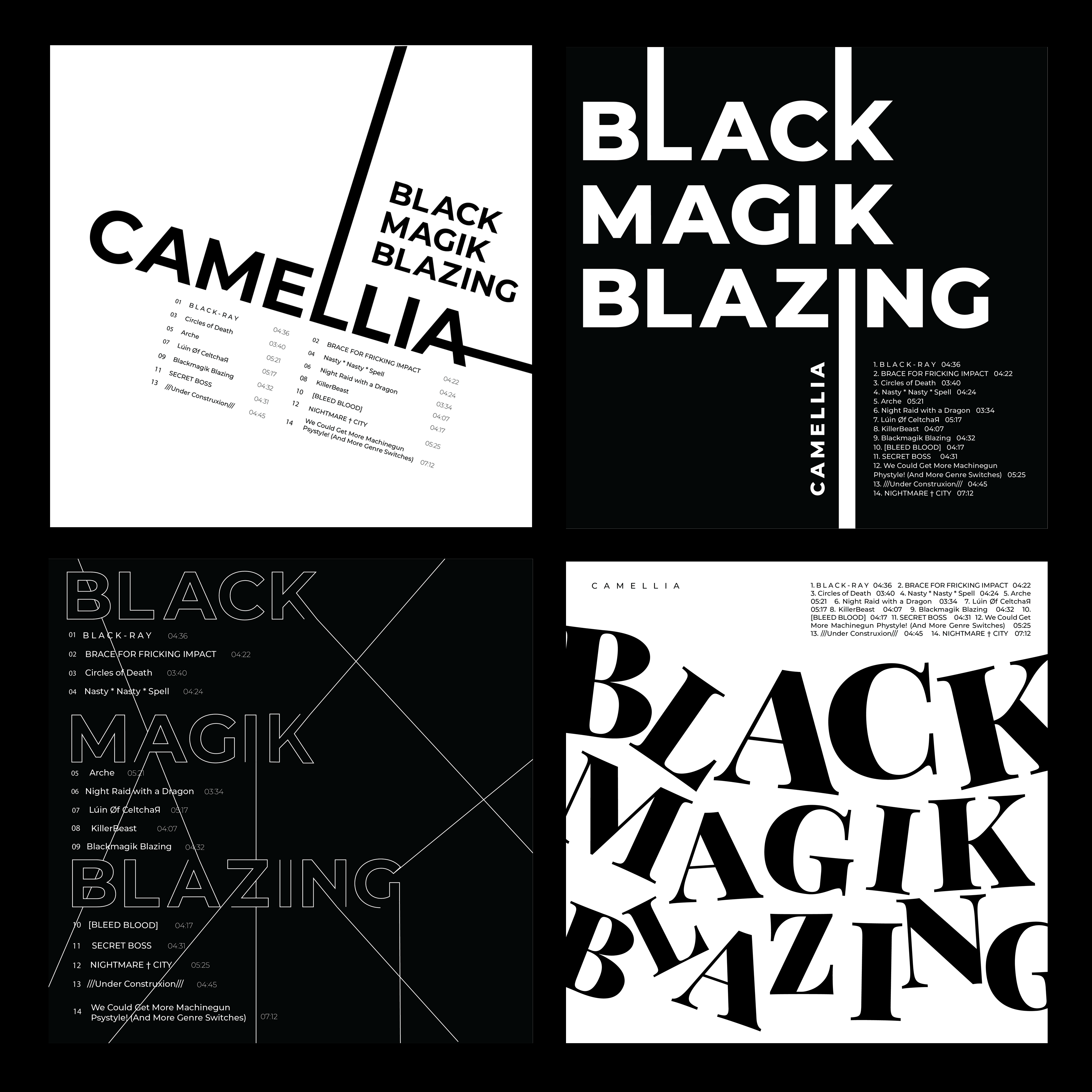 This is a series of typographic exercises to further develop type fundamentals through different forms of expression, and second, application of the learned fundamentals through poster series. Each exercise utilizes 9 unique and conceptual typographic layouts, with a favorite selected on a chosen album. For this typography foundation sequence, I chose the album Blackmagik Blazing, EDM music curated album, by Camellia. The modern piece is focused on darkness and black magic.