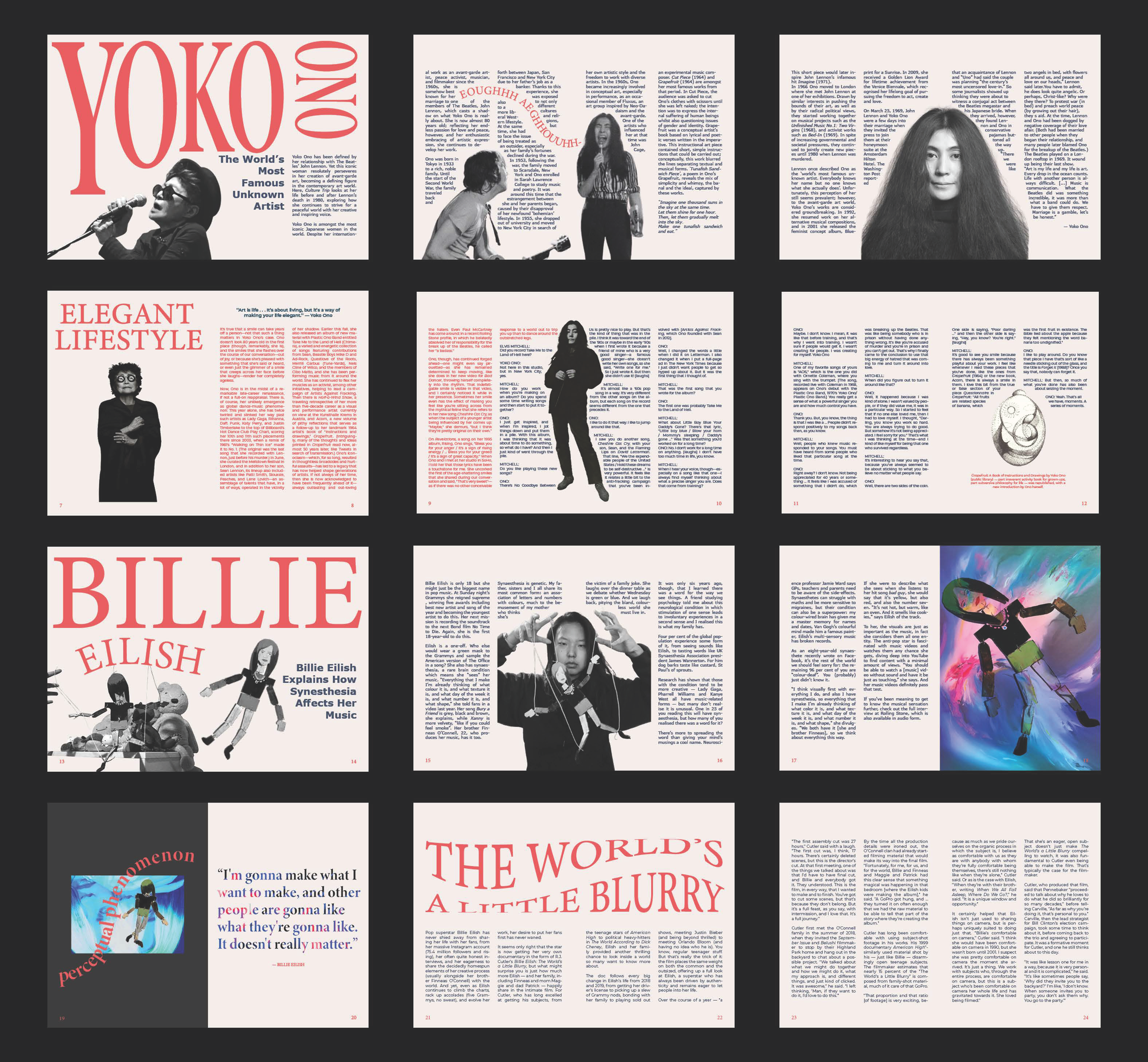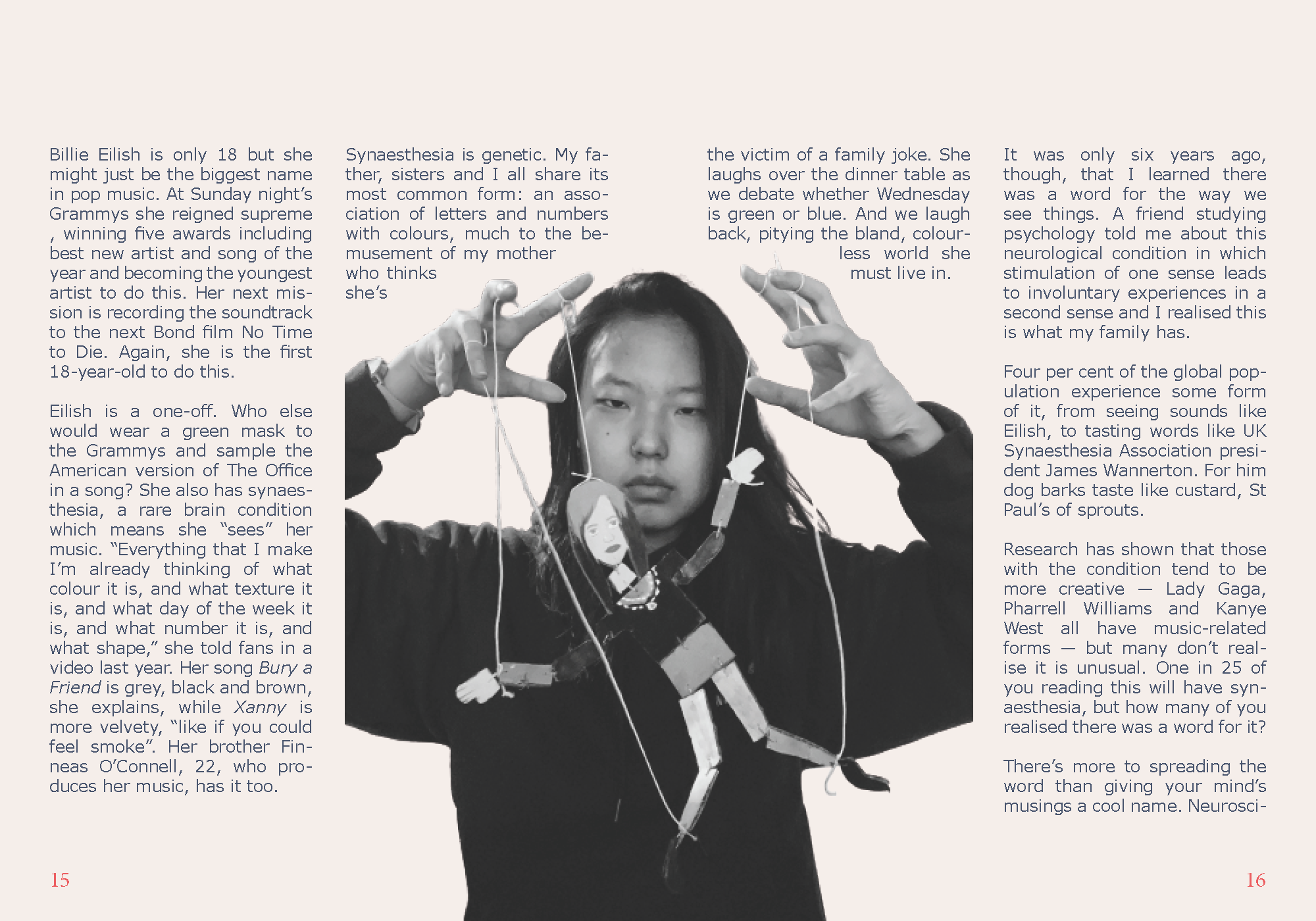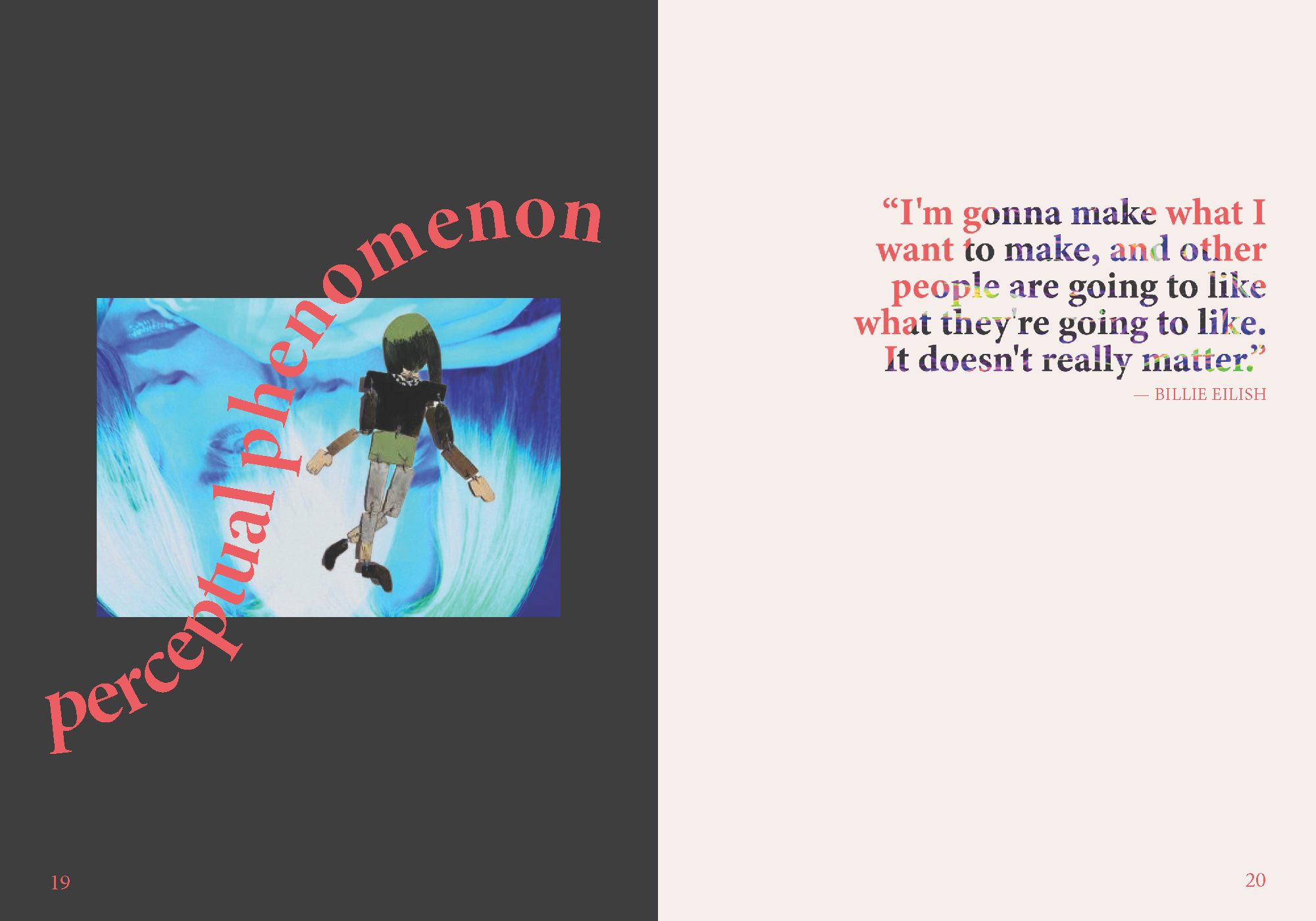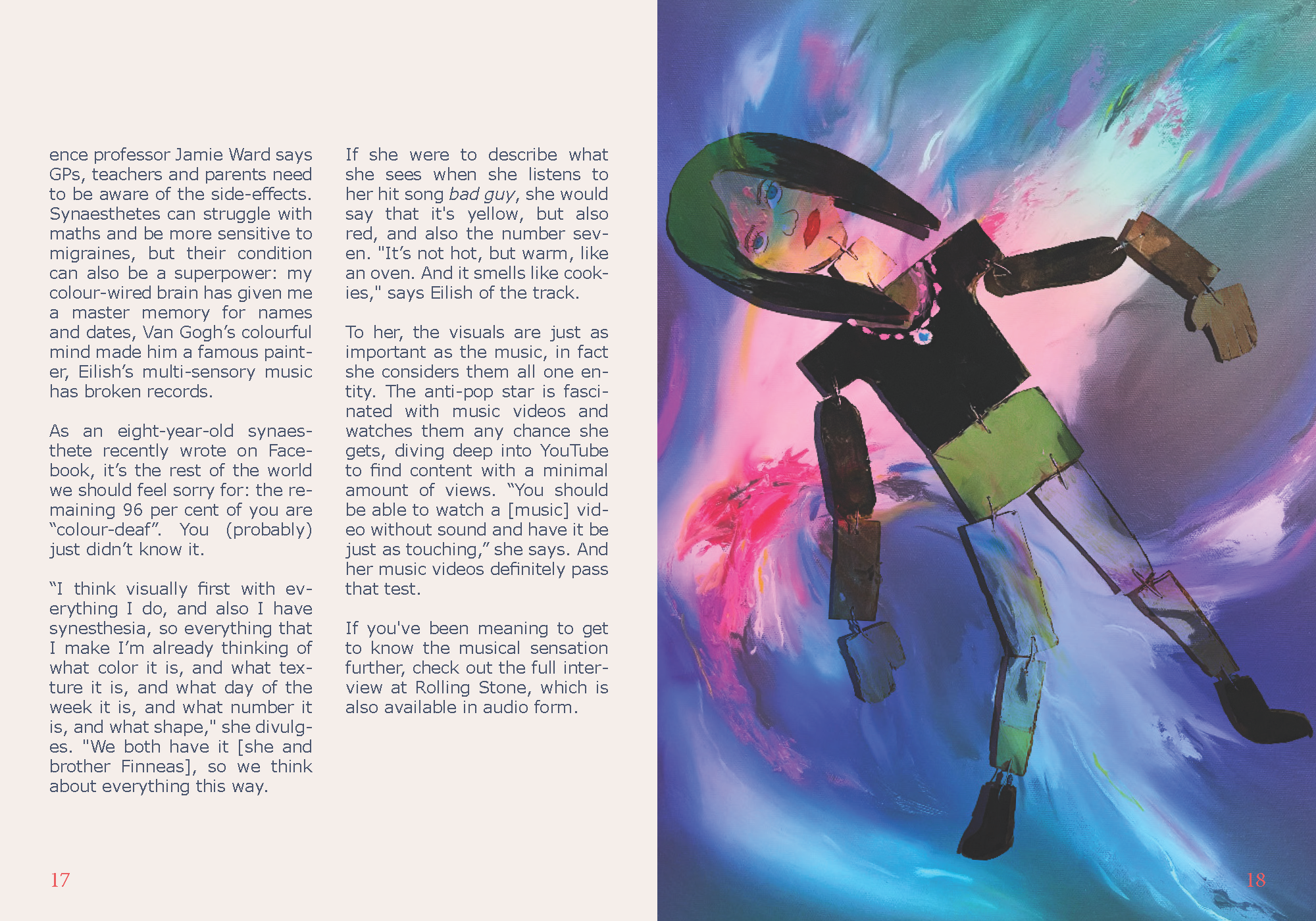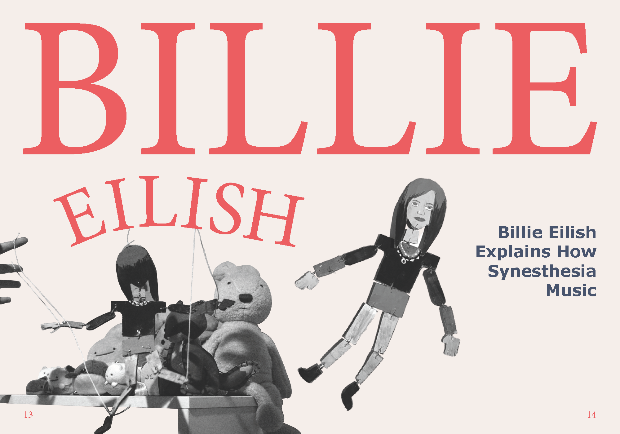 In the first poster, aperature changes from focus to the background to the foreground. The second is visually related to synesthesia which is a condition that refers specifically to perceptual experience that includes mixing of senses. Billie Eilish has this Synesthesia which is considered a gift.