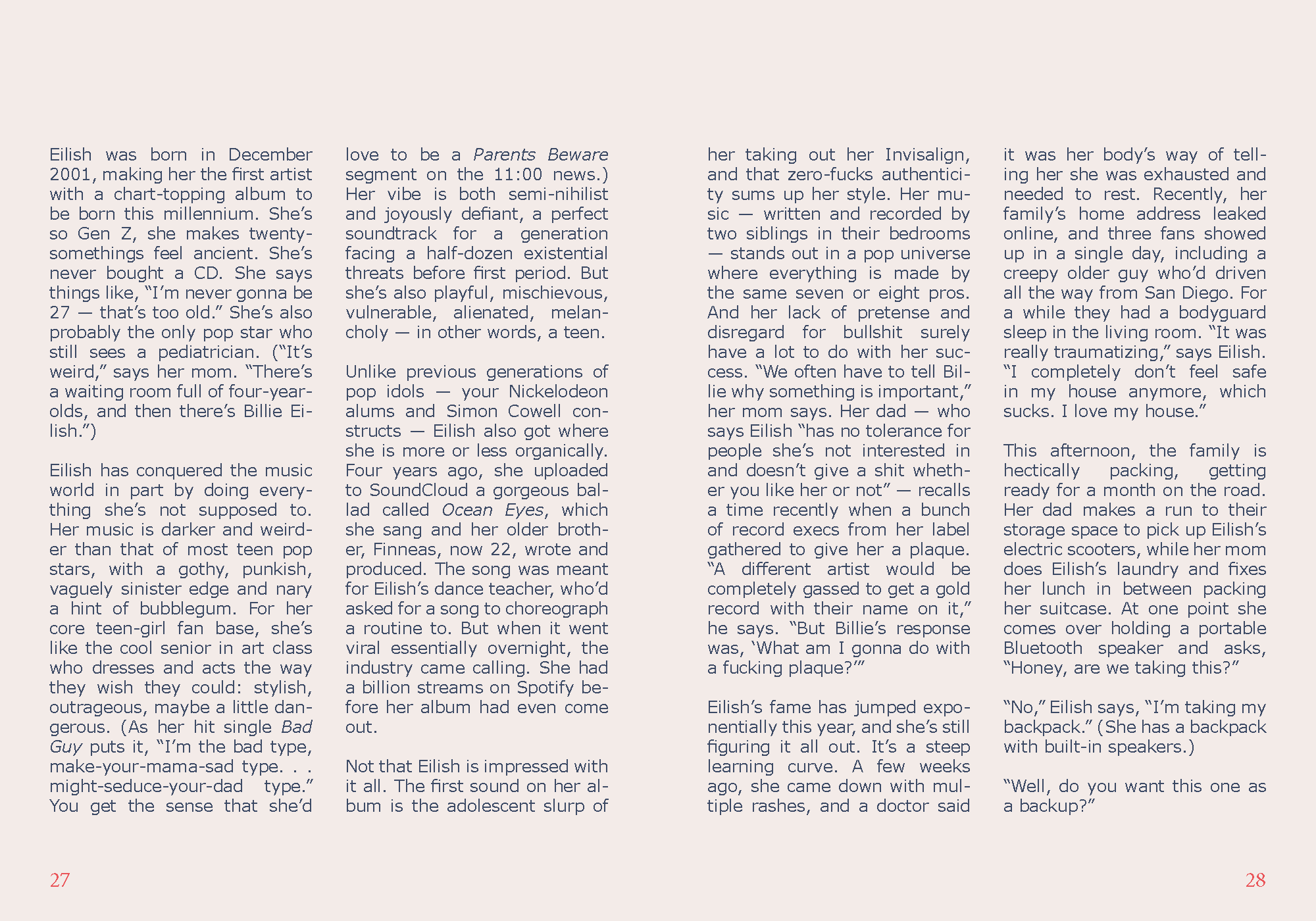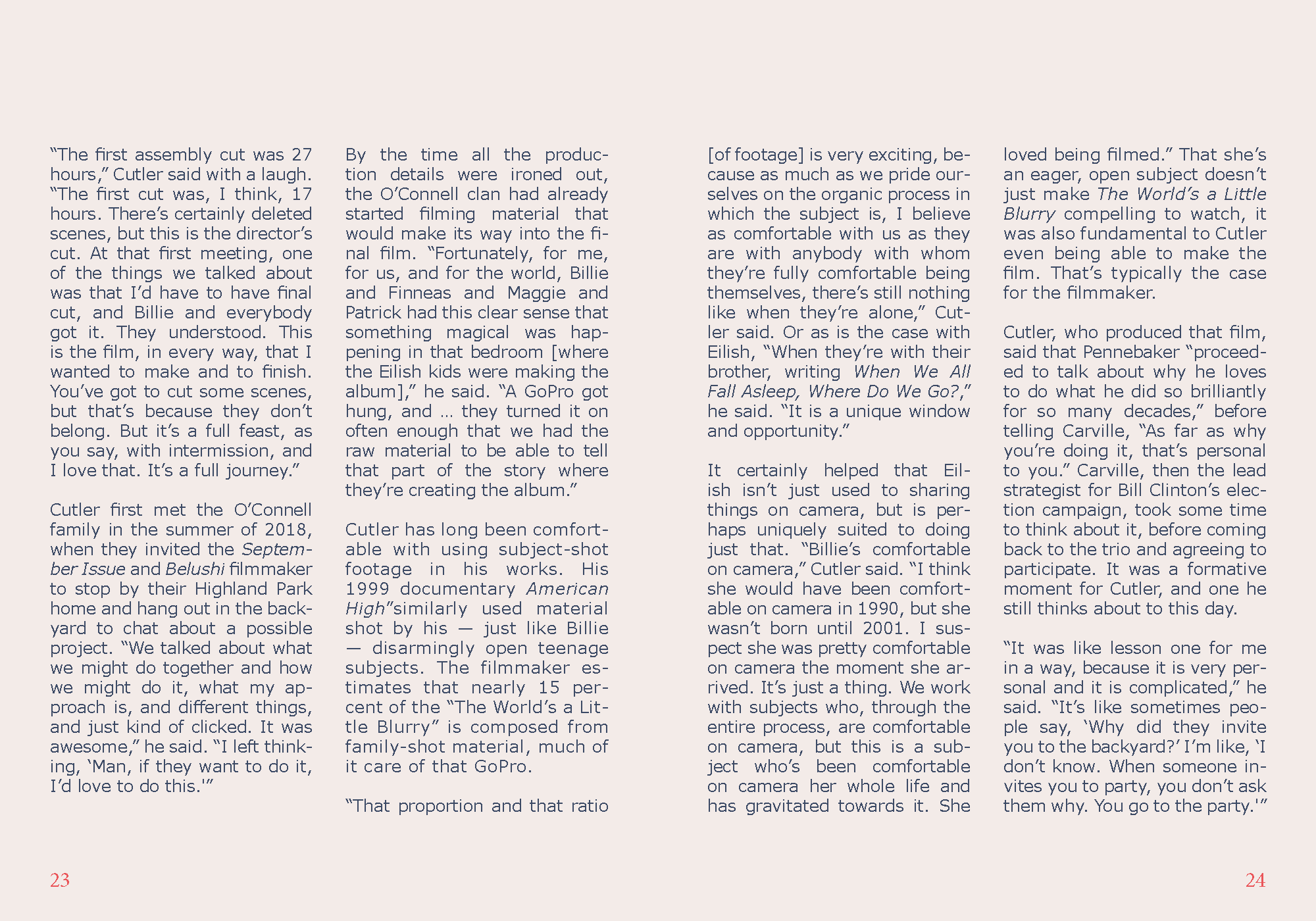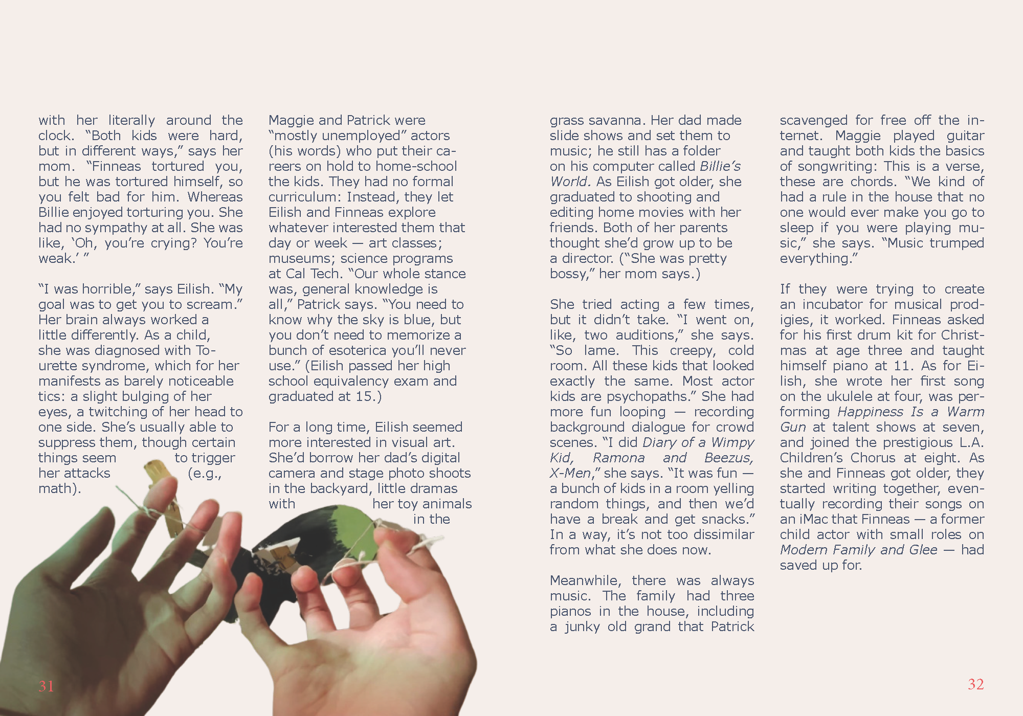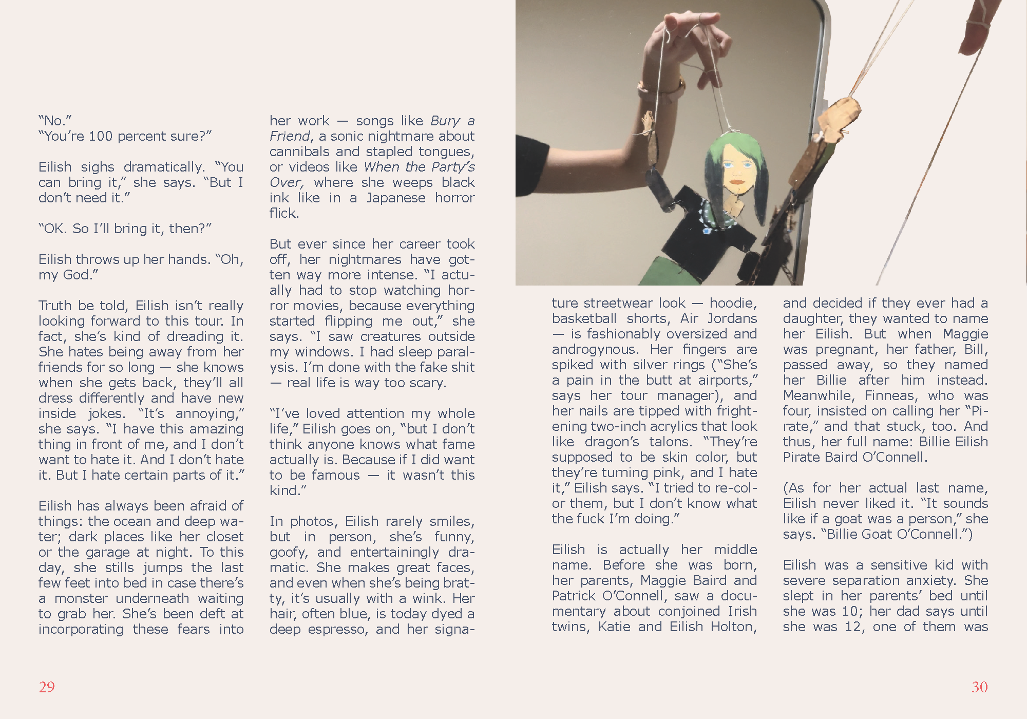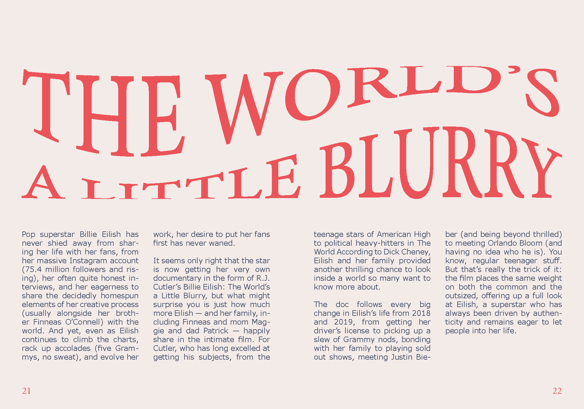 In the first poster, aperature changes from focus to the background to the foreground. The second is visually related to synesthesia which is a condition that refers specifically to perceptual experience that includes mixing of senses. Billie Eilish has this Synesthesia which is considered a gift.