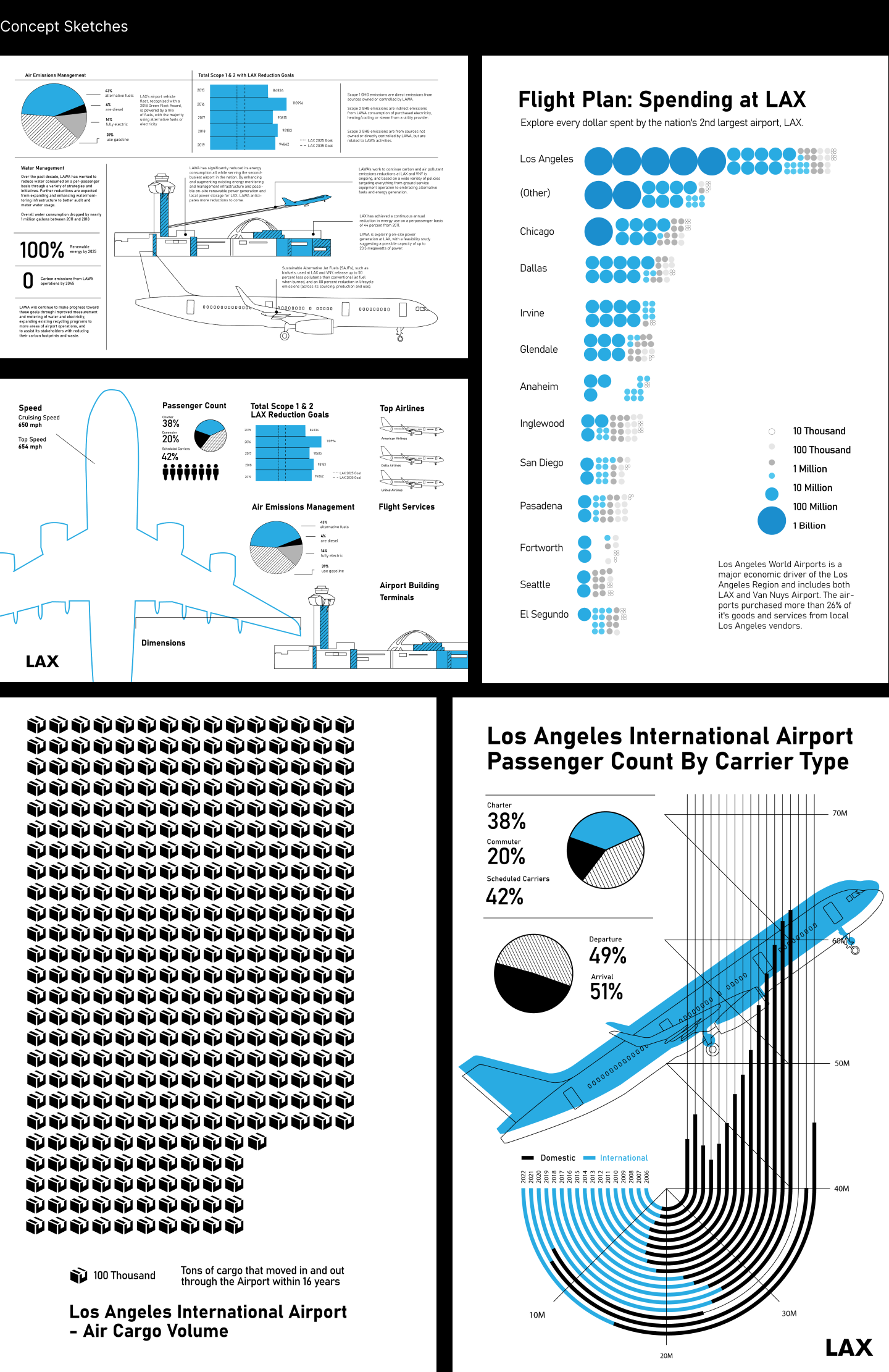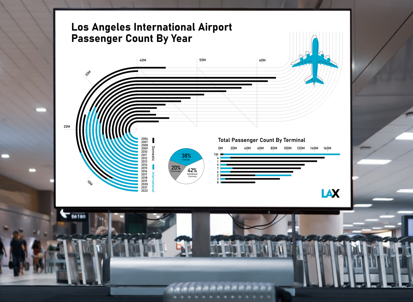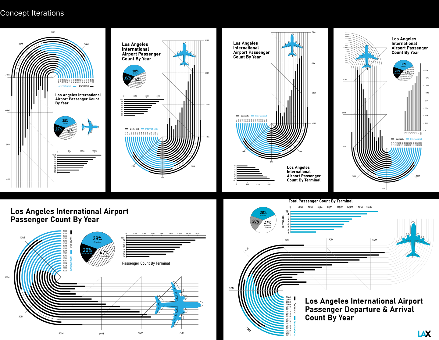Researched and designed a 24 x 36 inch poster. Focused on the volume and nature of the arrivals and departures that came through the LAX airport within the provided span of 2006-2022. The visualization of the line graph was inspired by the airplane runways. Looking at several iterations, making the poster orientation to landscape was easier to read than the vertical. This infographic poster was made with the available online datasets provided by lacity.org