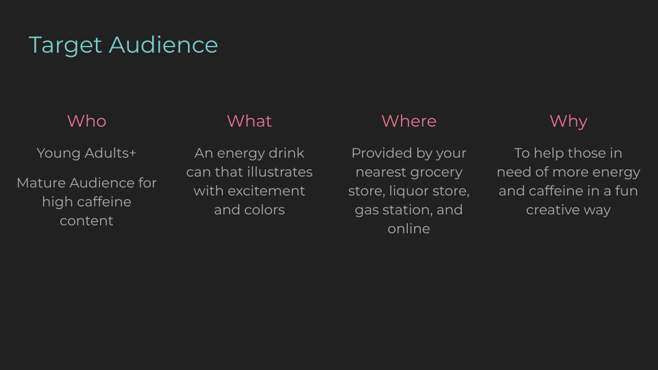 While creating this energy drink, I went through the process of figuring out what kind of colors to choose from a specific theme/style. This also was my first time using an alternative punk illustration in my design and incorporating it into the logo. I had so much fun creating this project because it suited my interest!