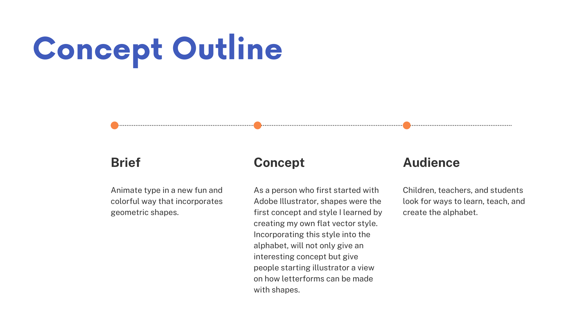 Show and Tell is a motion piece to display the alphabet for children, teachers, and students looking for ways to learn, teach, and create the alphabet. The theme of the alphabet letters was playful, bold, and bright. My idea was to create a morphing animation of the alphabet that highlights the characteristics and dynamics of each letter. The flow of influence is items you would find at schools such as blocks and playground leaves.