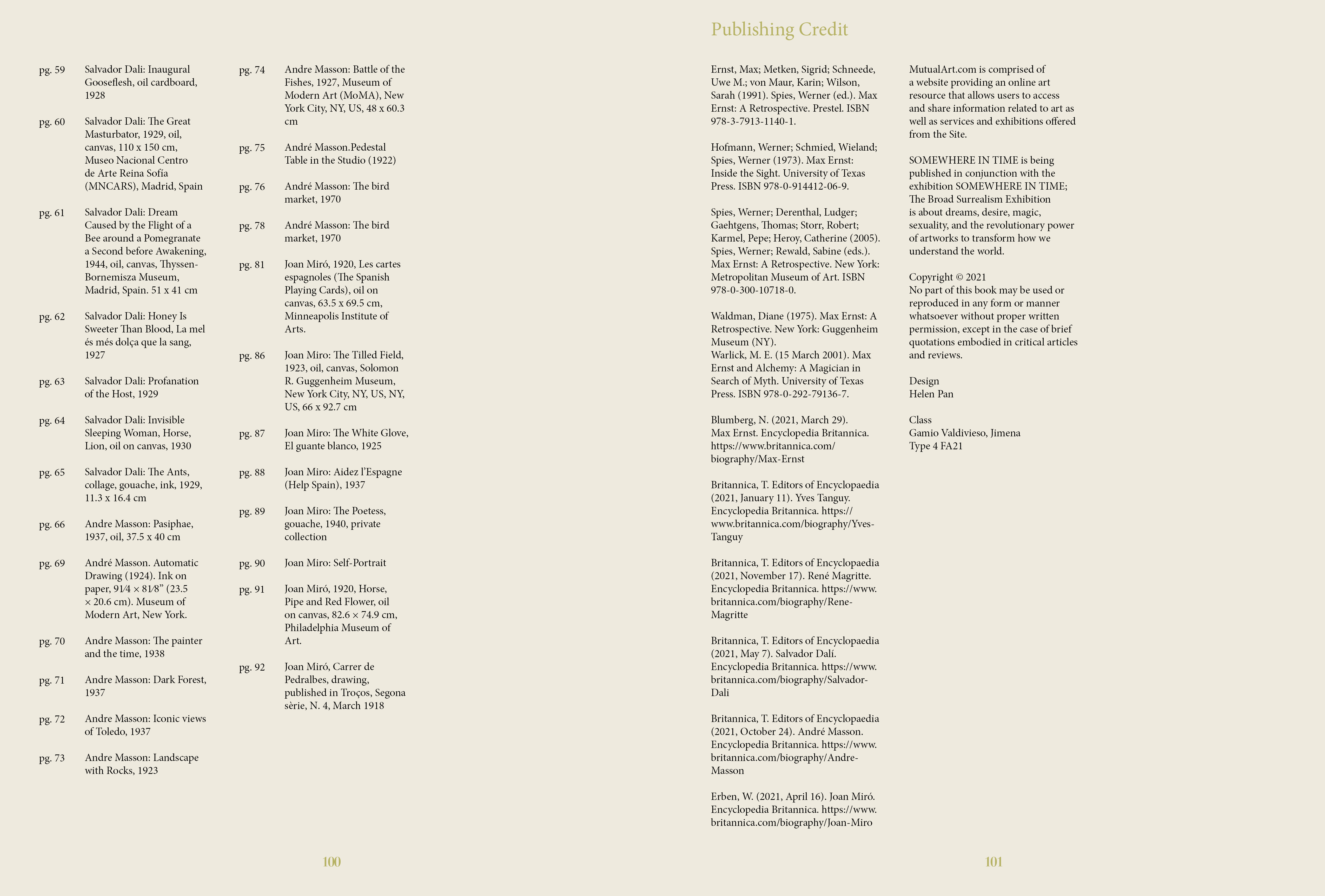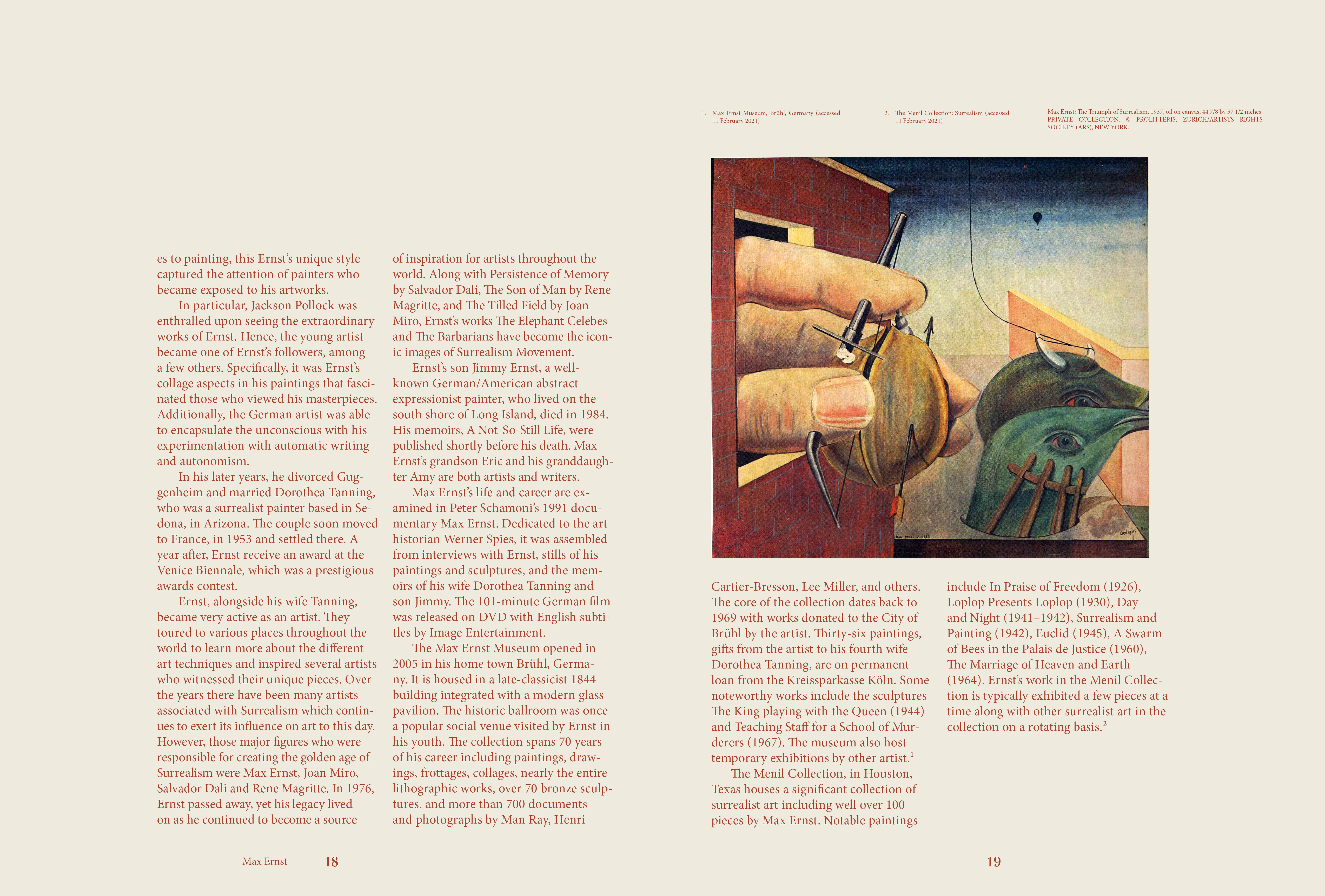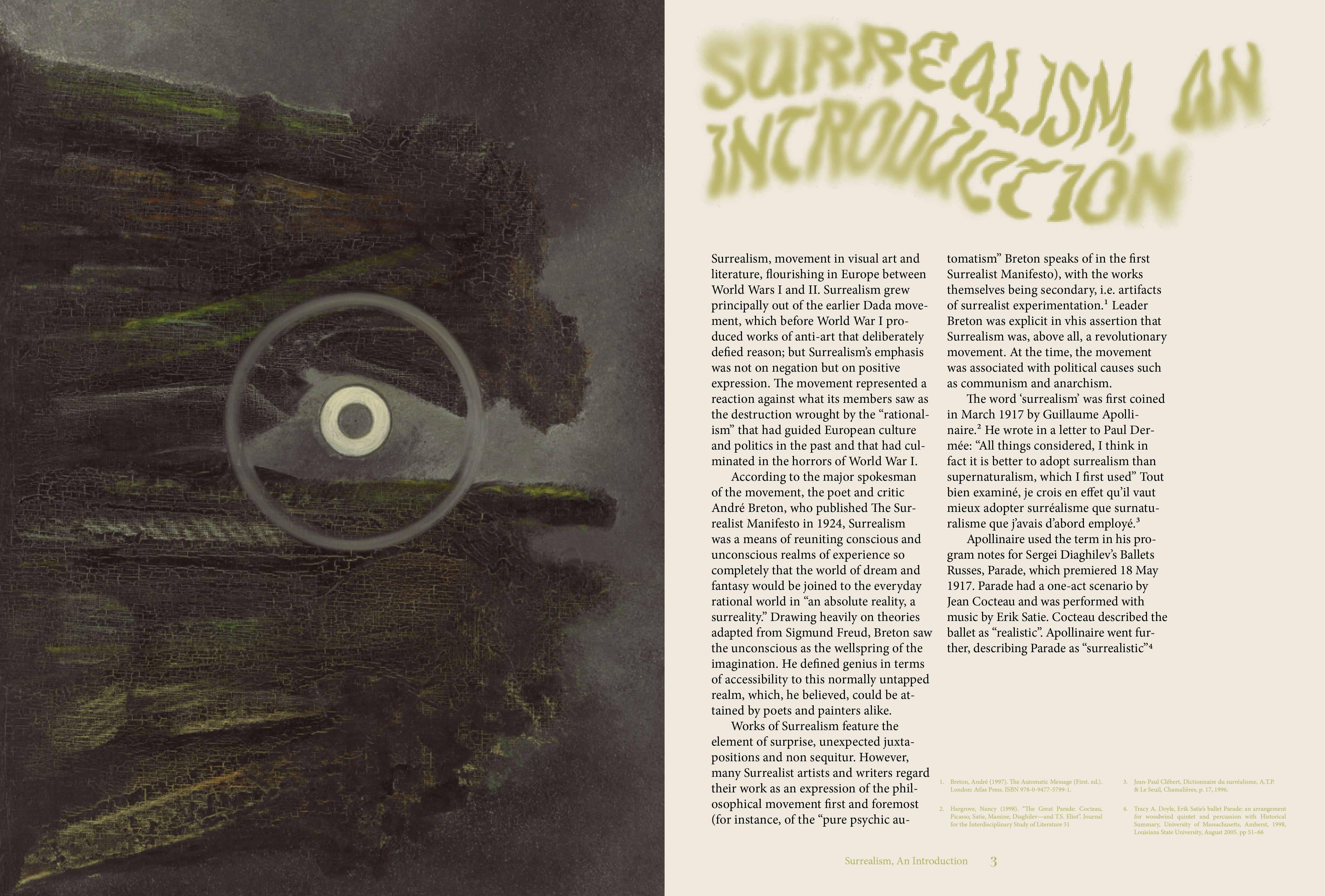 Creating this exhibition meant I had to make a system of ideas to consistently go with all of my products such as the booklet and exhibition wall to go with the surrealism theme. The challenge was creating the booklet system and guide to have a layout that was set through all pages and flow through the book all the way. I learned what list of details to include within the selected exhibition list and the credit needed for each artist.