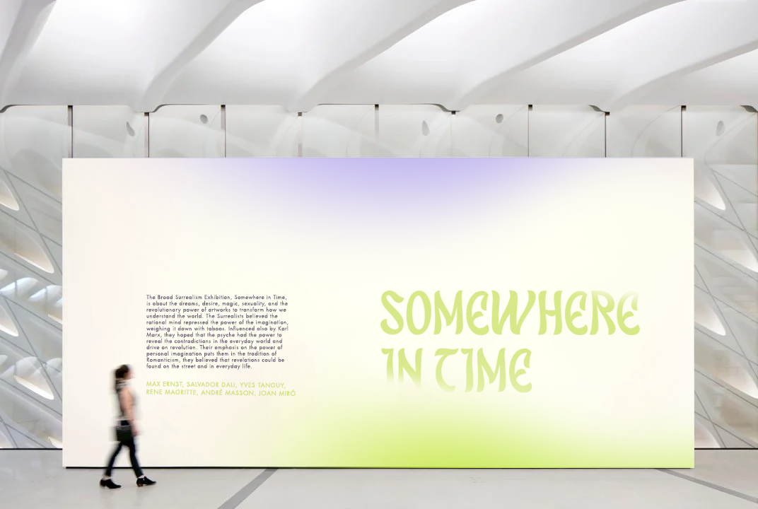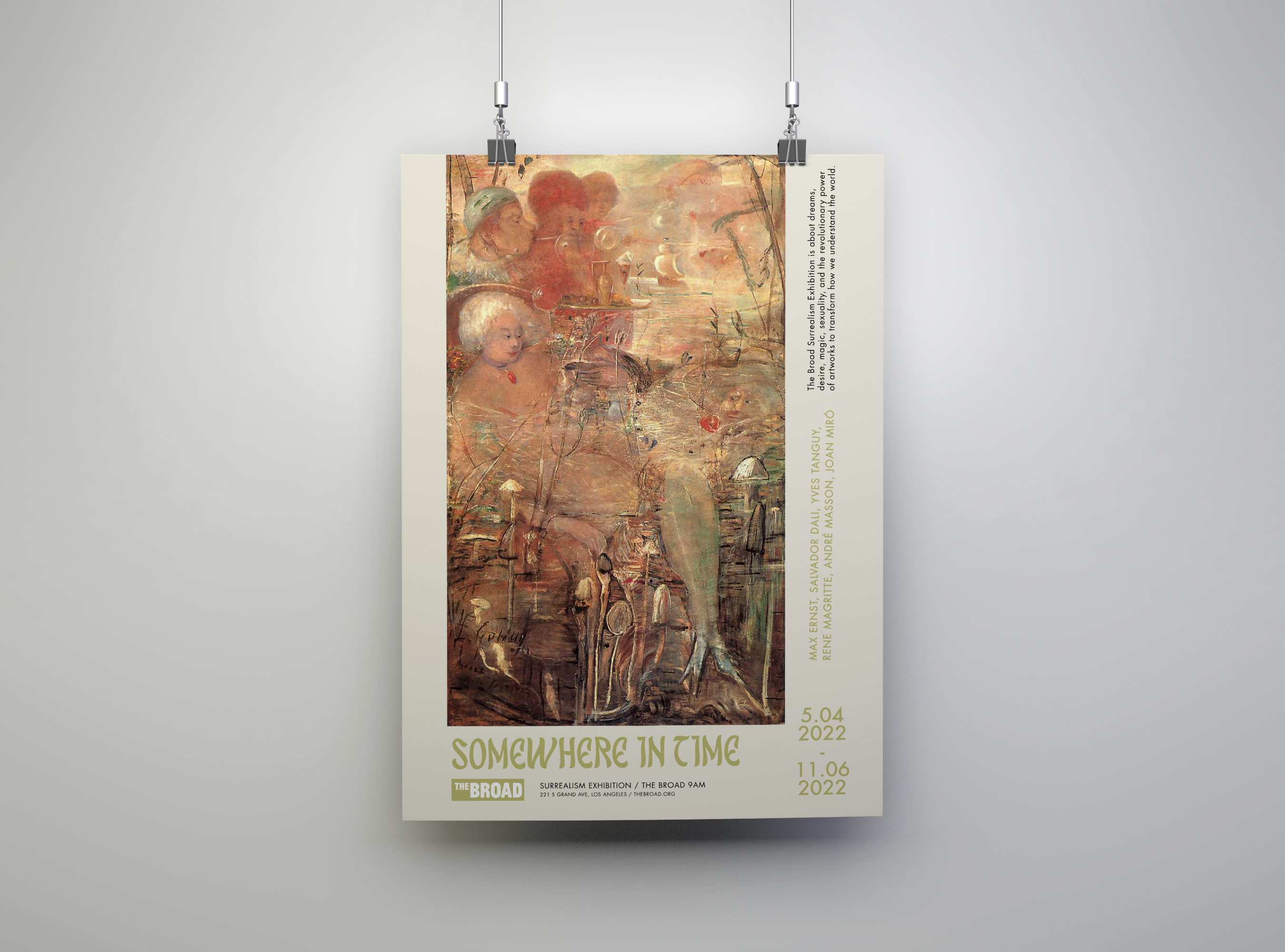 Somewhere in Time is an art exhibition featuring artists in the surrealism movement. The Broad Surrealism Exhibition is about dreams, desire, magic, sexuality, and the revolutionary power of artworks to transform how we understand the world. I developed an identity and visual language which I applied to the catalog, promotional materials, and exhibition space.