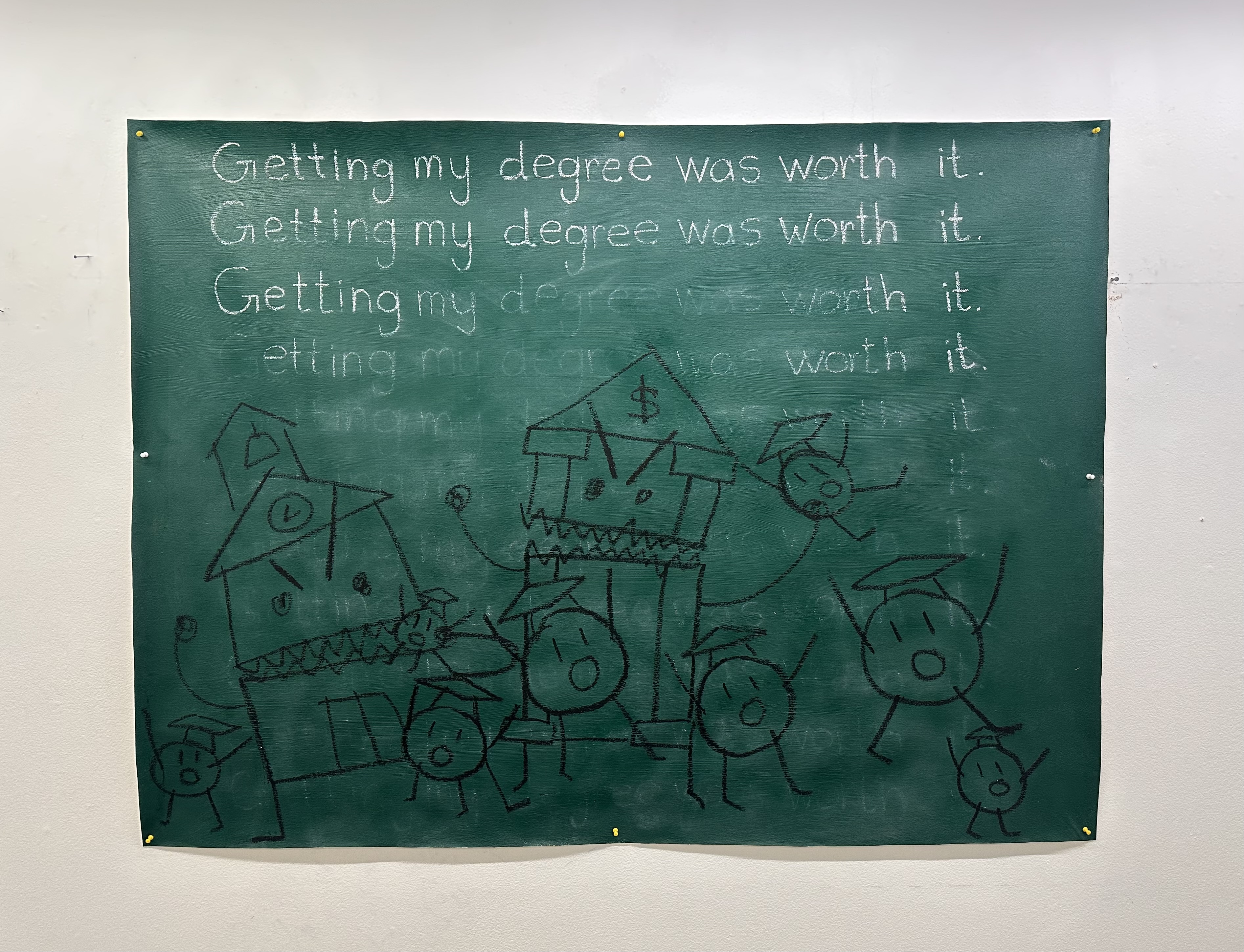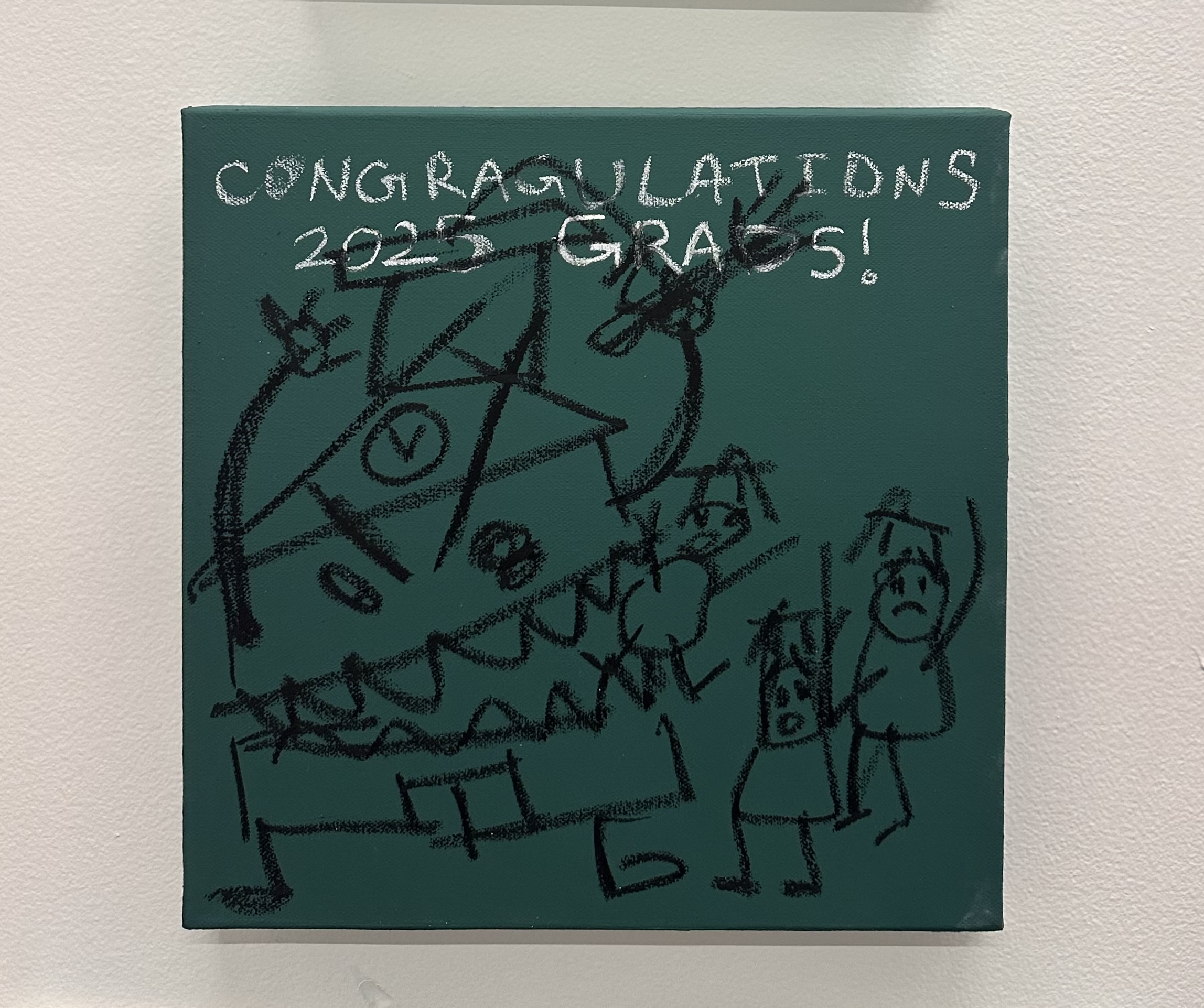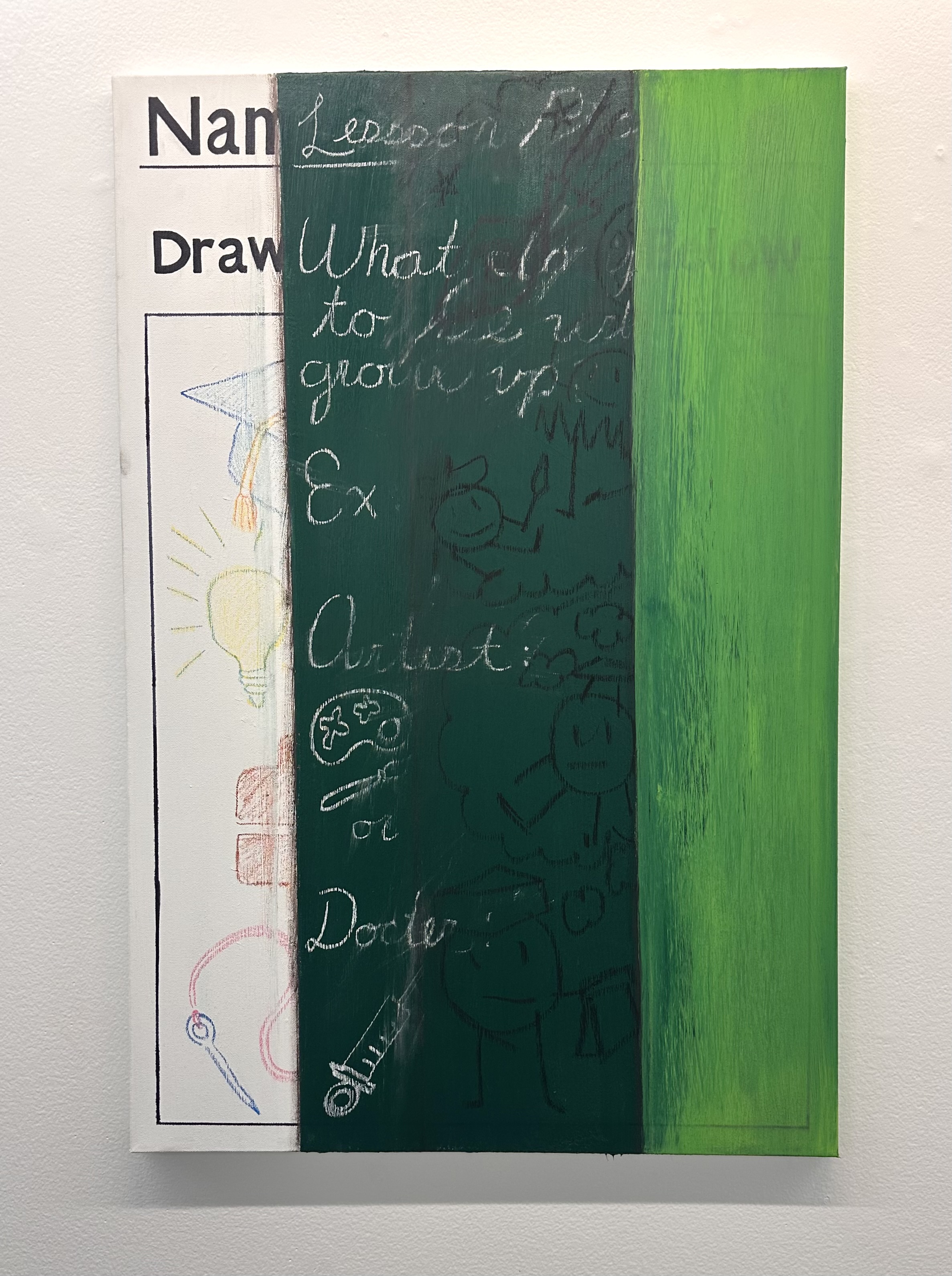 Lesson Plan, 2025 Acrylic paint, chalk, oil stick on un-stretched canvas 50 x 66 in / Detention, 2025 Acrylic paint, chalk, oil stick on un-stretched canvas 50 x 66 in / Graduating Class of 2025, 2025 Acrylic paint, chalk, oil stick on canvas 18 x 18in / Learning is Hard, 2025 Acrylic paint, chalk, oil stick on canvas 10 x 10 in / Teacher’s Copy, 2025 Acrylic paint, chalk, oil stick on canvas 36 x 24 in / Student Work, 2025 Acrylic paint, chalk, oil stick on canvas 11 x 8 in