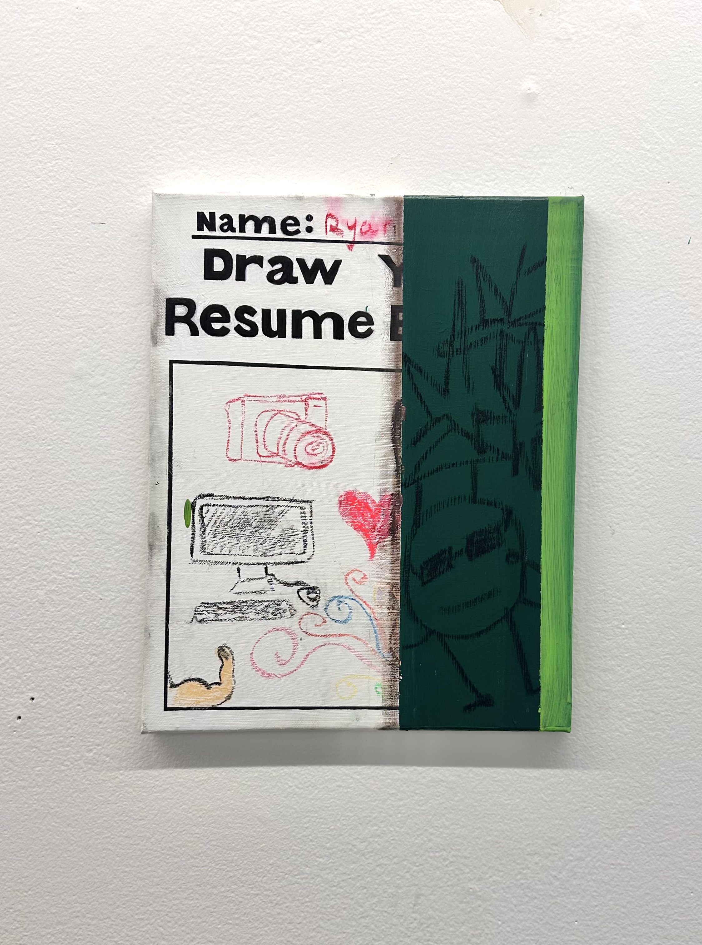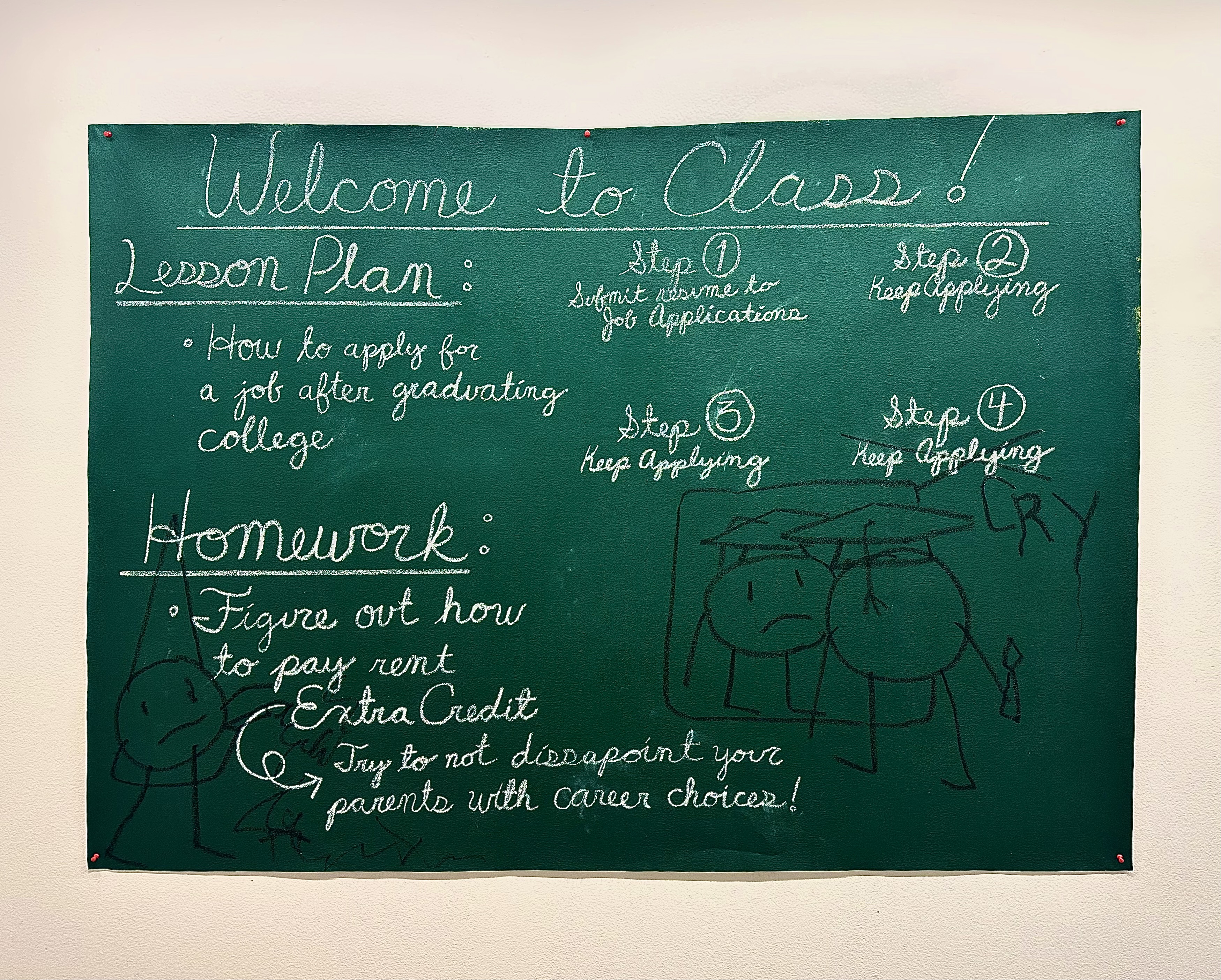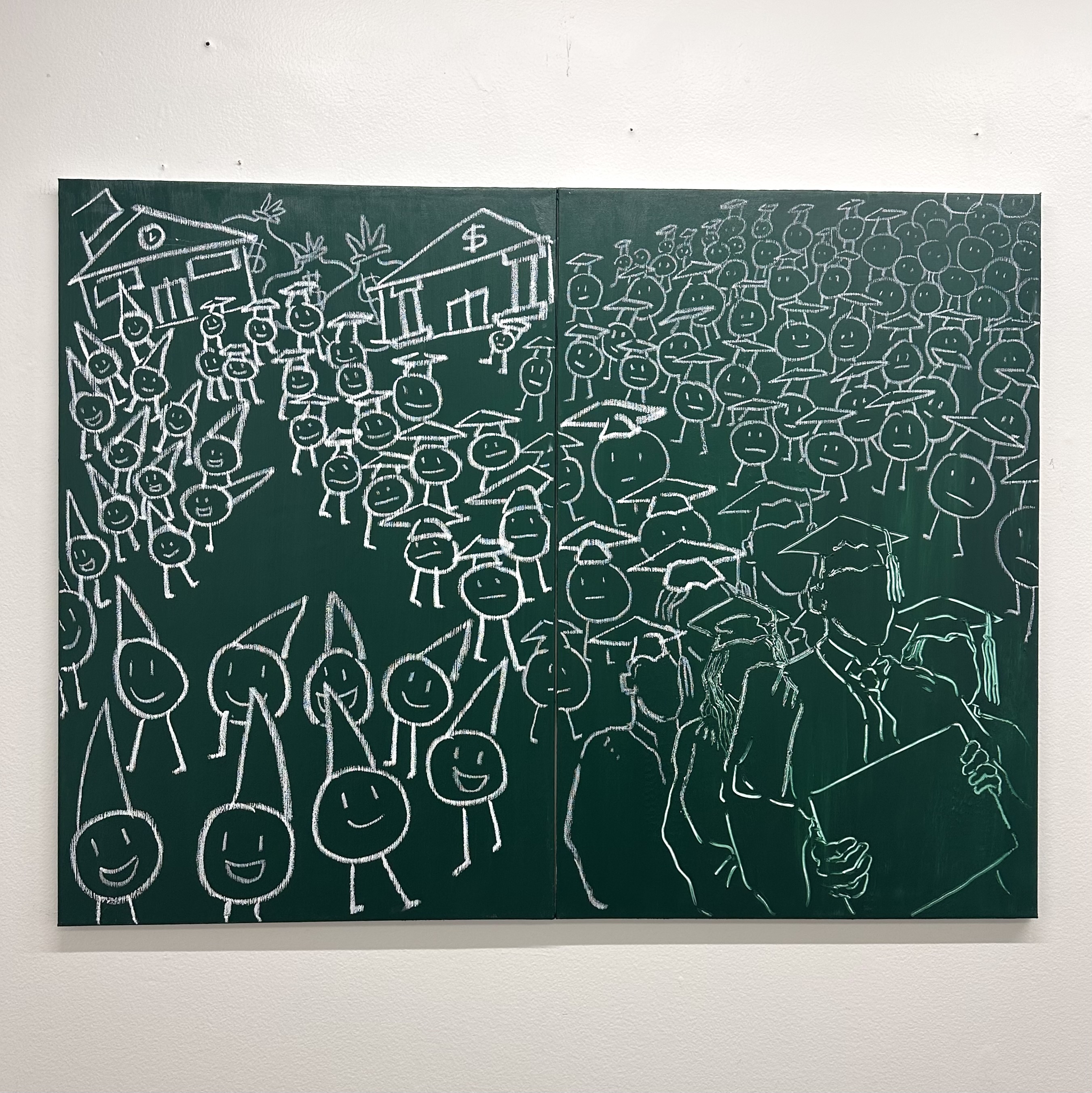 Lesson Plan, 2025 Acrylic paint, chalk, oil stick on un-stretched canvas 50 x 66 in / Detention, 2025 Acrylic paint, chalk, oil stick on un-stretched canvas 50 x 66 in / Graduating Class of 2025, 2025 Acrylic paint, chalk, oil stick on canvas 18 x 18in / Learning is Hard, 2025 Acrylic paint, chalk, oil stick on canvas 10 x 10 in / Teacher’s Copy, 2025 Acrylic paint, chalk, oil stick on canvas 36 x 24 in / Student Work, 2025 Acrylic paint, chalk, oil stick on canvas 11 x 8 in