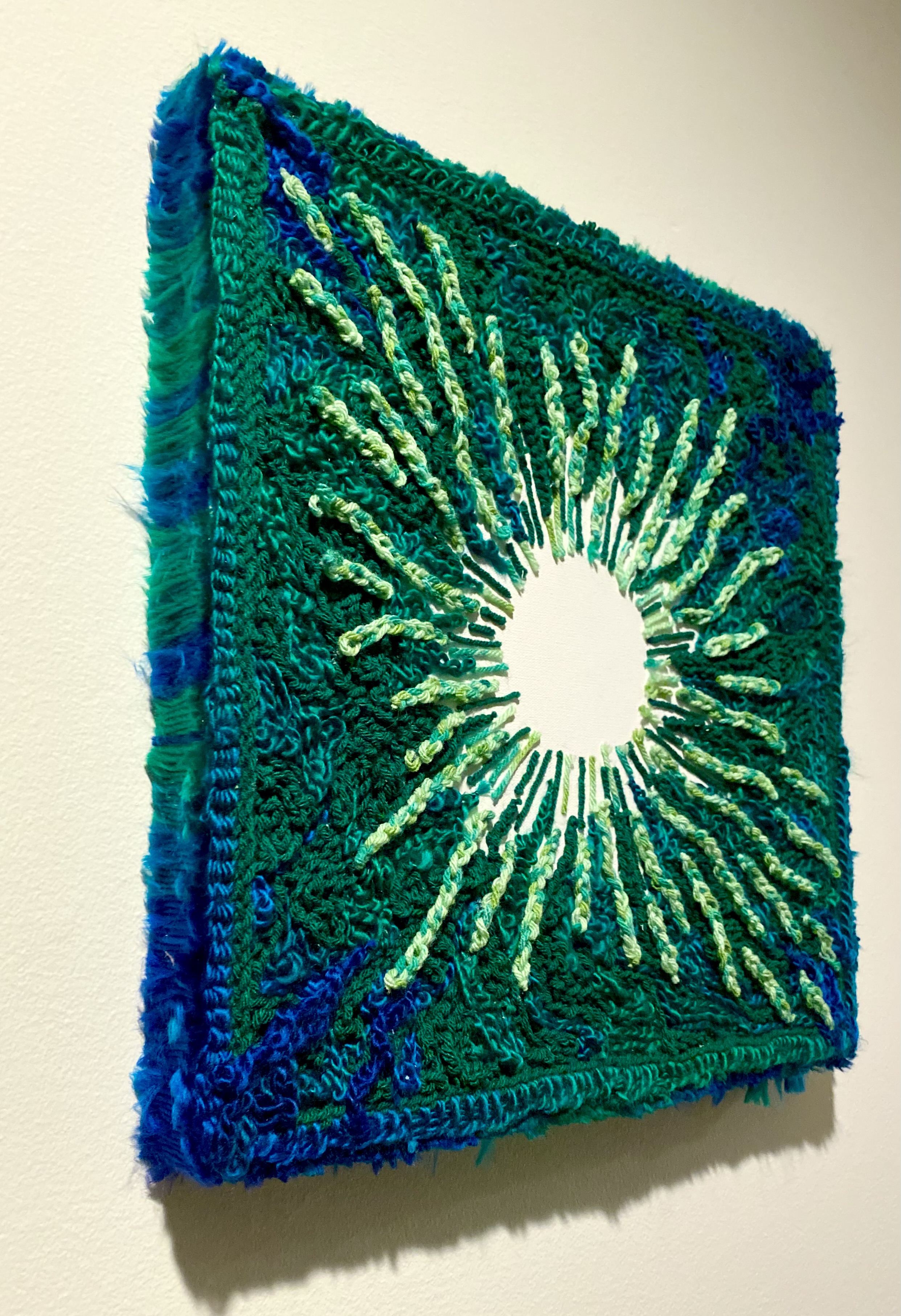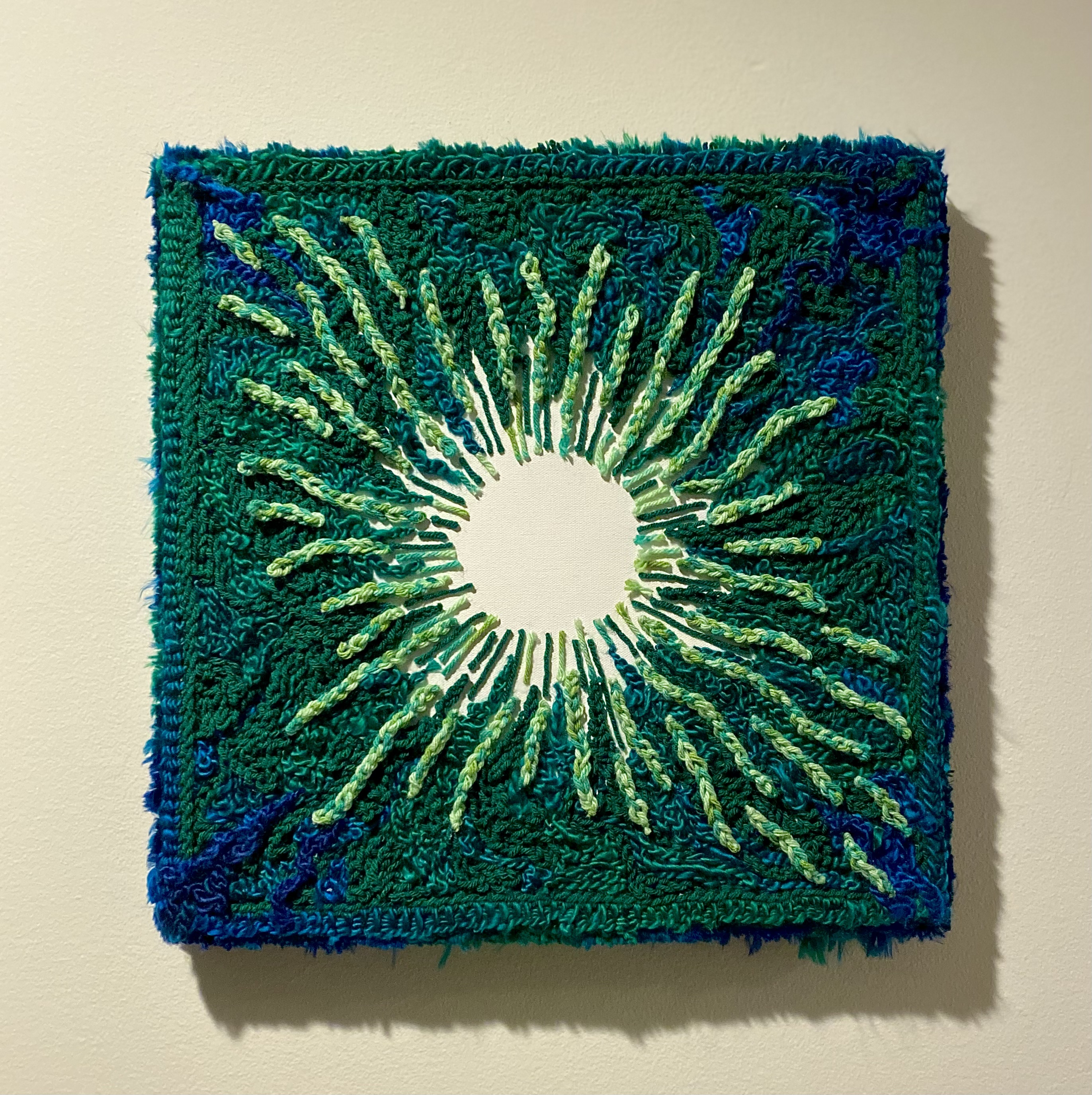 Untitled 3, 2023, Blue, green, and yellow crochet yarn on canvas, 18 x 18 in.