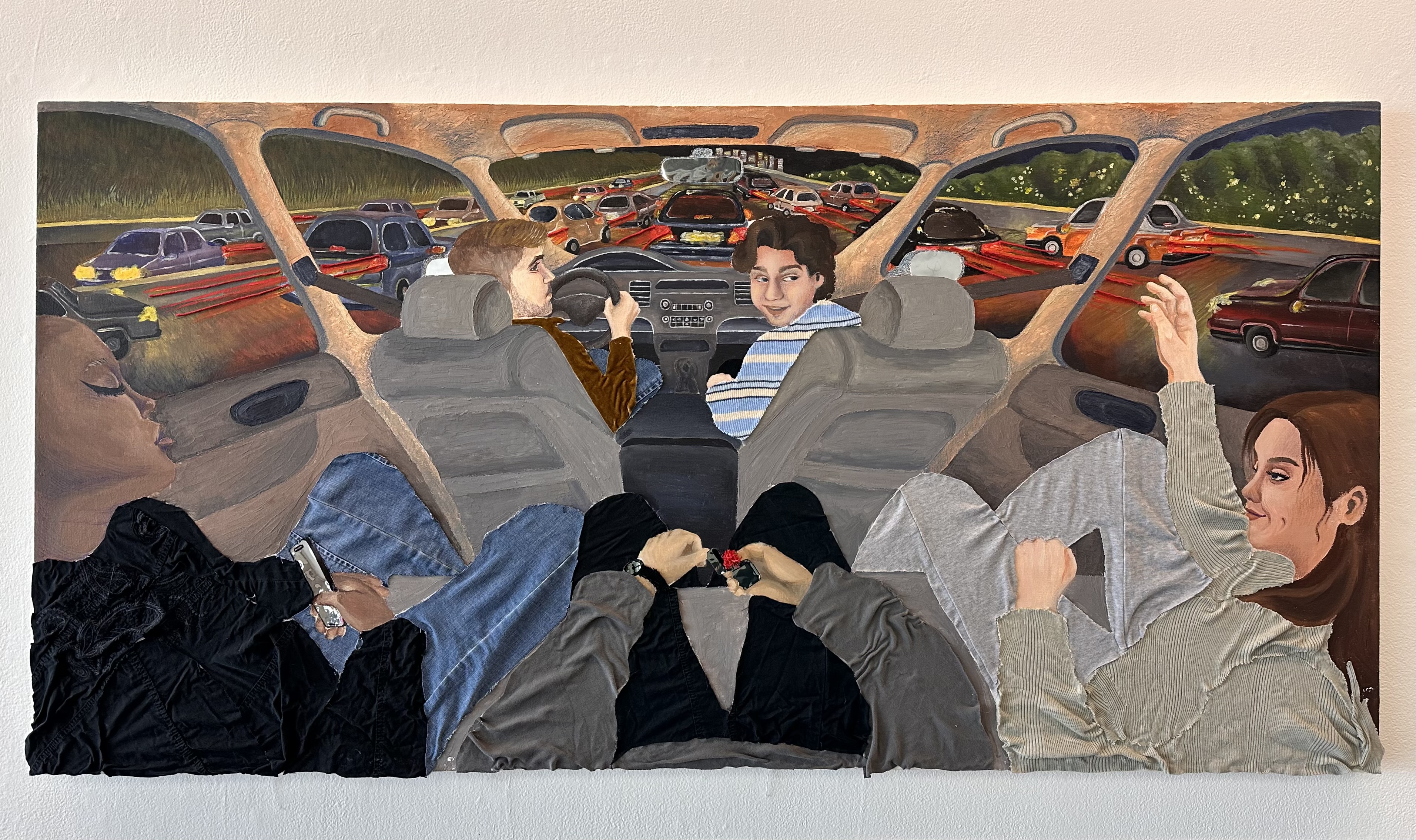 Taking a drive, 2024 Acrylic, fabric, yarn, and colored pencil on canvas 36 x 72 in