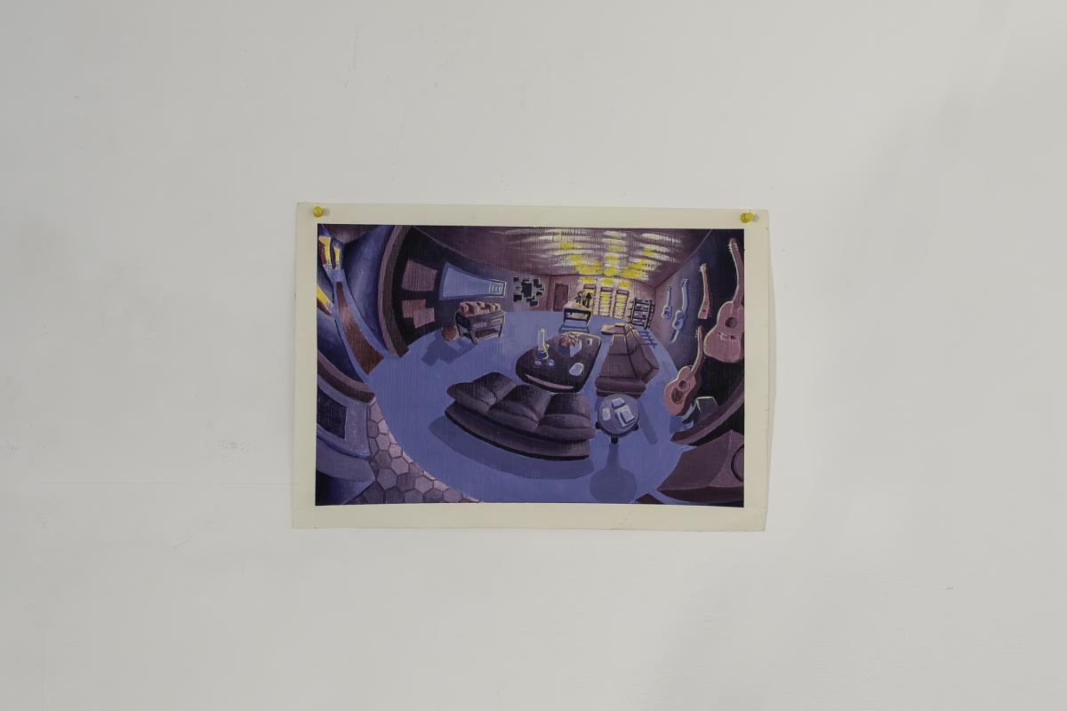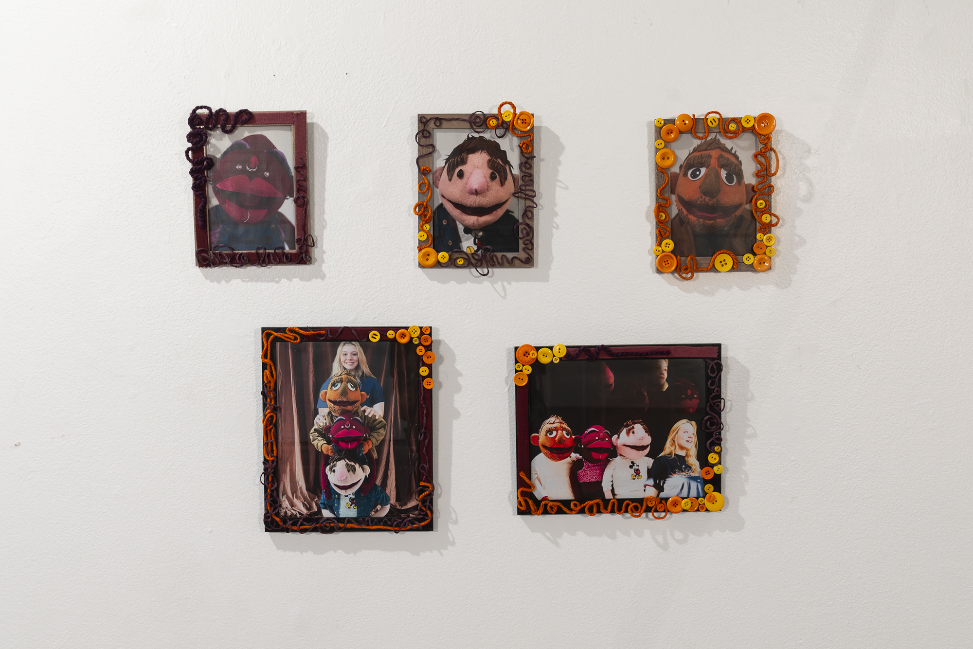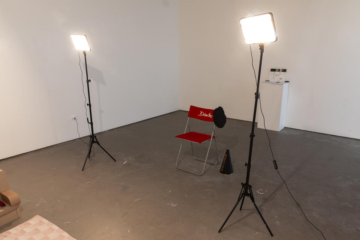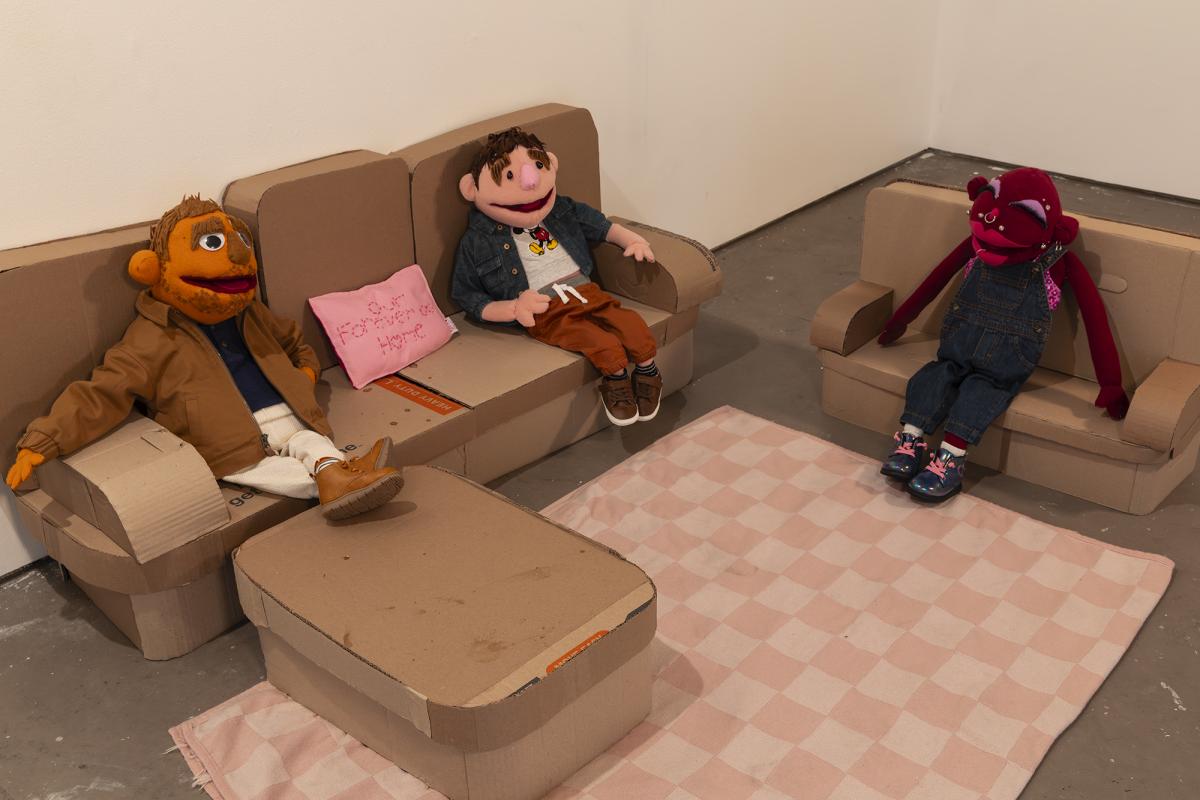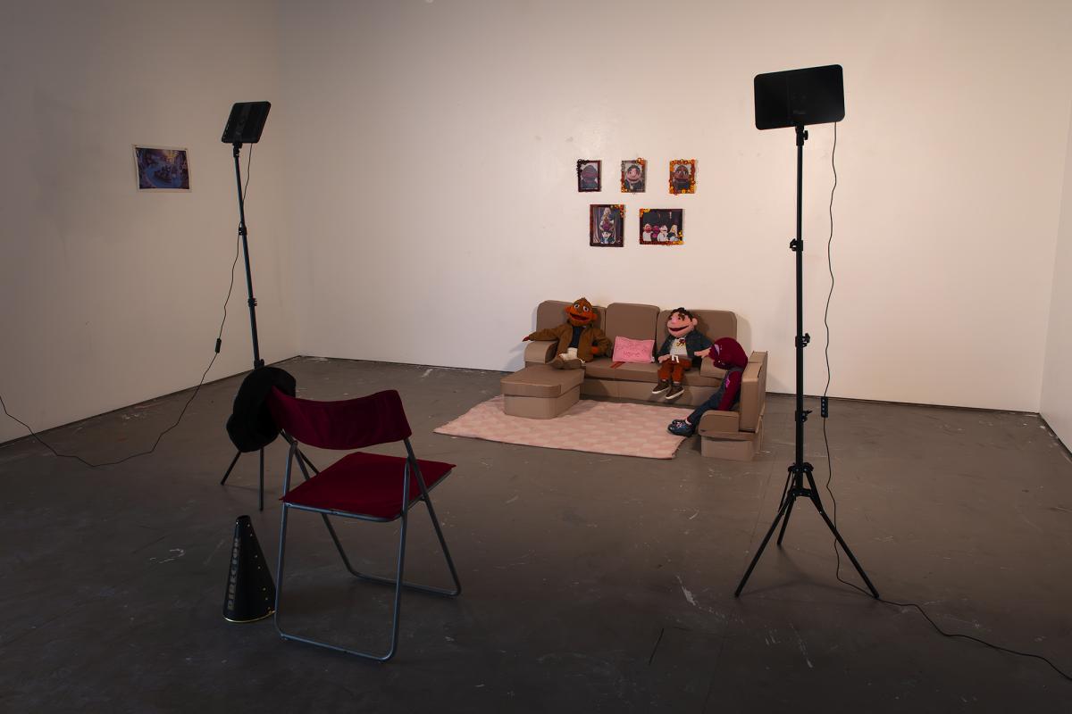 The Apartment, 2024, is an installation that recreates an apartment living room using cardboard and puppetry. On one side of the room, three puppets that are ⅓ life size sit on miniature cardboard furniture. On the opposite side of the room a directors chair and stage lights face the living room scene.