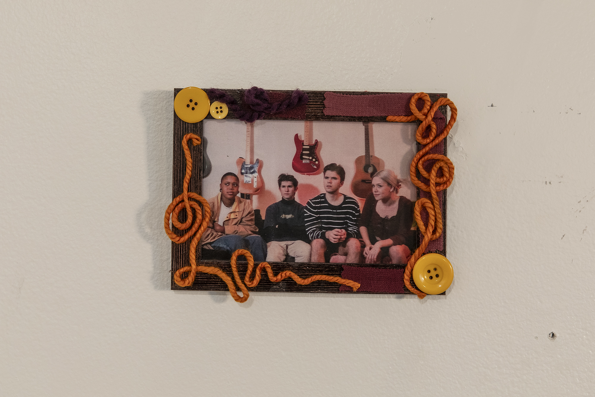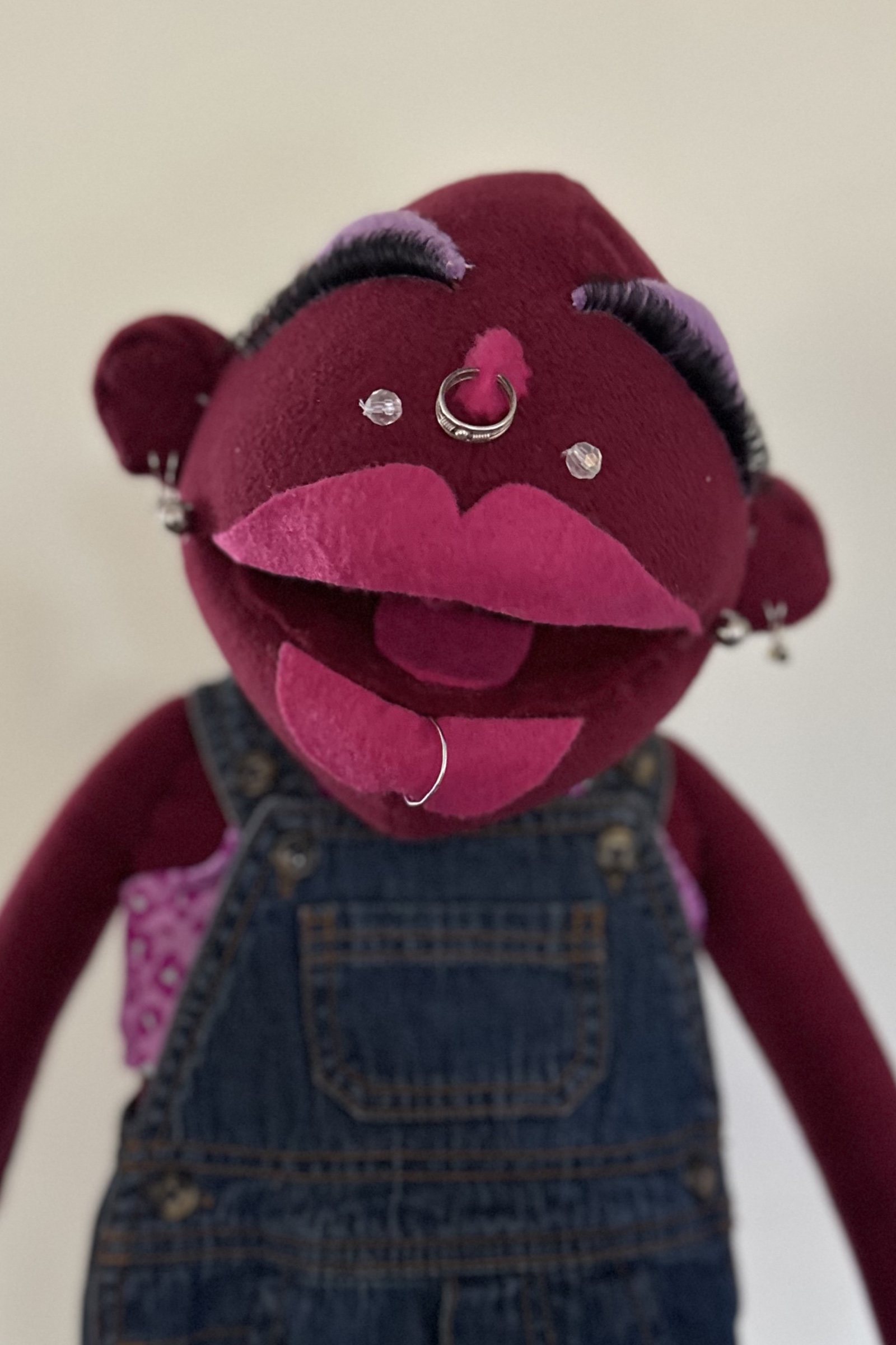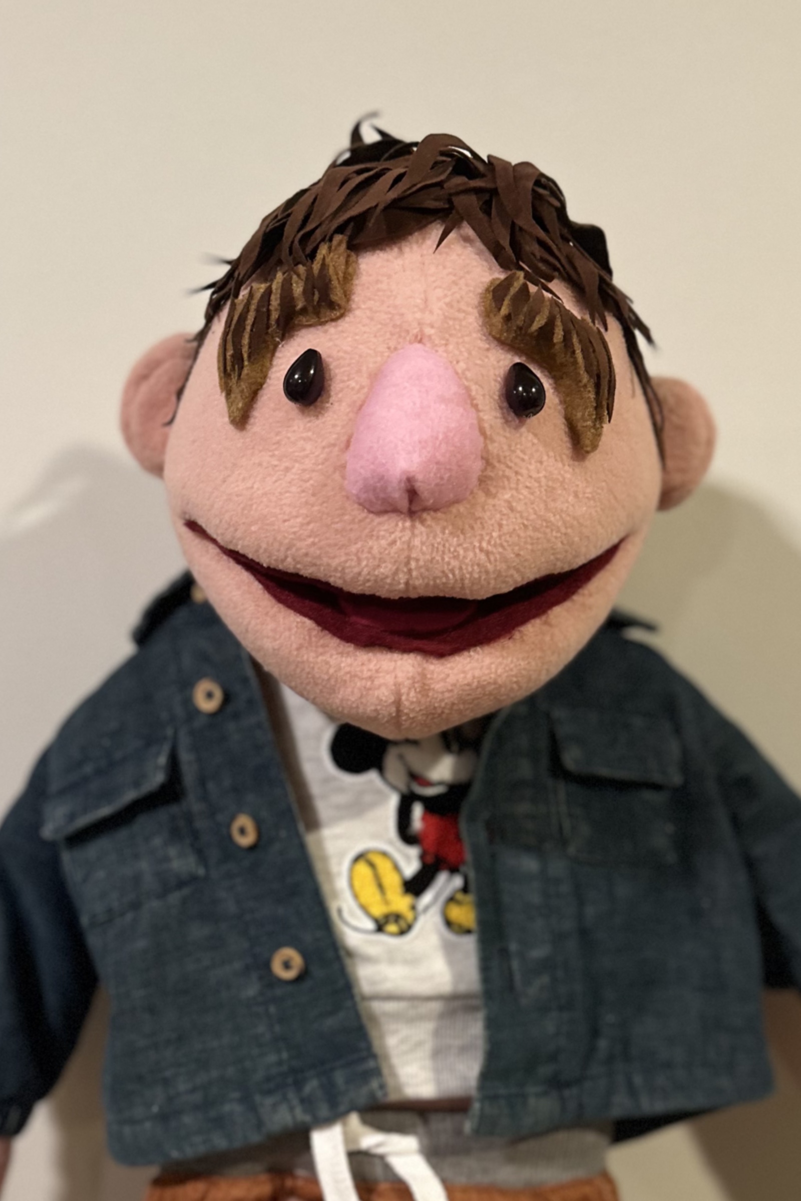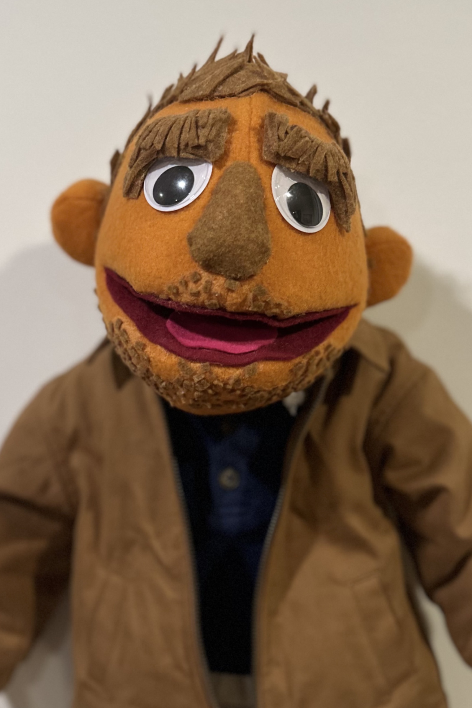 The Apartment, 2024, is an installation that recreates an apartment living room using cardboard and puppetry. On one side of the room, three puppets that are ⅓ life size sit on miniature cardboard furniture. On the opposite side of the room a directors chair and stage lights face the living room scene.