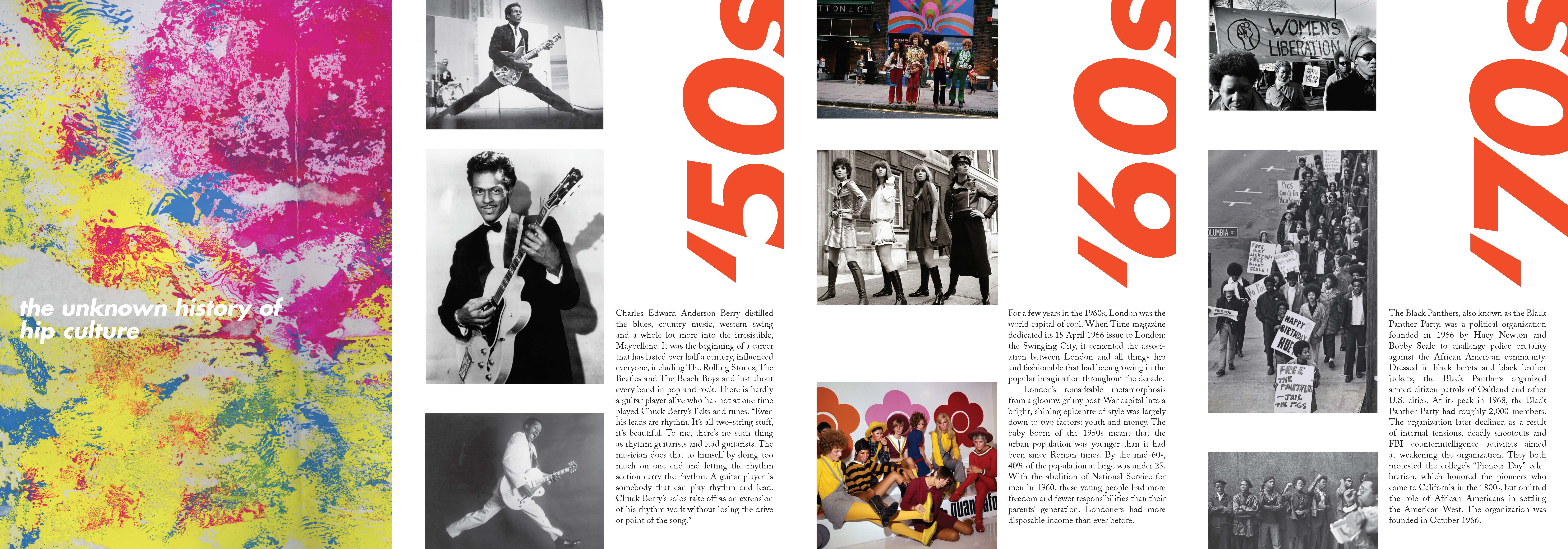 Created for a conceptual exhibition at LACMA, this brochure introduces the history of Hip Culture through the decades. The cover is a combination of mini "John Baldessari(s)” taken from his video piece, “I am Making Art” and colors inspired by psychedelic art. It carries the meaning of Baldessari’s satire of performance art and the modernist notion that anything can be considered art.