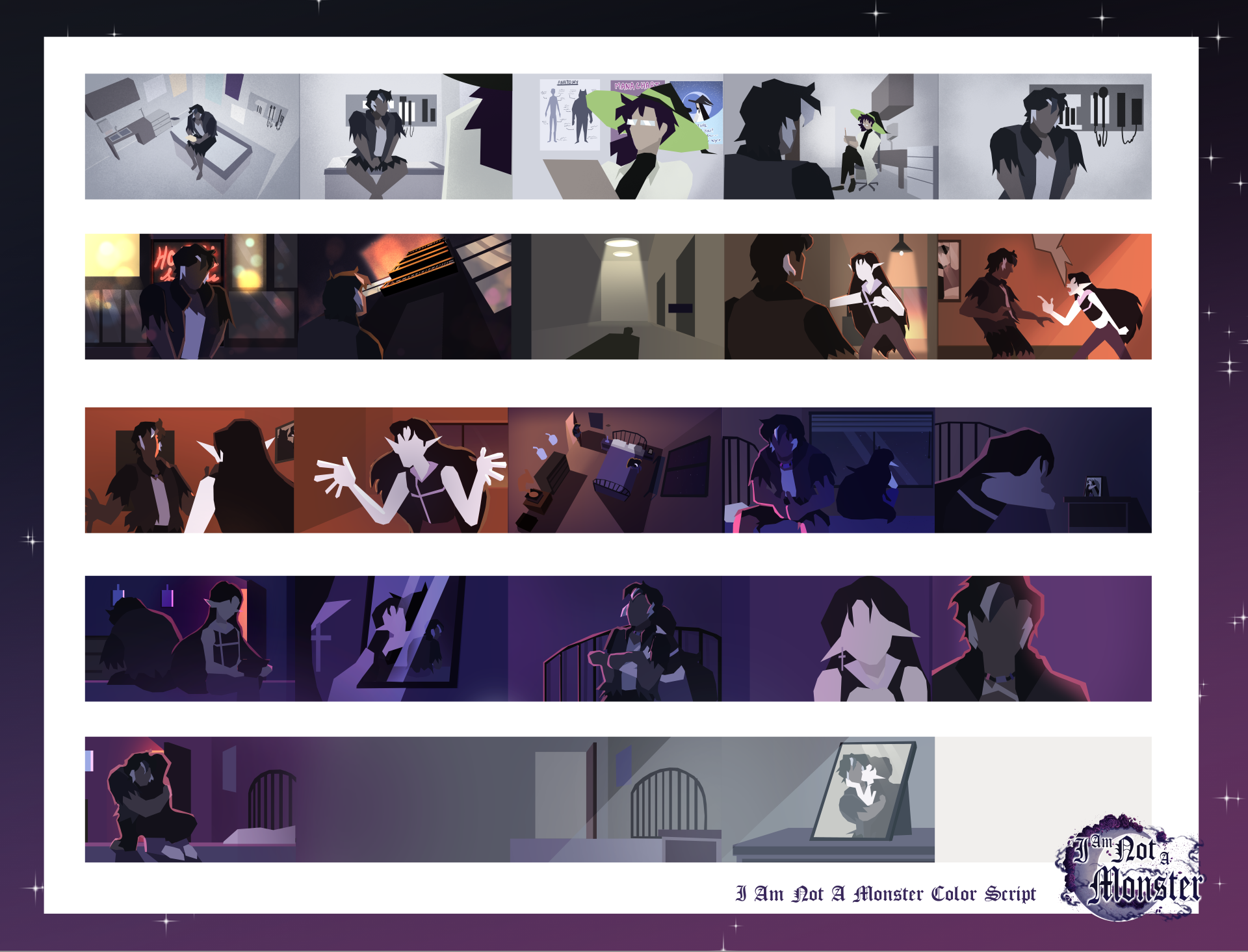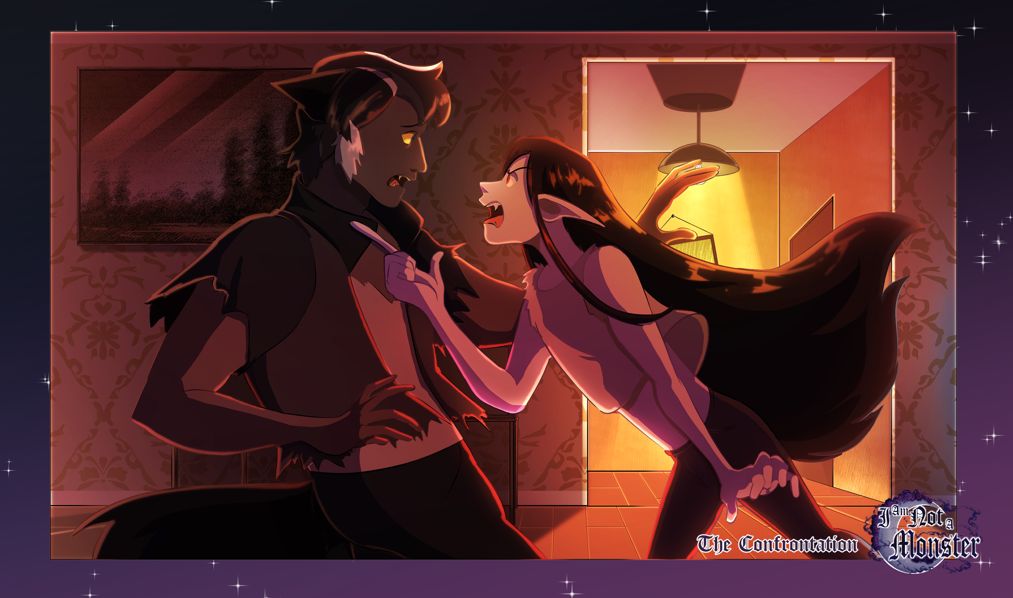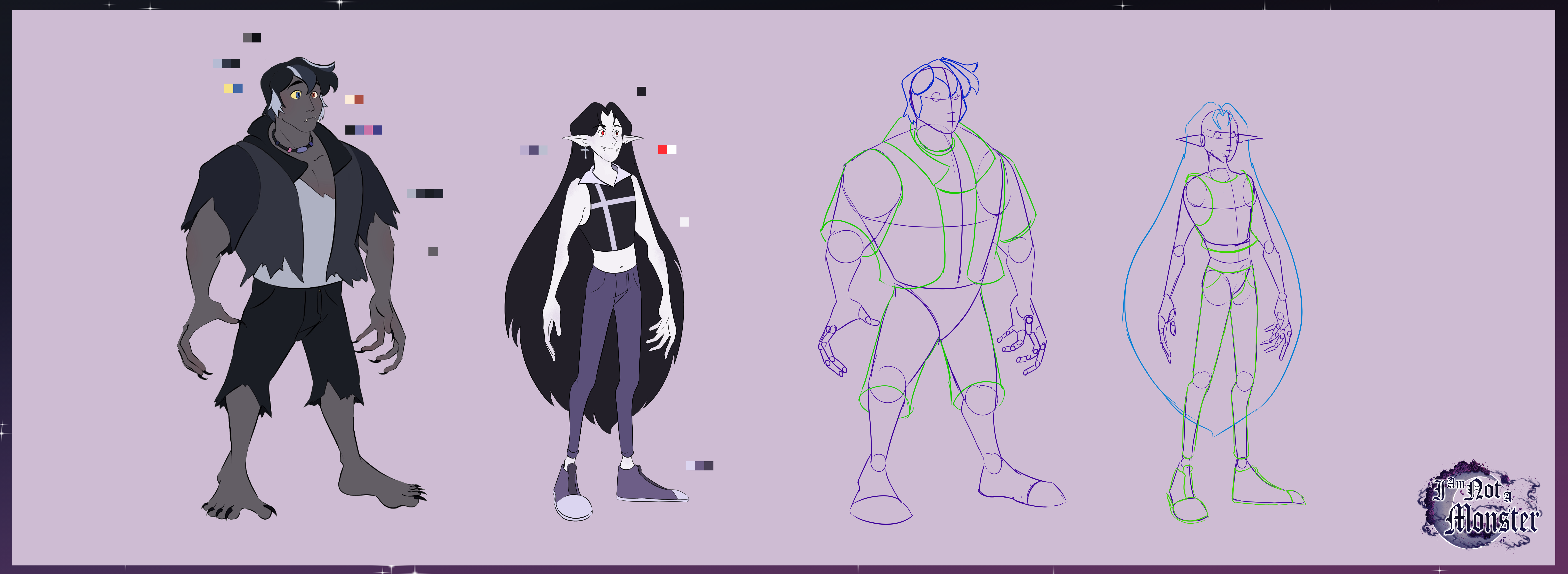 Visual Development portfolio for a series called "I Am Not A Monster," a story centering around Monty the werewolf and Vince the Vampire, and how they learn to navigate their relationship in a world prejudice against monsters. Done in Adobe Photoshop and Clip Studio Paint.