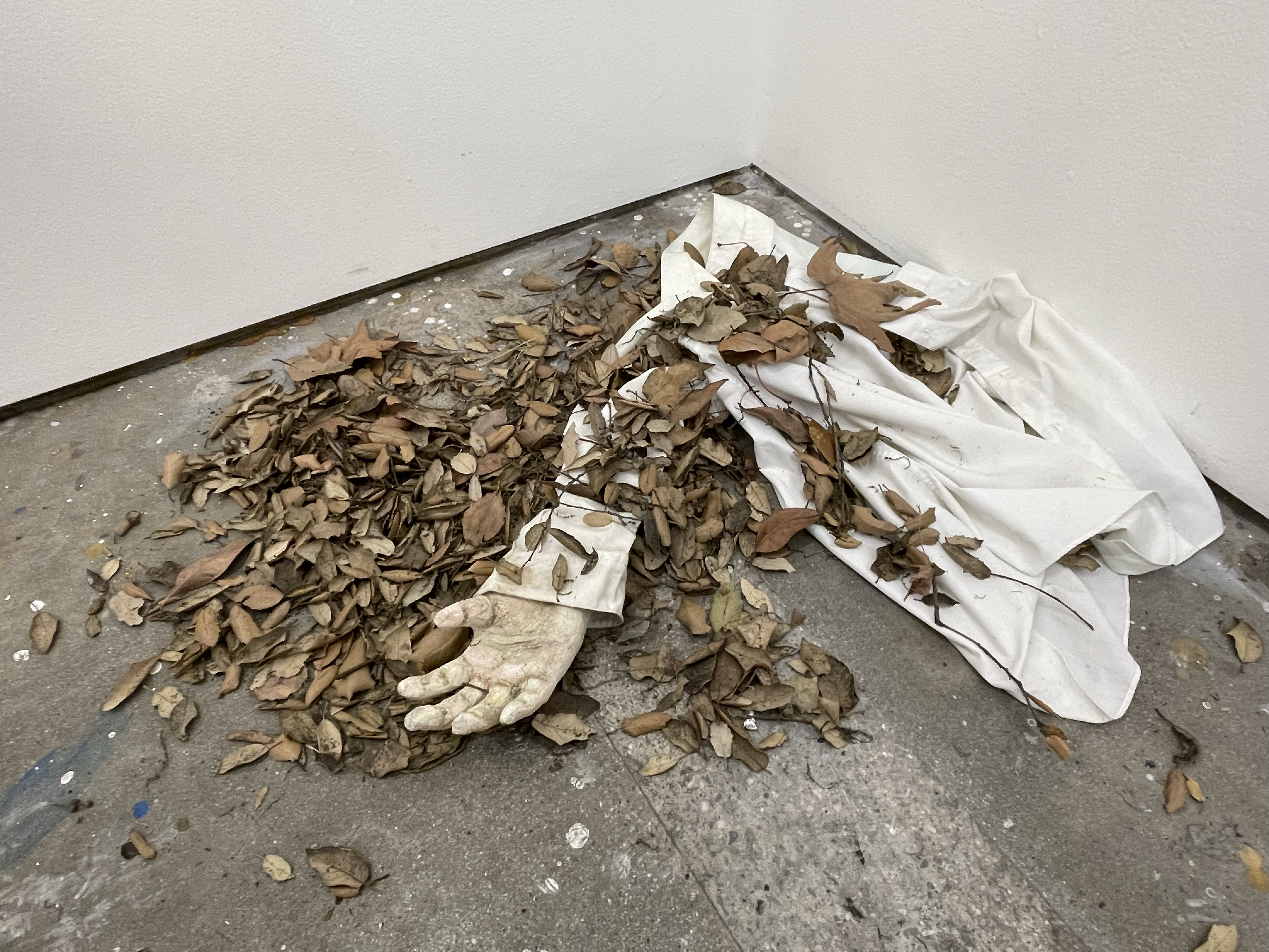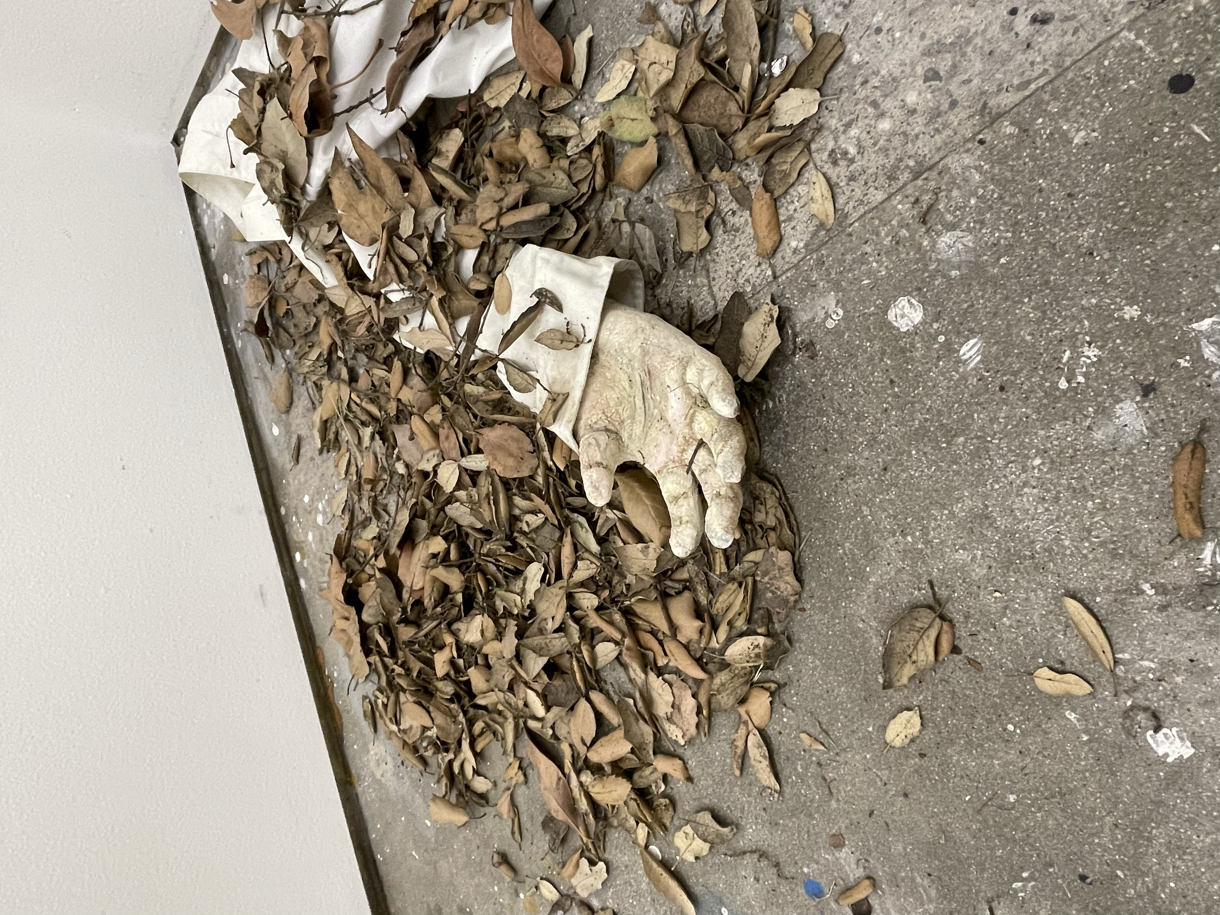 A sculpture installation made from paper clay and foliage. A view of a decaying dismembered body. The state it is in brings up questions with the viewer wondering why the state of the body is in and how peaceful the death feels as there's no blood or signs of 'struggle' almost like the acceptance of being dead.