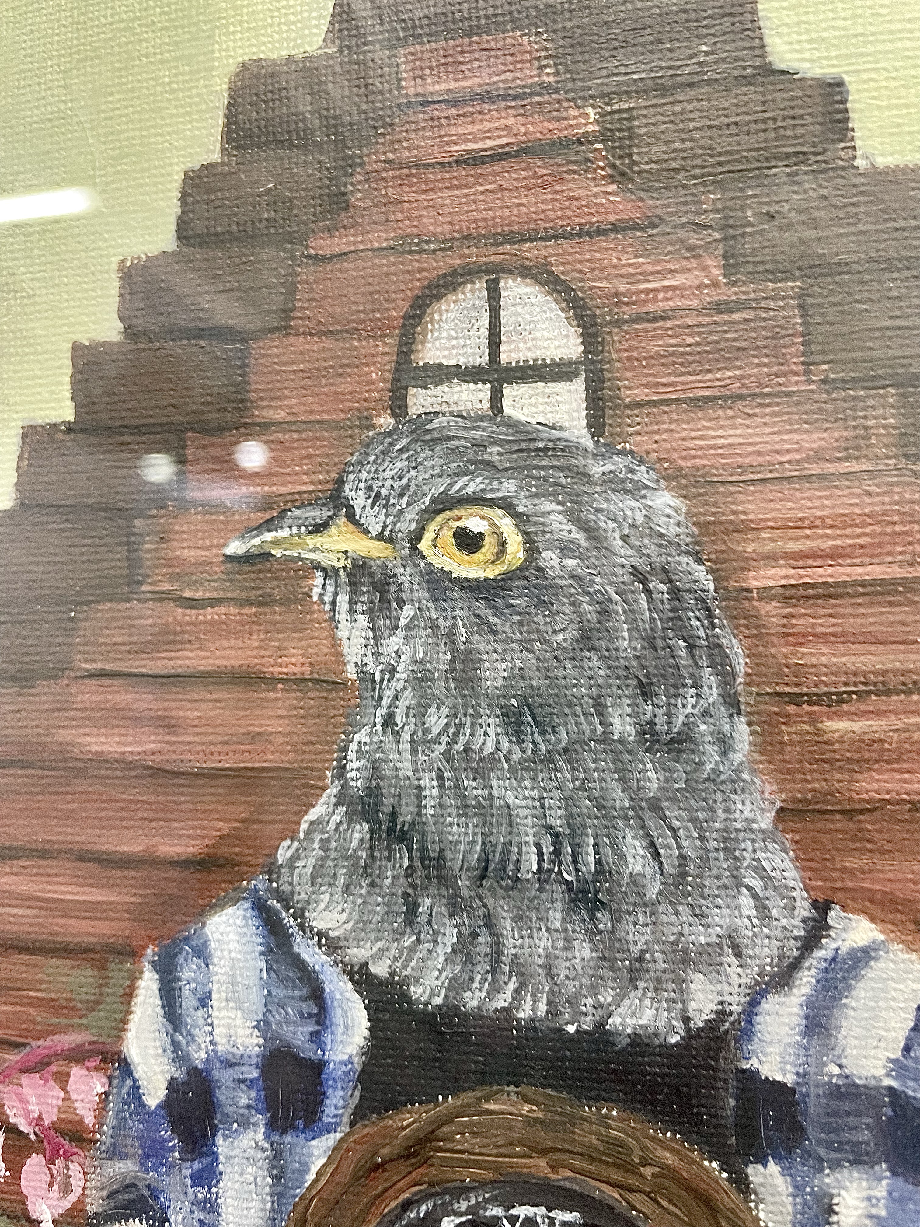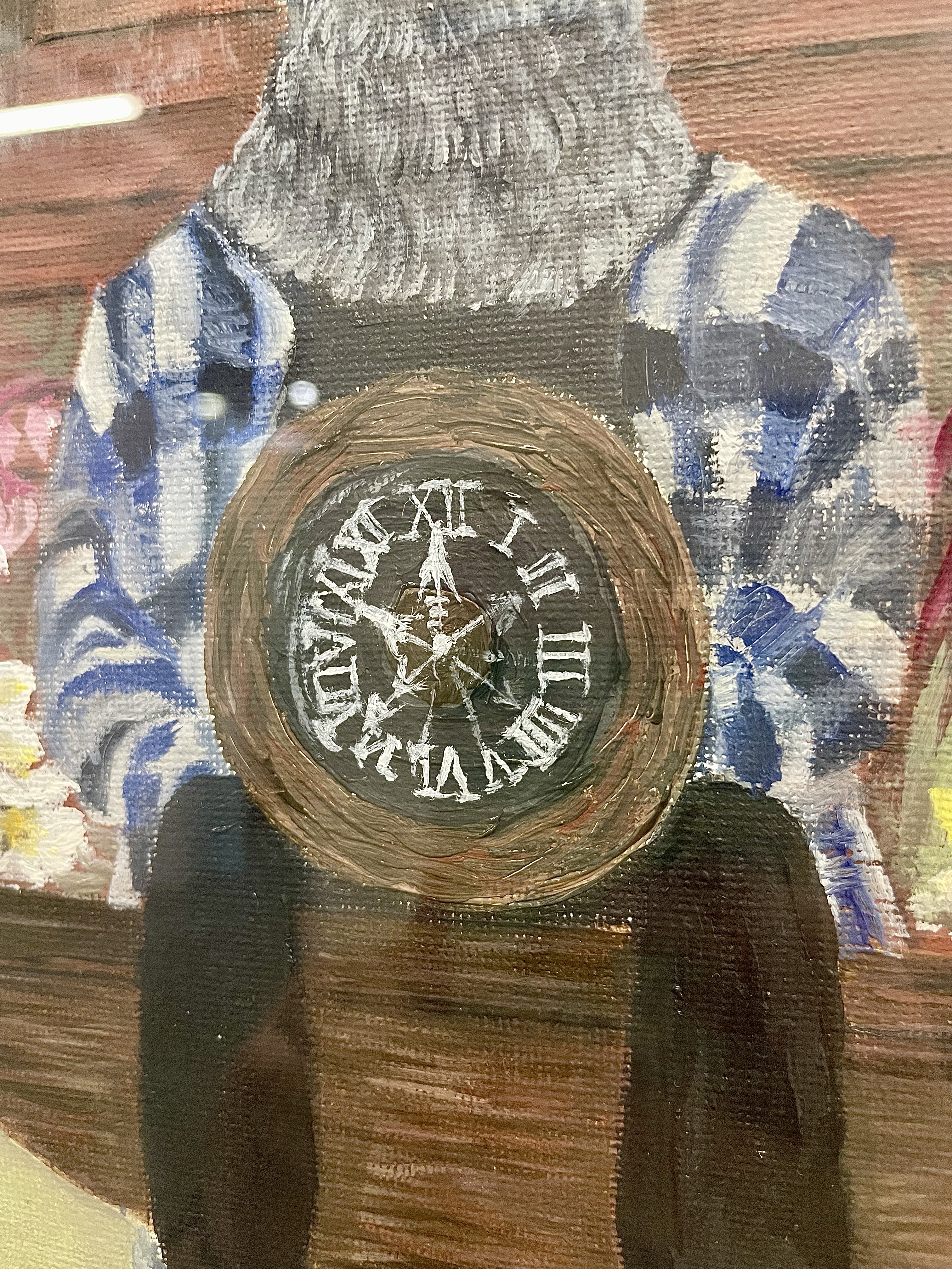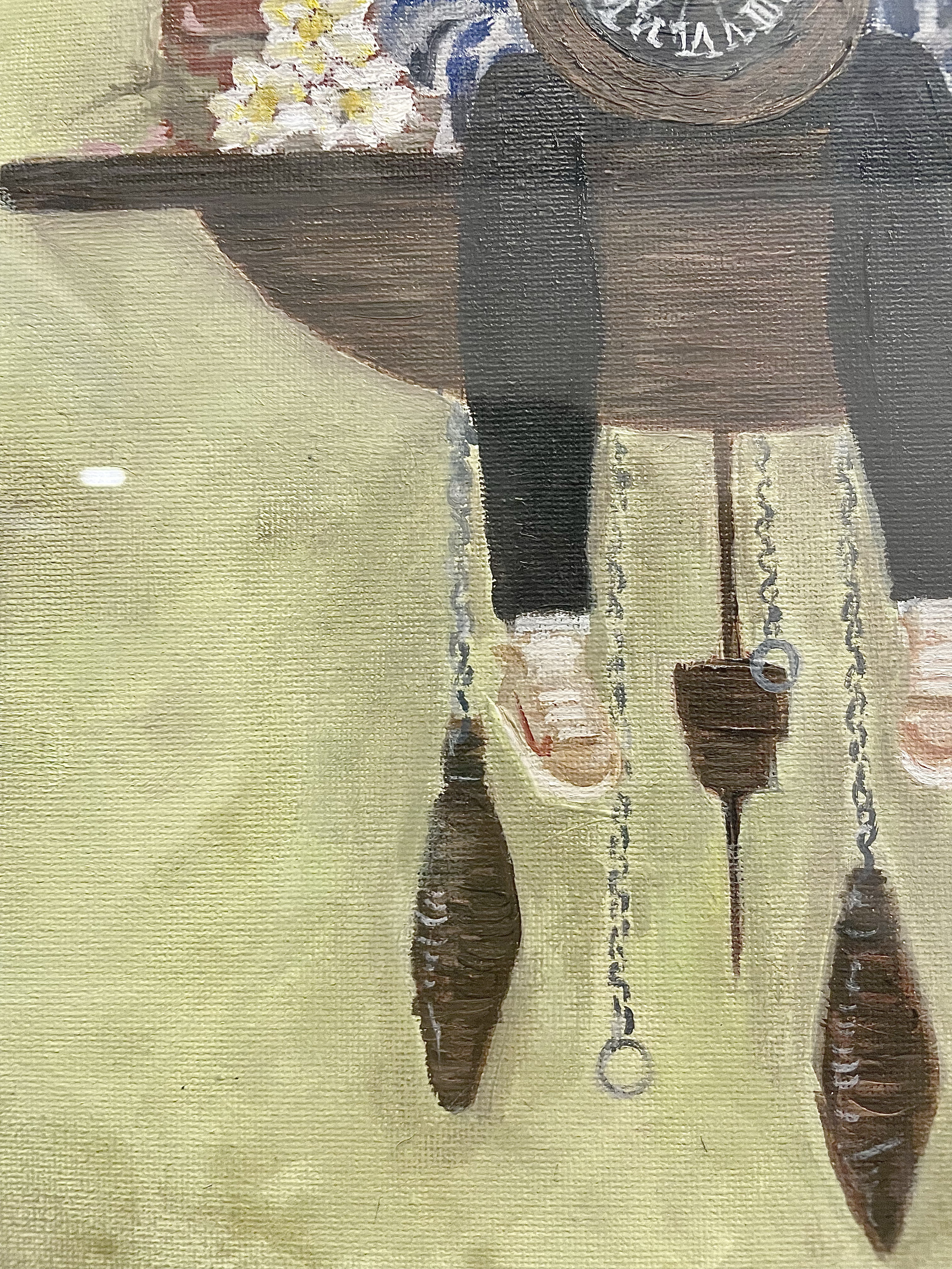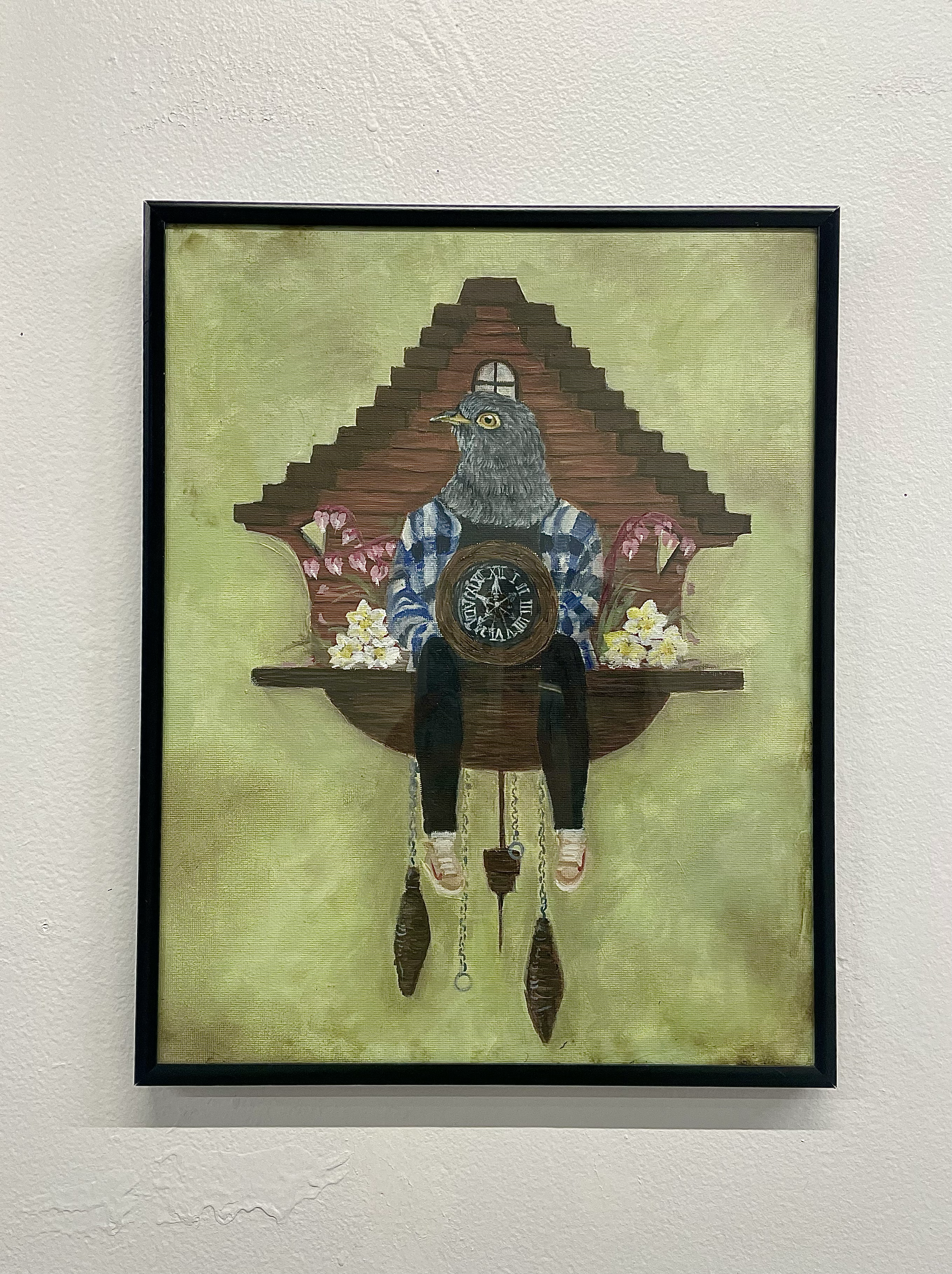 'Going Cuckoo' is a self-portrait representing the feeling of being constantly stuck in life; time is moving but at the same time, it isn't. The oil painting contains various motifs such as the cuckoo clock, bleeding hearts, daffodils, the European Common Cuckoo etc; every aspect has a symbolic meaning behind it. The 14" x 11" oil painting is contained behind a glass frame.