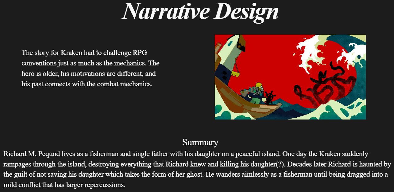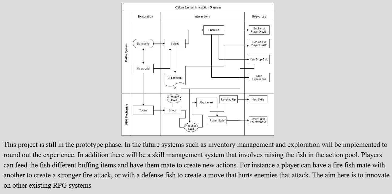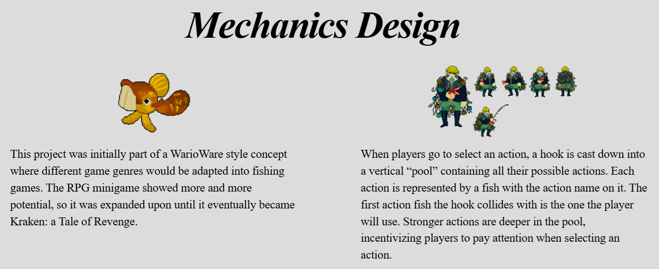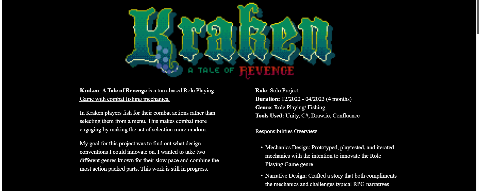 Kraken: A Tale of Revenge is a turn-based Role Playing Game with combat fishing mechanics. In Kraken players fish for their combat actions rather than selecting them from a menu. This makes combat more engaging by making the act of selection more random. My goal for this project was to find out what design conventions I could innovate on. I wanted to take two different genres known for their slow pace and combine the most action packed parts. This work is still in progress.
