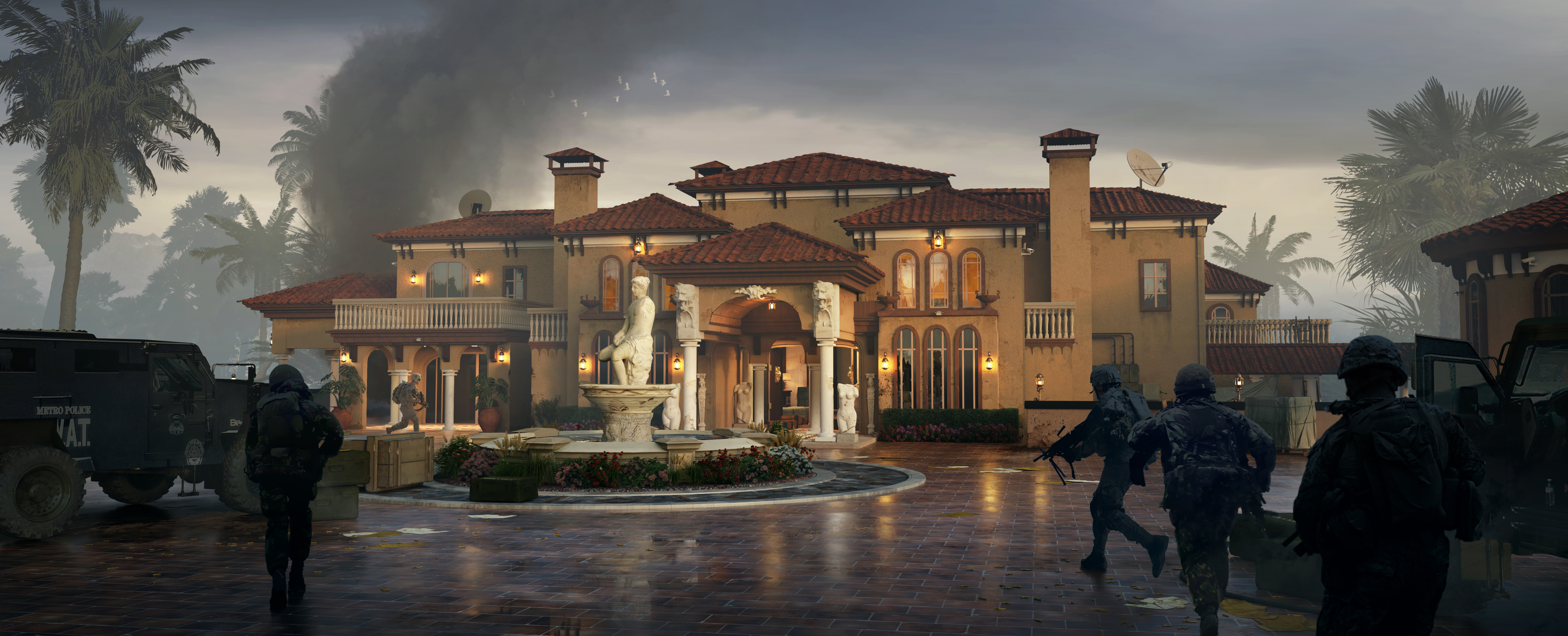 The mansion of a Spanish drug lord is raided by a SWAT Team. Establishing shot of the Gallardo Manor environment series.