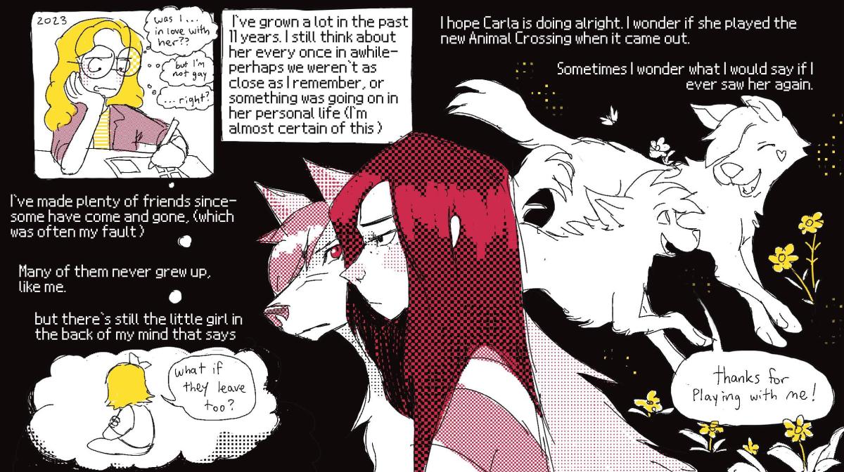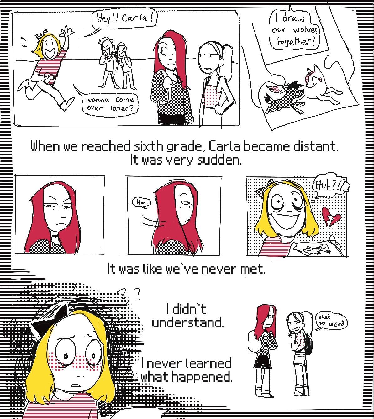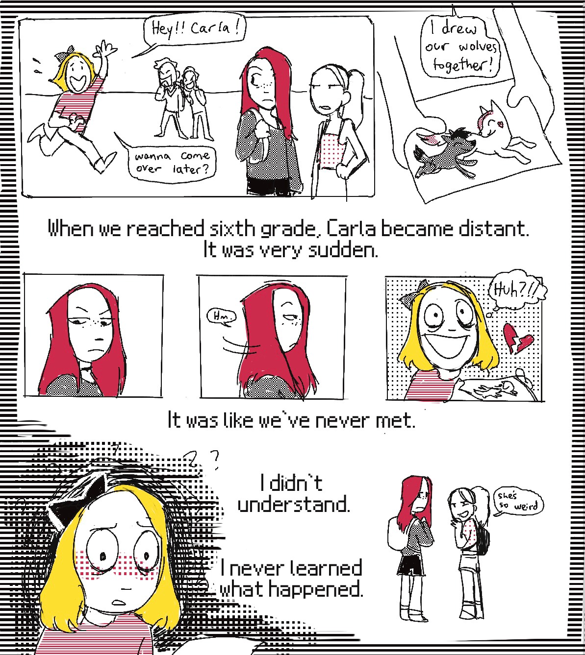 Originally printed as an eight- page zine, "Wolf Girls" is a personal comic book about childhood angst and a best friend breakup, shown through the eyes of a 5th grade girl who processes grief through drawing.