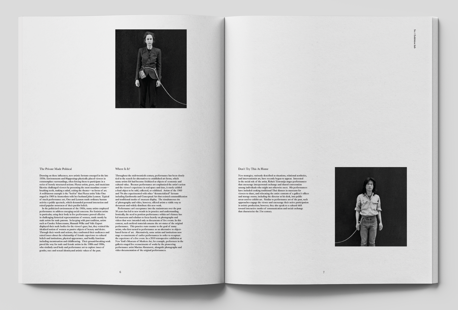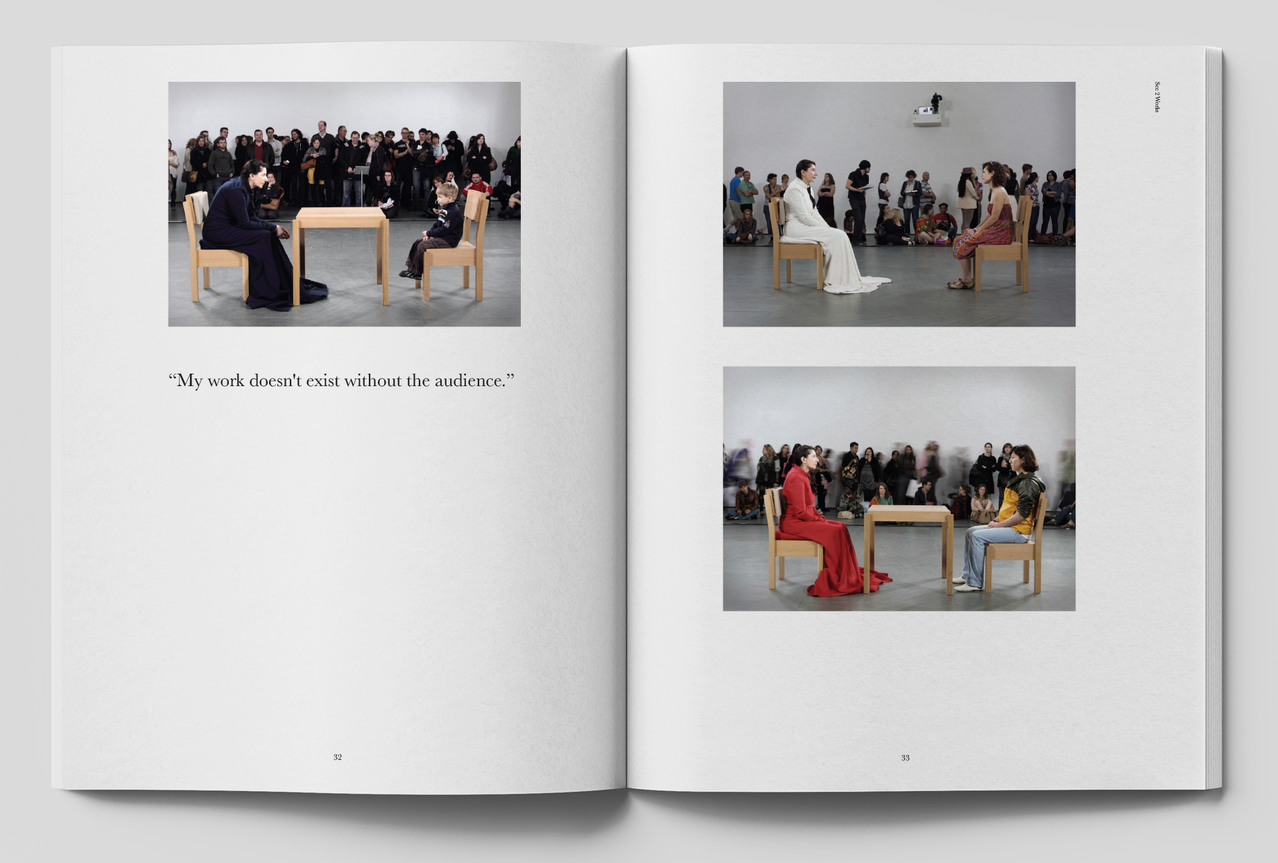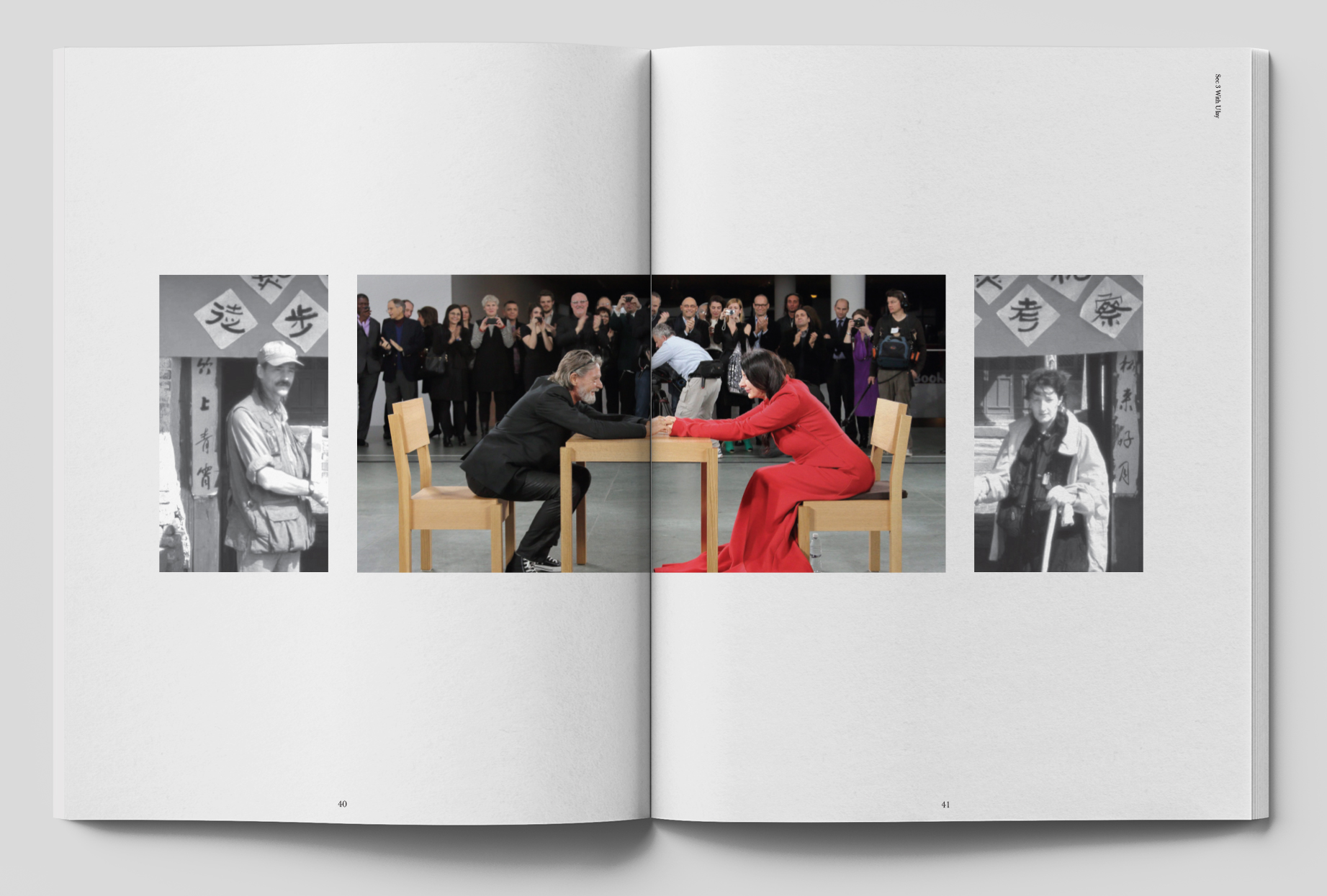 An exhibition catalog inspired by Marina Abramovic’s exhibition, “The Artist Is Present,” features multiple images cut into two parts and distributed across different pages to evoke an interactive sensation. Readers cannot find all the information on a single page; instead, they must link the corresponding parts together using their gaze.