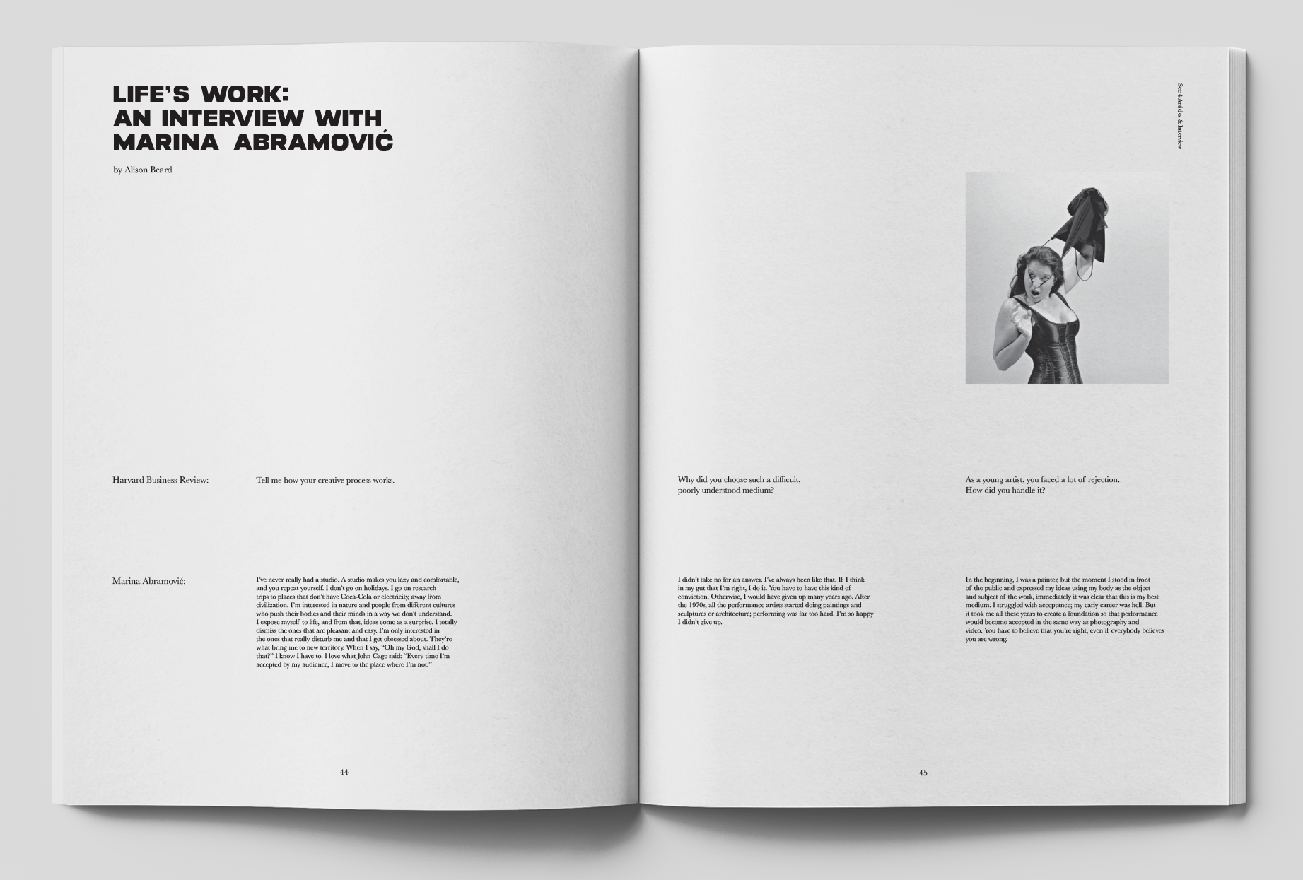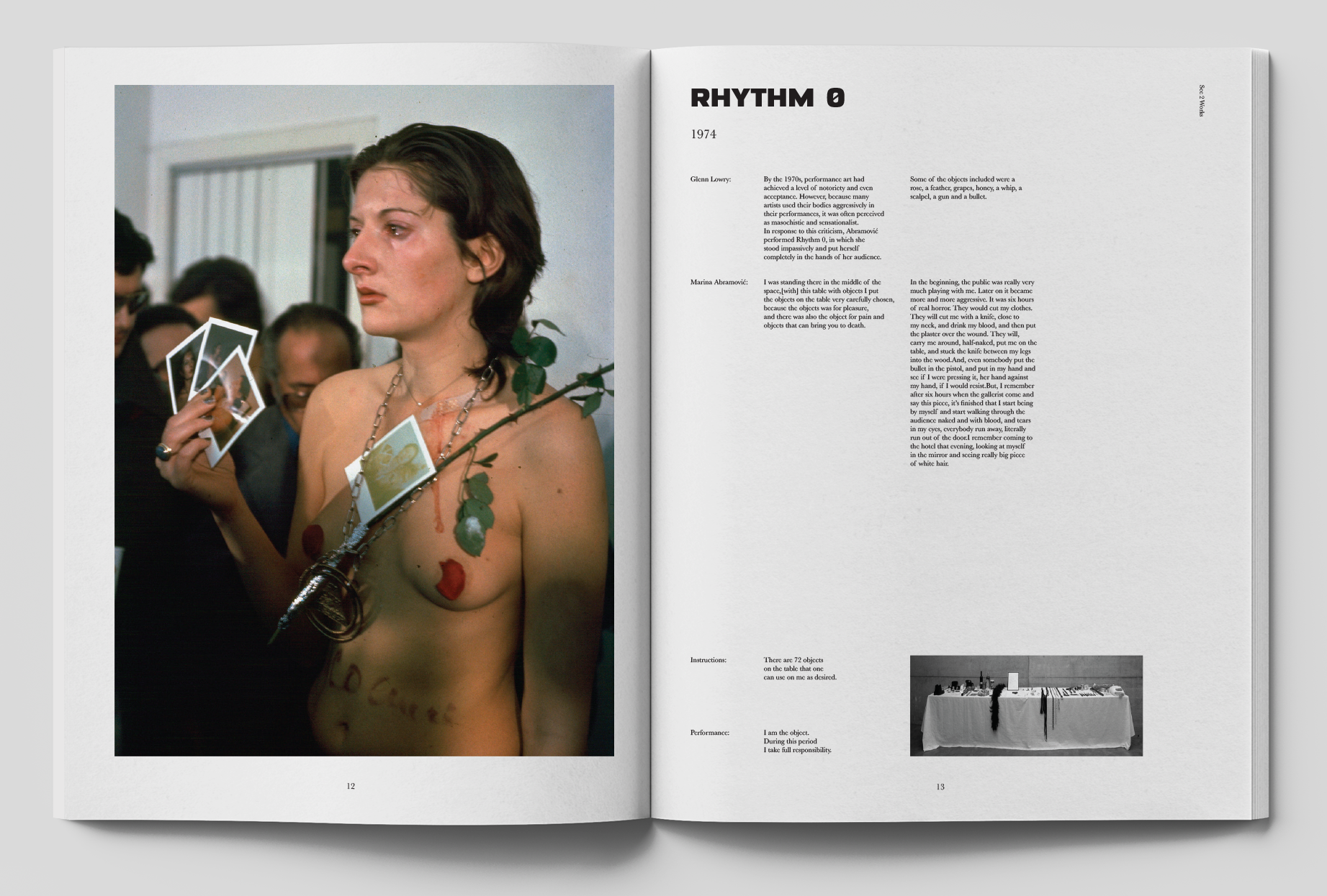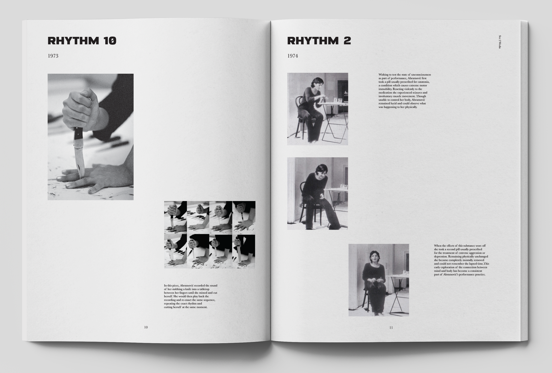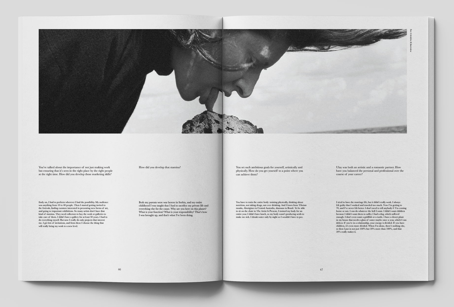 An exhibition catalog inspired by Marina Abramovic’s exhibition, “The Artist Is Present,” features multiple images cut into two parts and distributed across different pages to evoke an interactive sensation. Readers cannot find all the information on a single page; instead, they must link the corresponding parts together using their gaze.