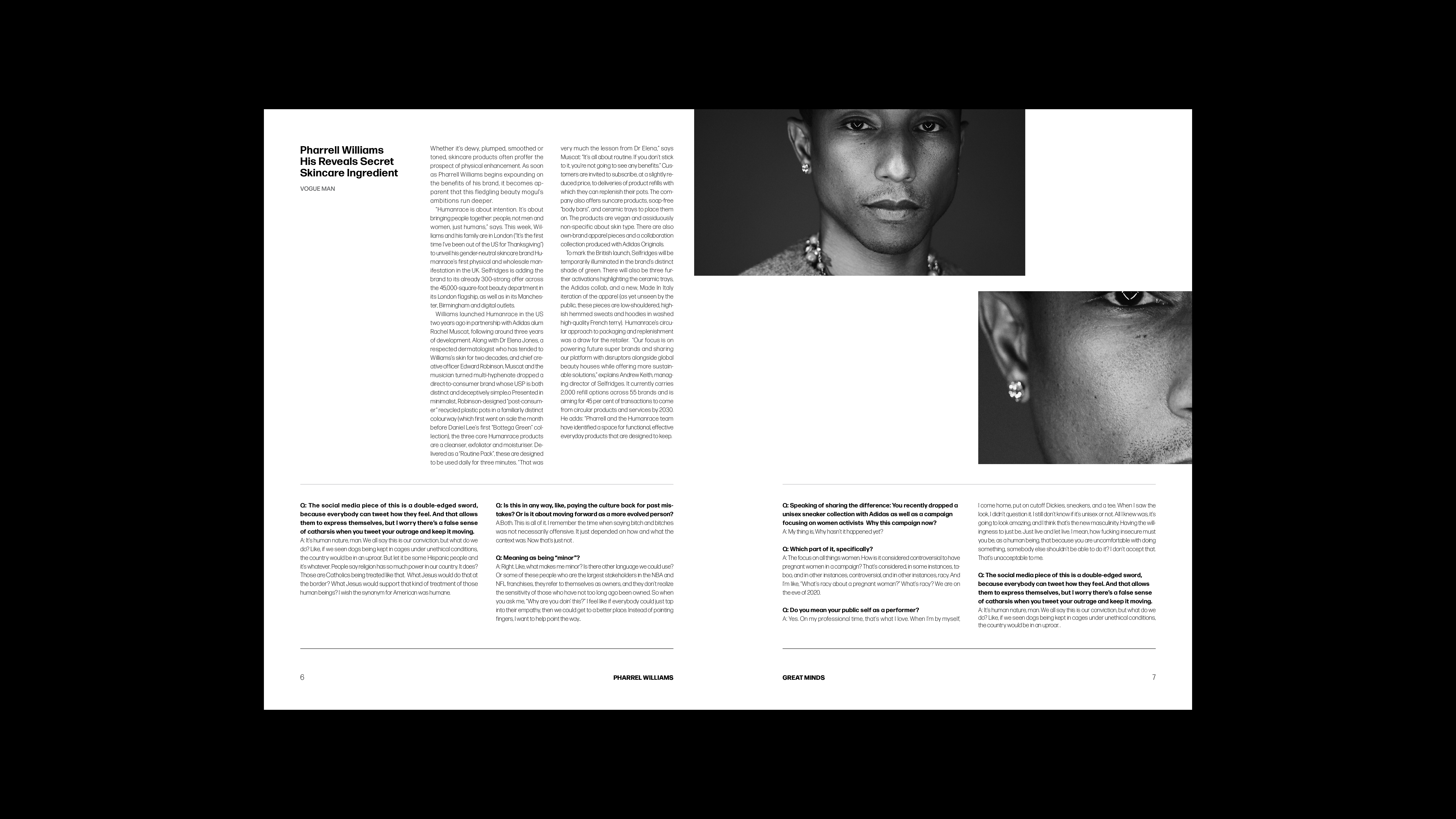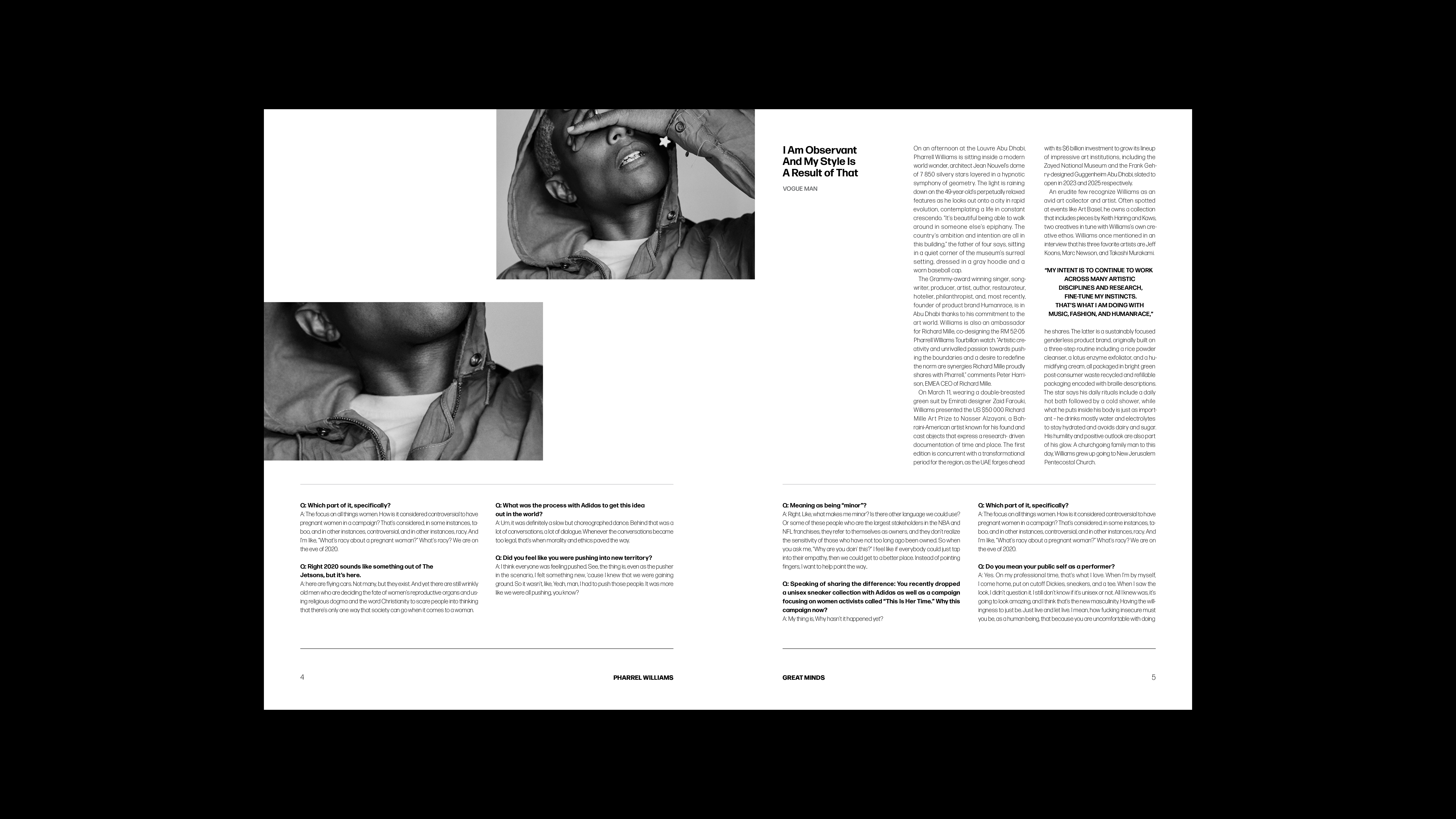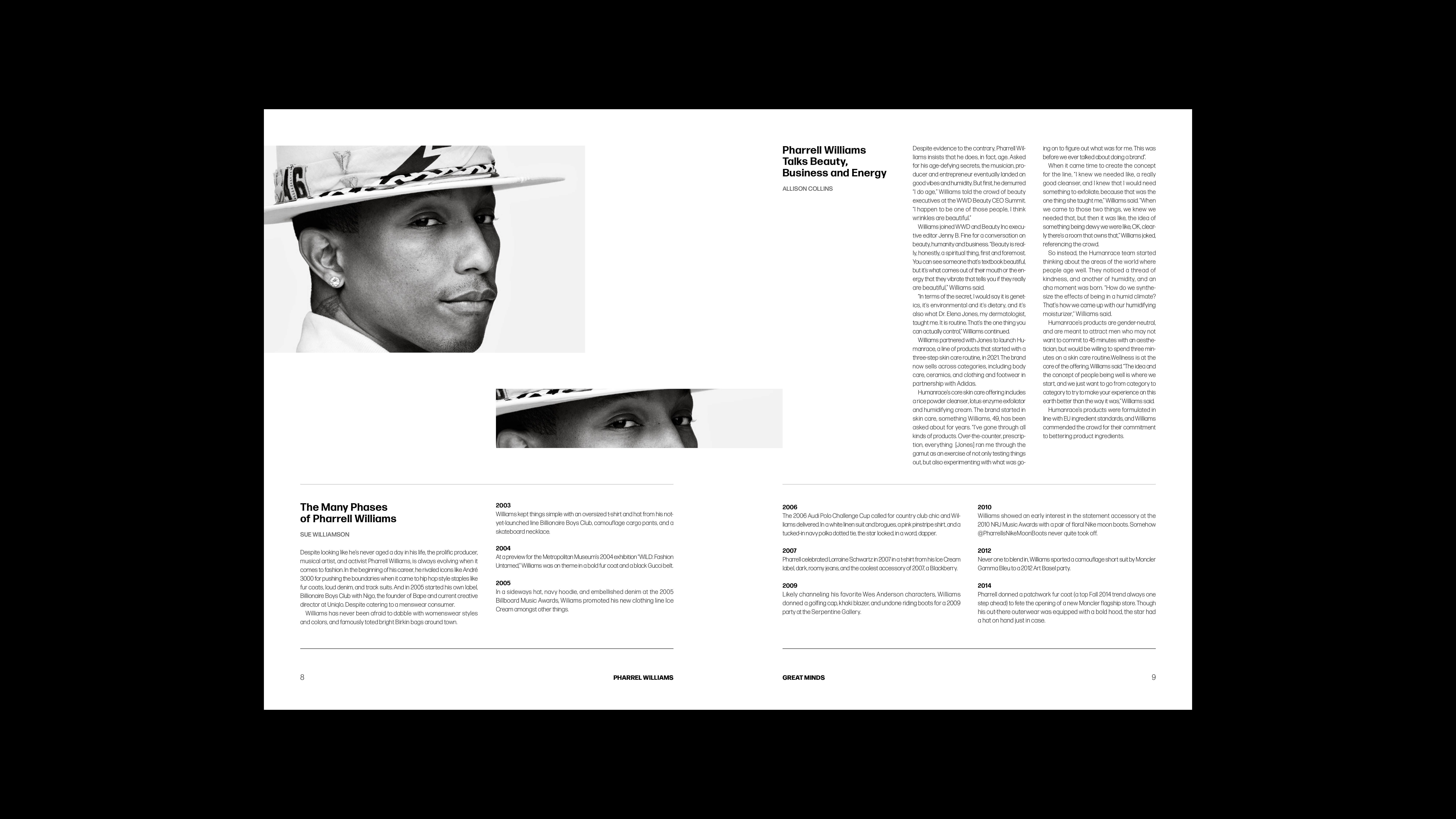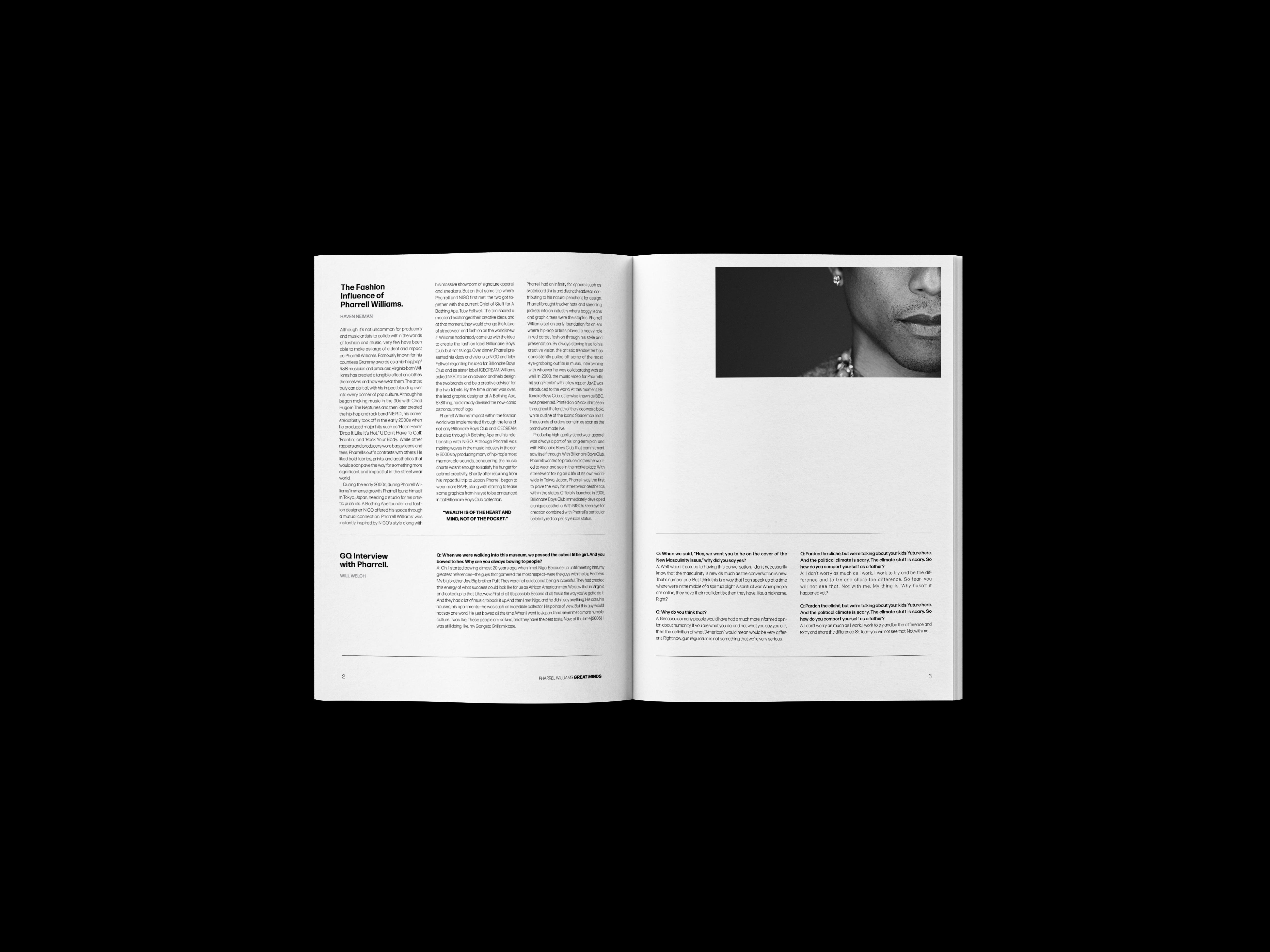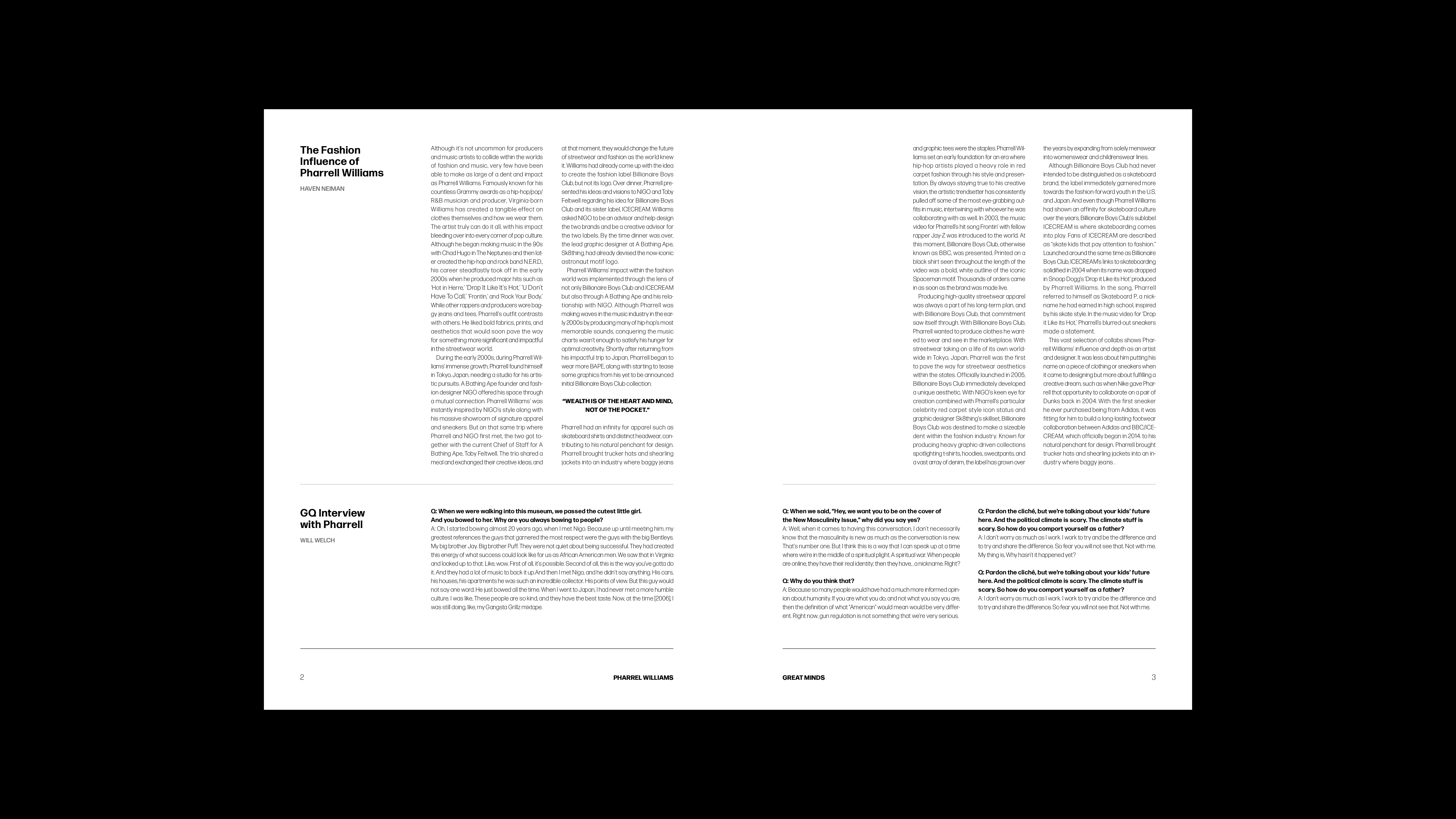 I was tasked with crafting a magazine that captures the essence of a chosen artist from any field. After doing thorough research, I was captivated by Pharrell Williams and his distinctive design style that resonates with his brand. Through meticulous examination, I delved into creating a zine that not only reflects his existing branding but also encapsulates the unique atmosphere he exudes as both a designer and an artist.