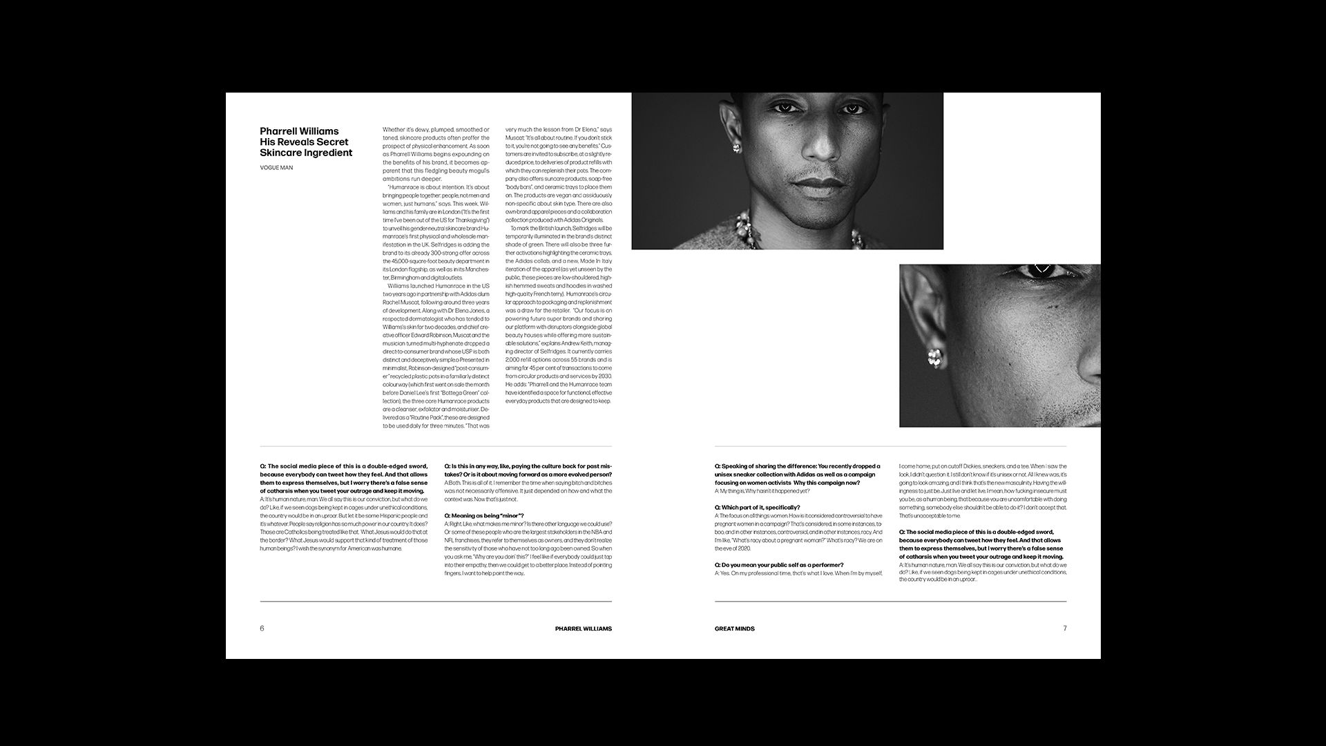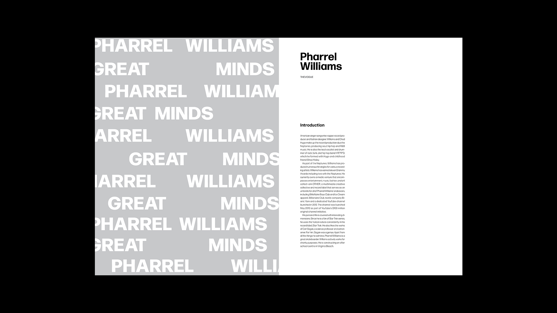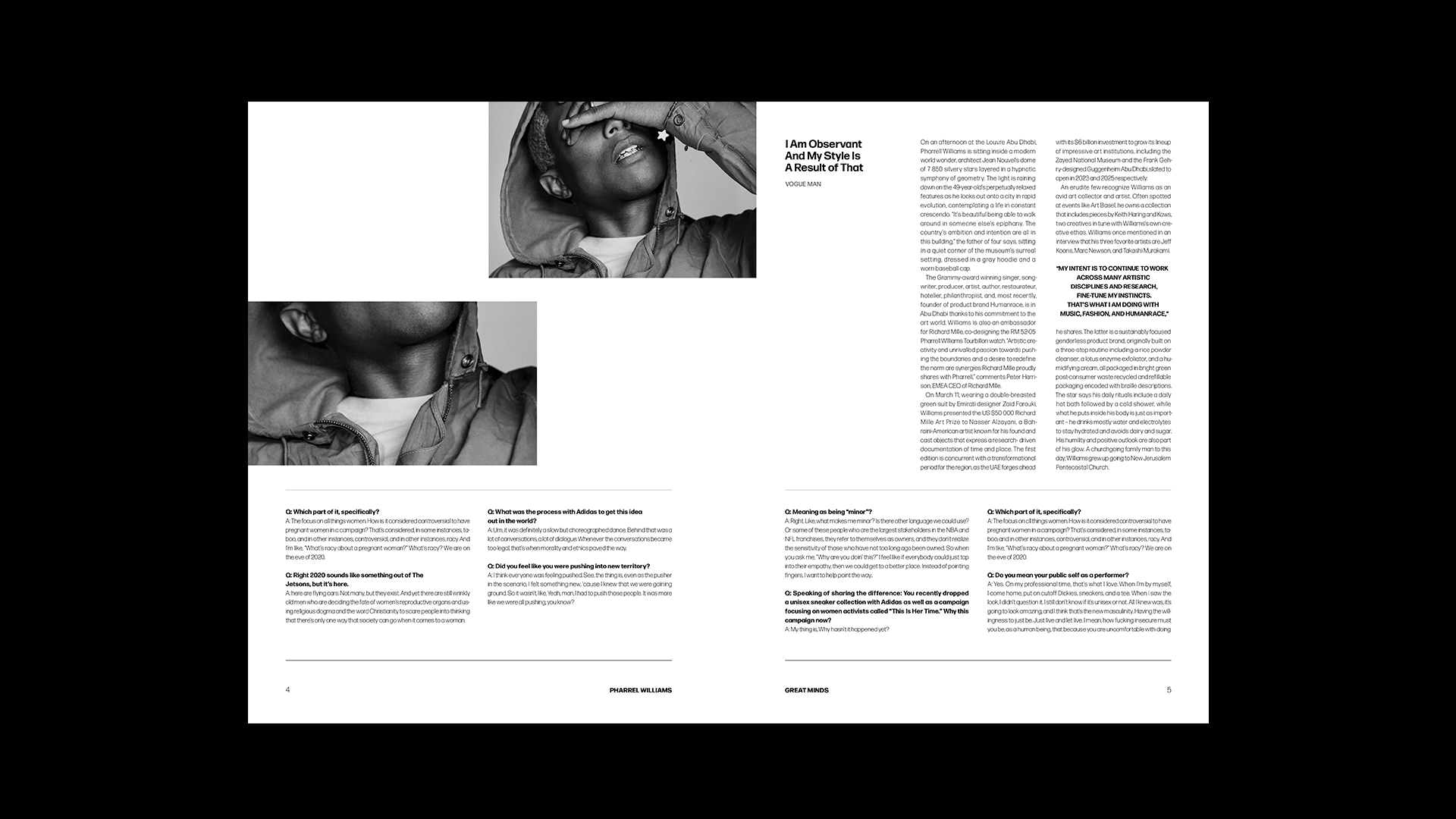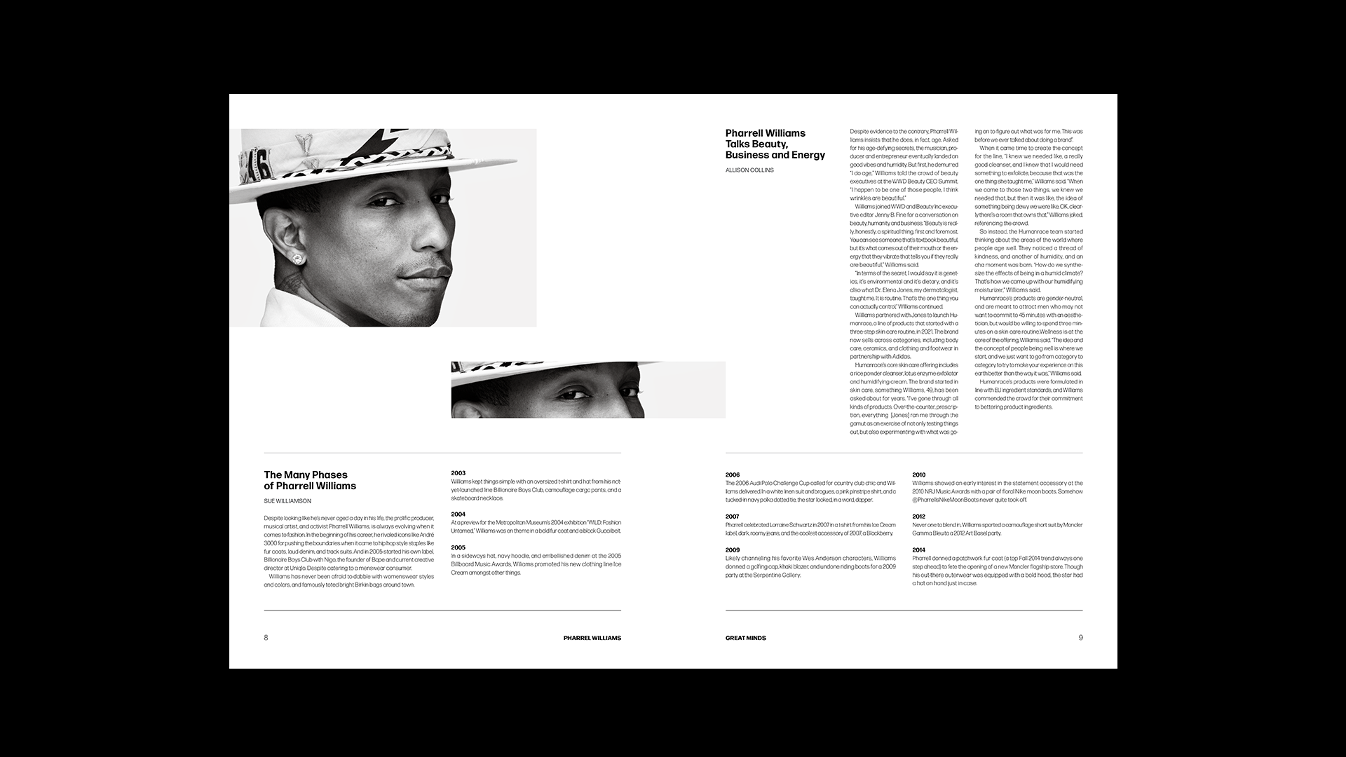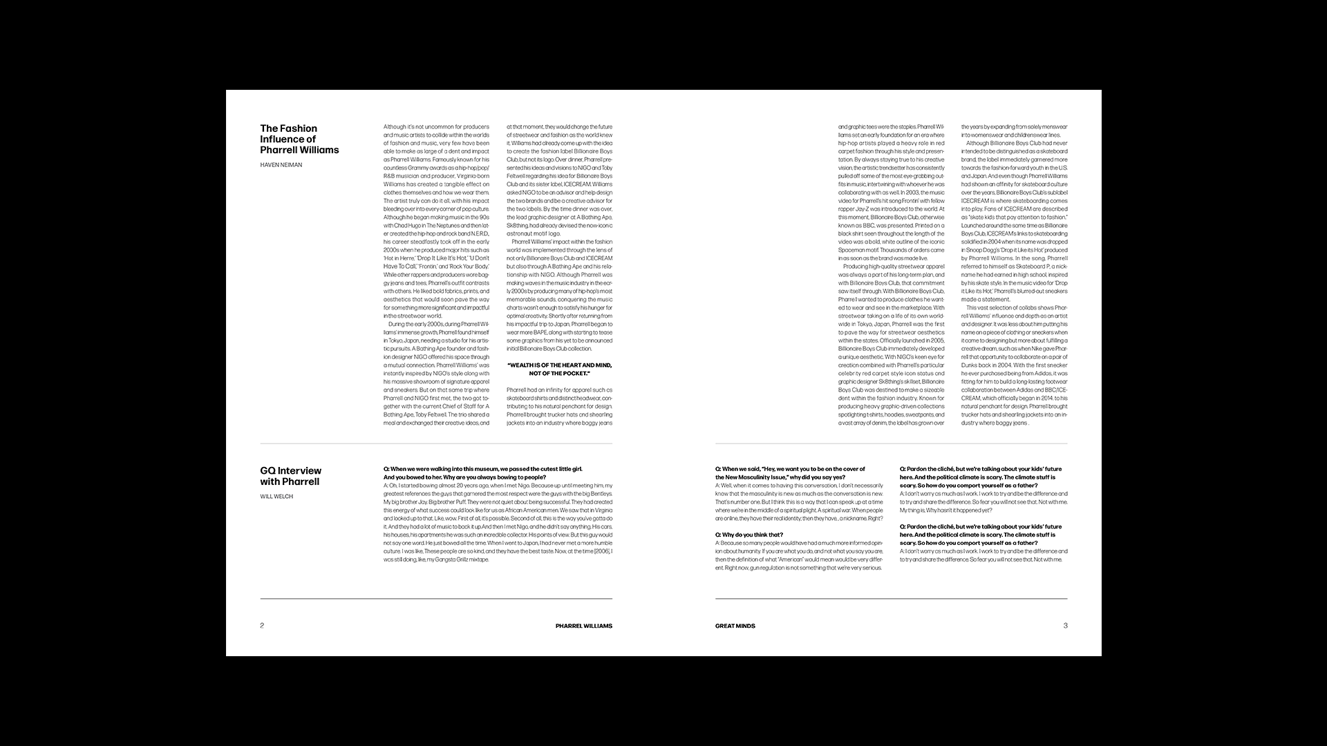 For this project, I had the chance to pick an artist of my choice and design a layout based on the personality and atmosphere of their work. The final result is a 10-page magazine that's dedicated to Pharrell Williams.