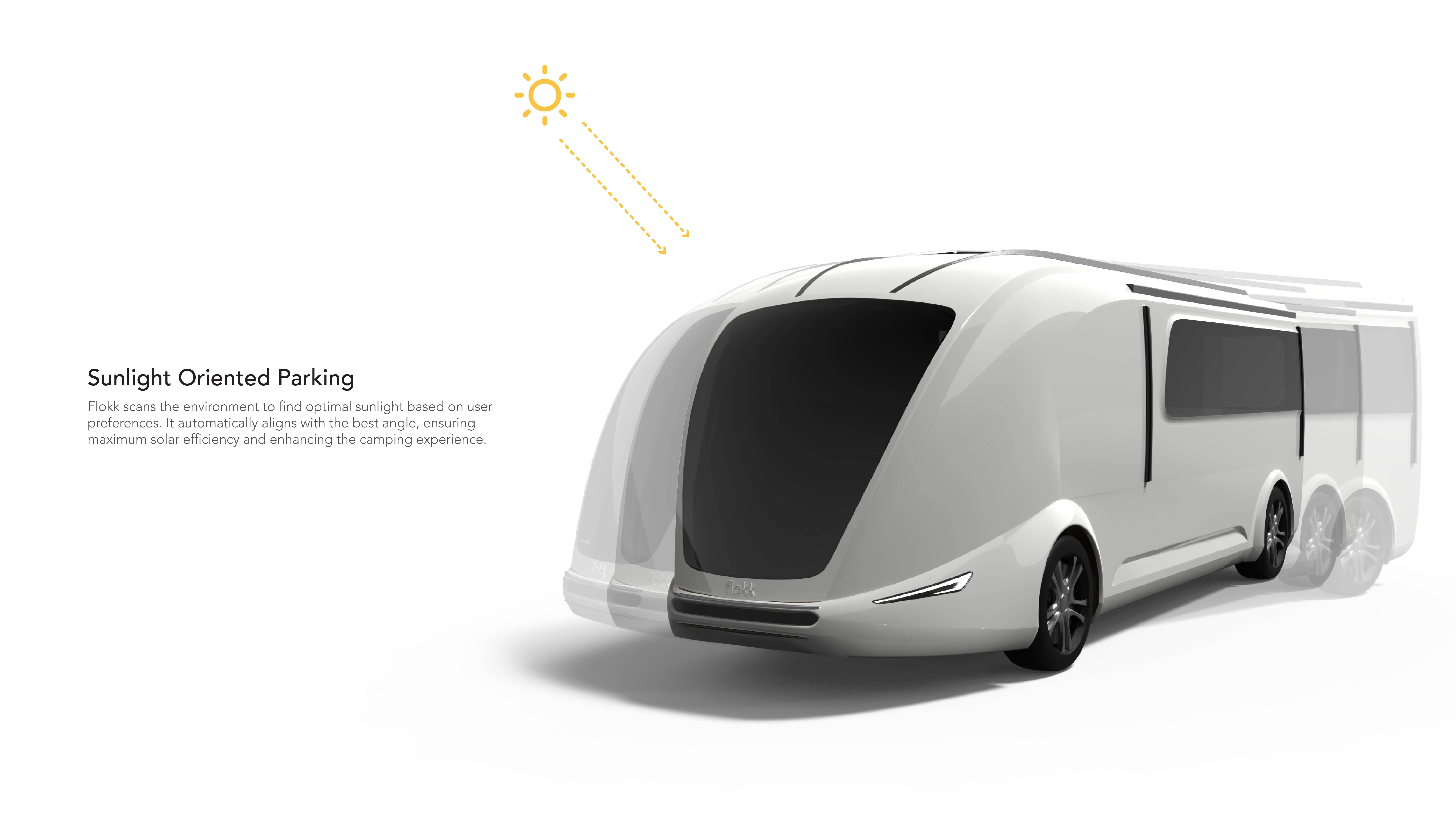 Flokk is an autonomous flocking recreational vehicle which provides the freedom to explore without any constraints, and the comfort of bringing a beautiful home wherever you go.