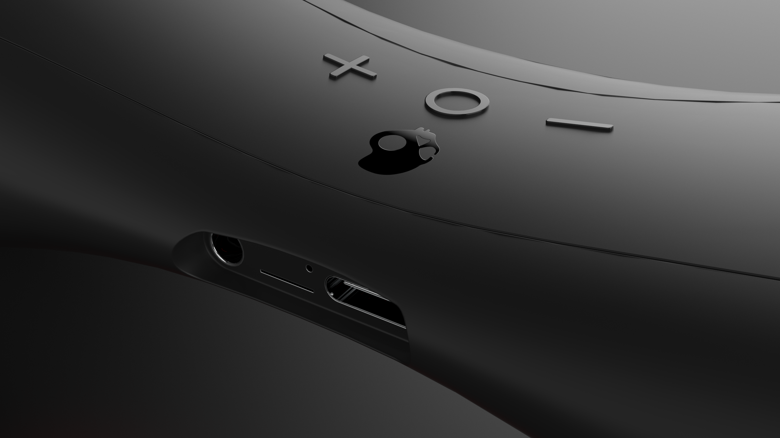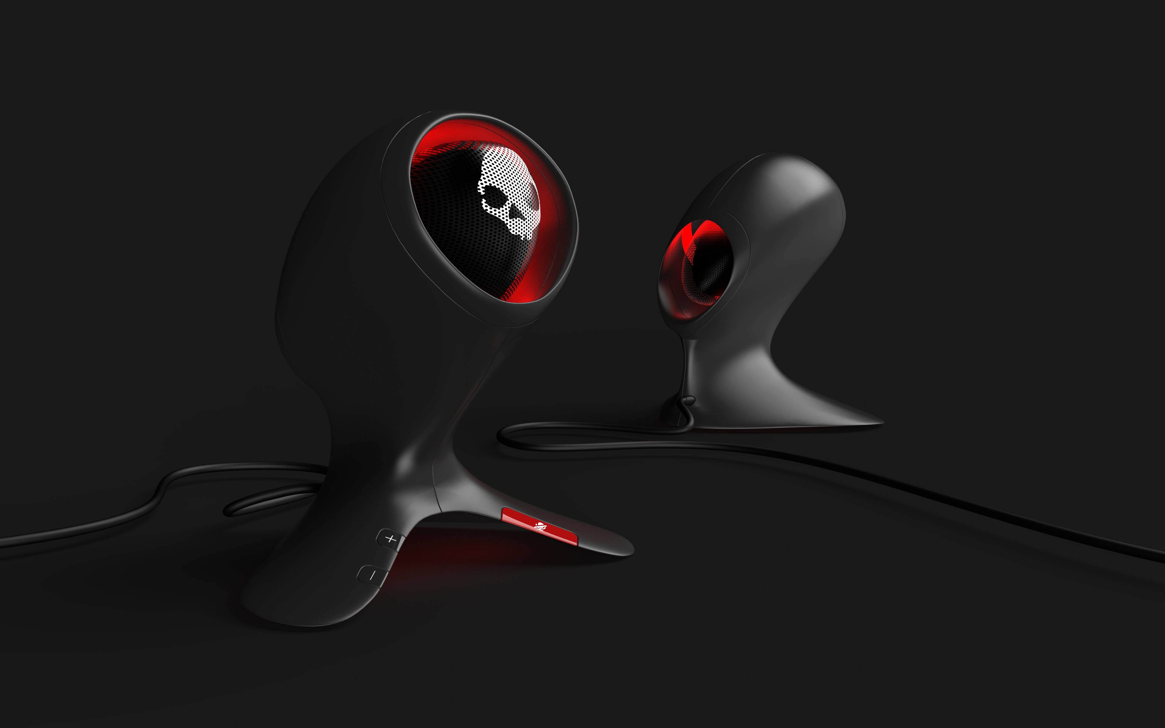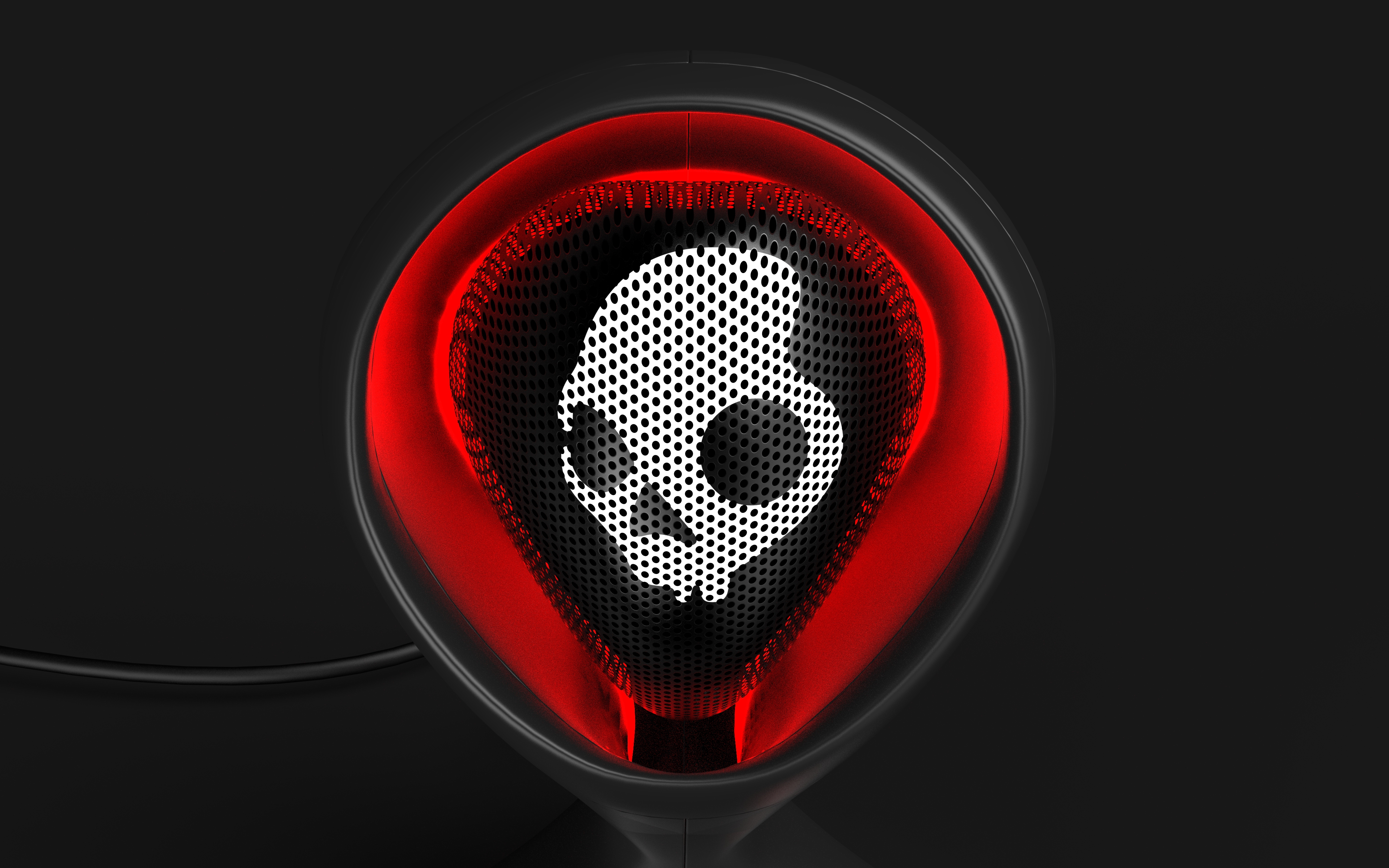 An audio set design with the branding of Skullcandy including a microphone, speaker and headphone.