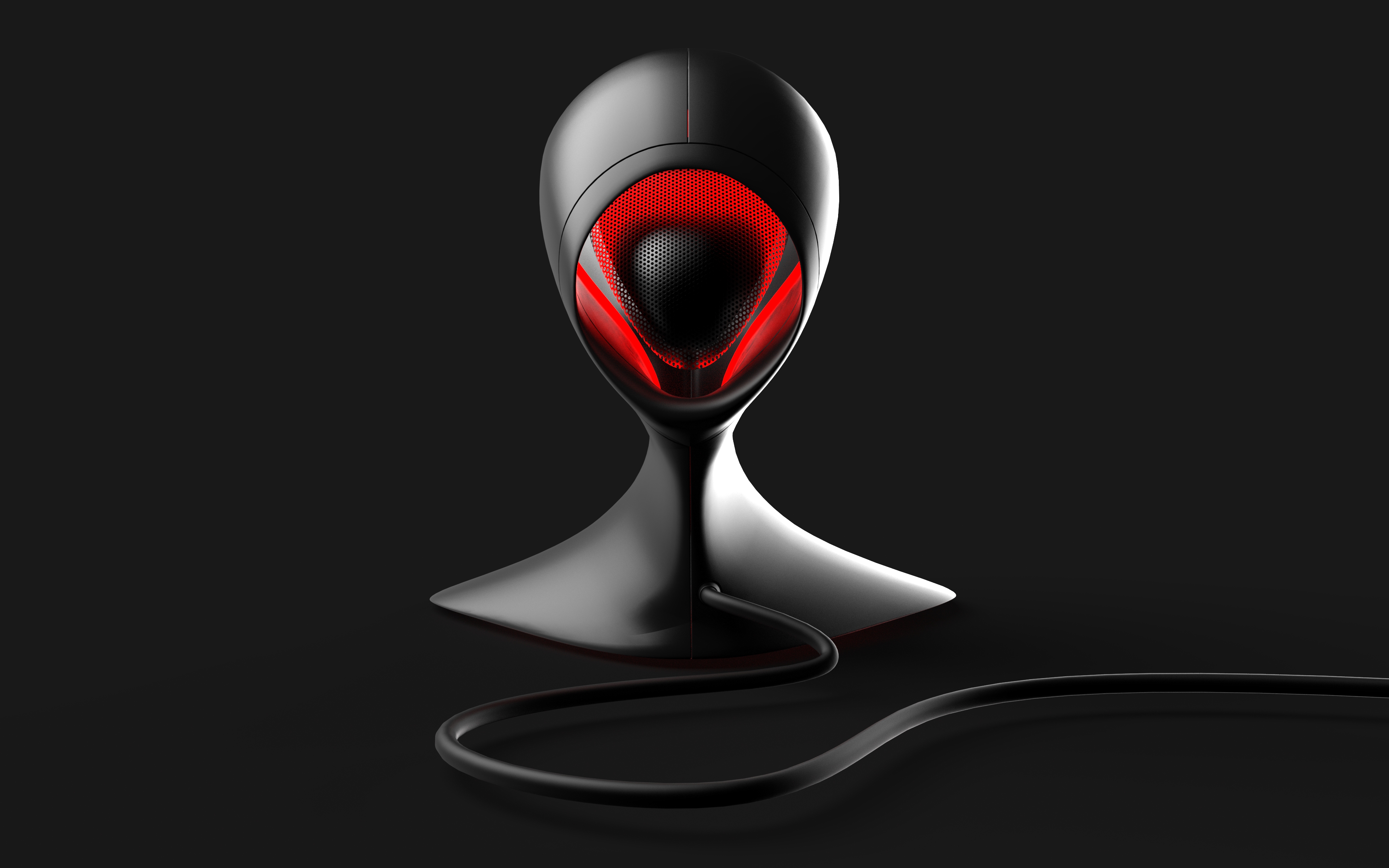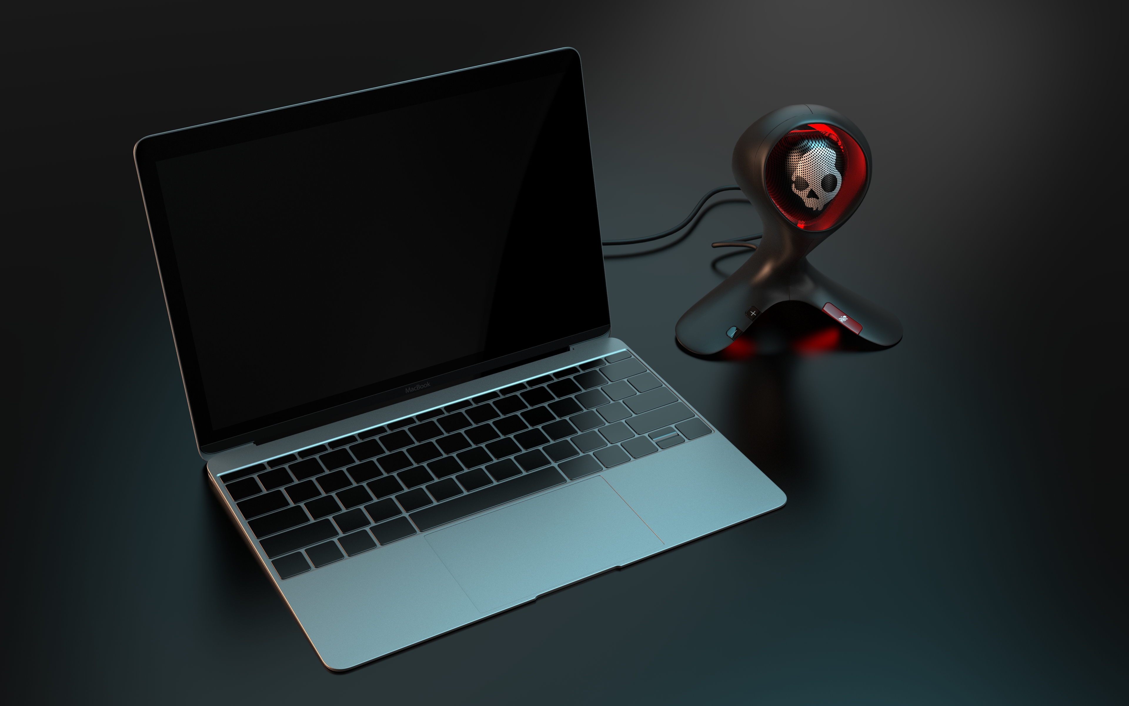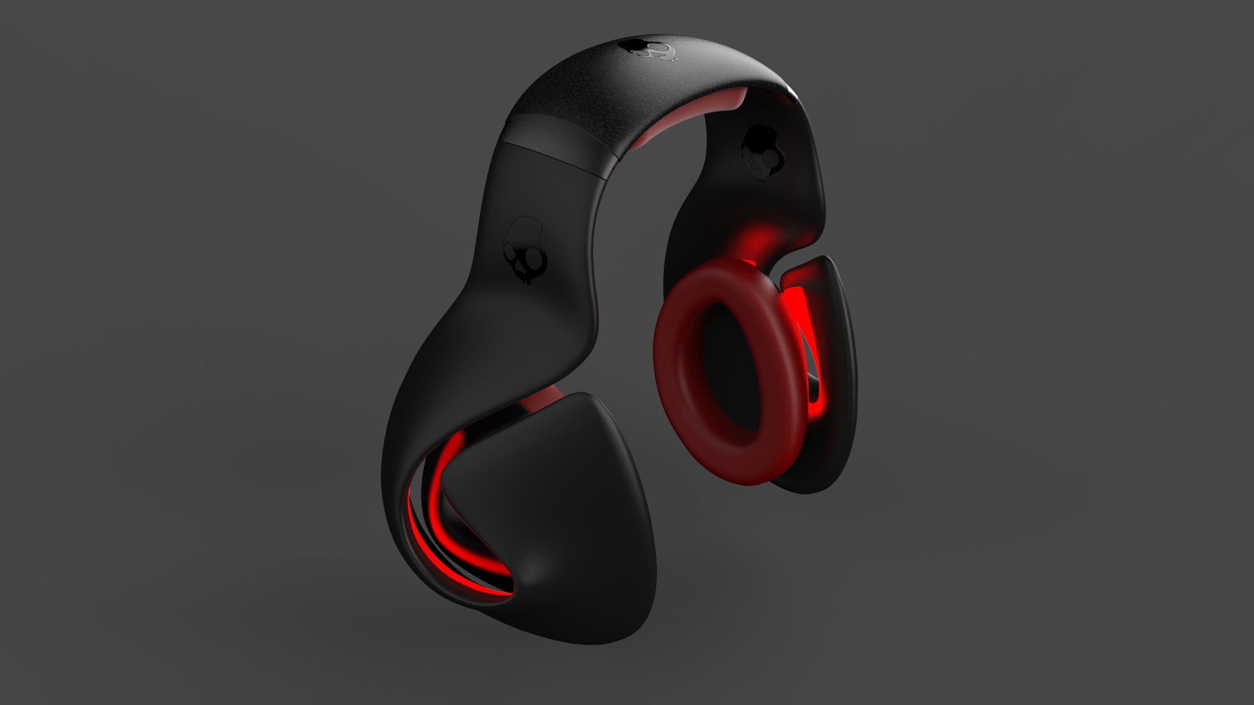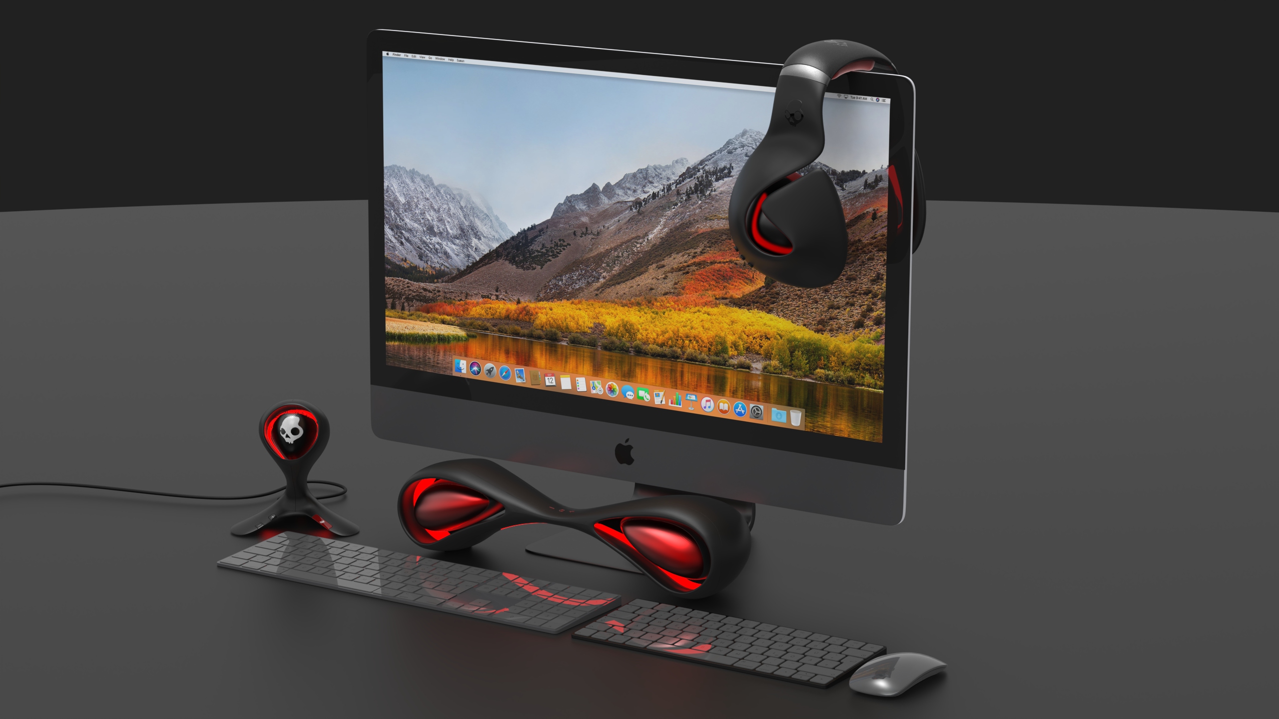 An audio set design with the branding of Skullcandy including a microphone, speaker and headphone.