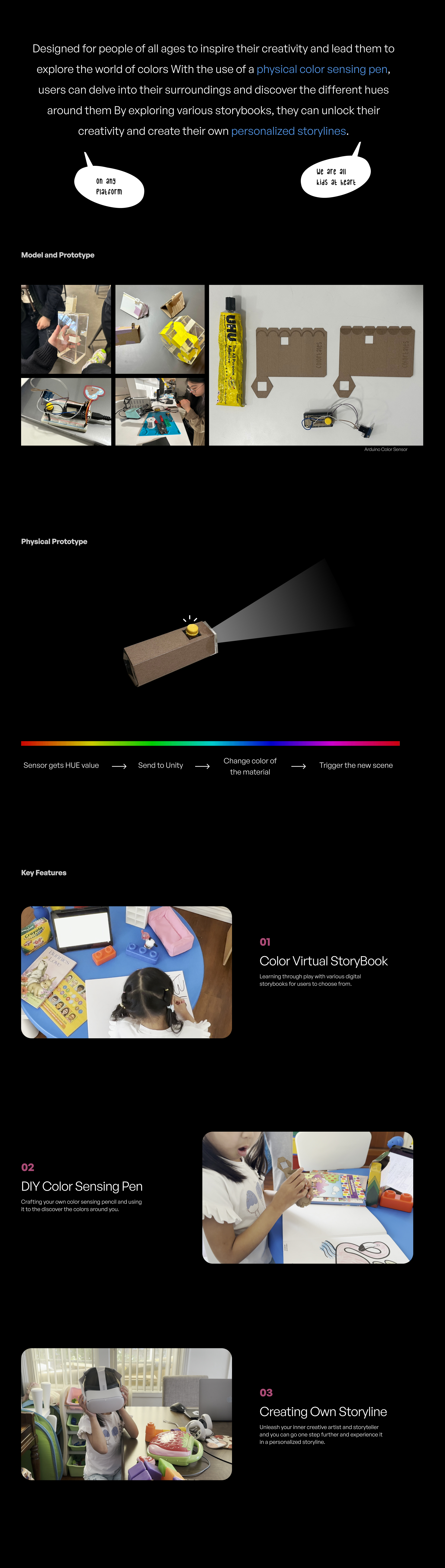 Game designed for people of all ages to inspire their creativity and lead them to explore the world of colors. With the use of a physical color sensing pen, users can delve into their surroundings and discover the different hues around them. By exploring various storybooks, they can unlock their creativity and create their own personalized storylines.
