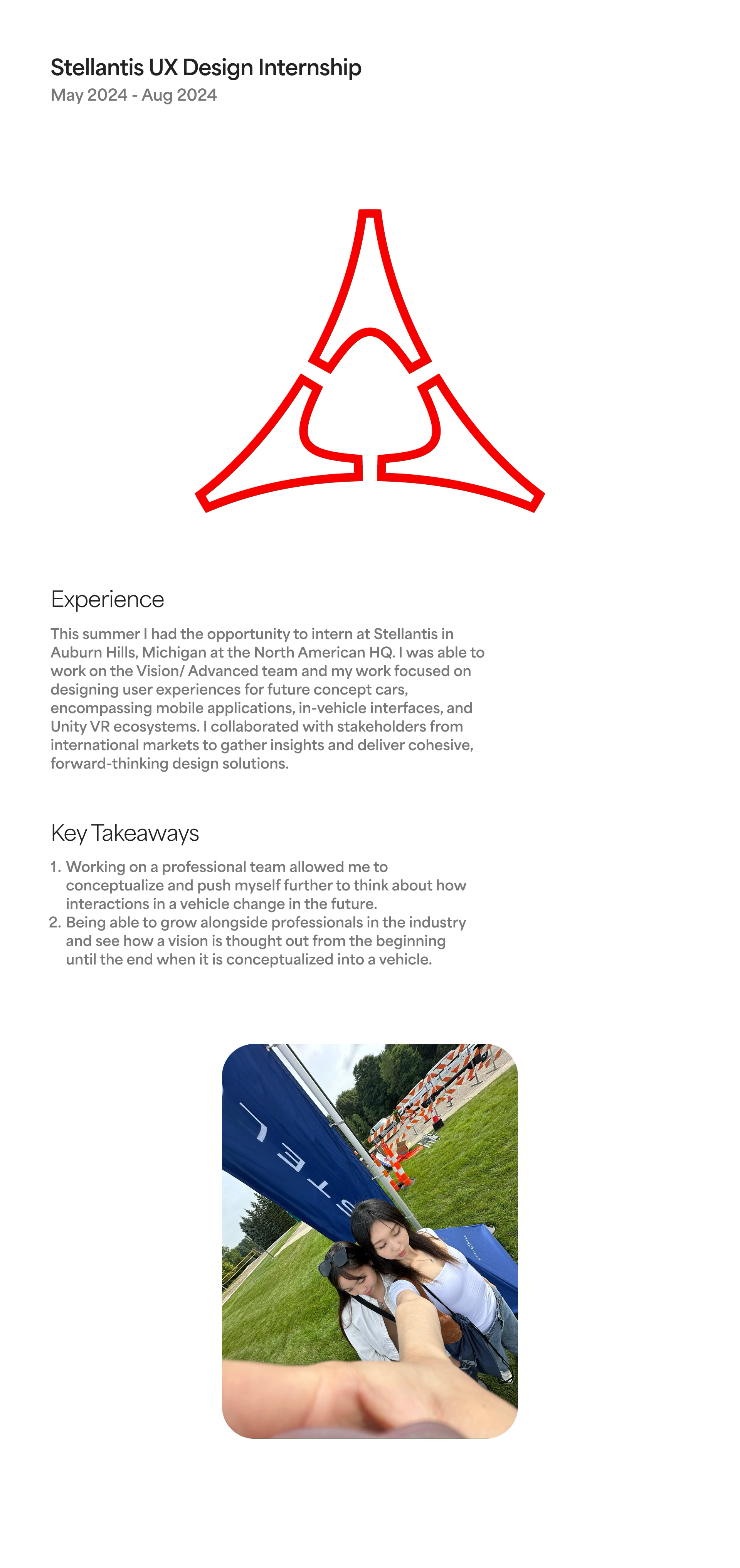During Summer 2024, I interned at Stellantis headquarters in Auburn Hills, Michigan, as a UX Designer on the Advanced/Vision team. My work focused on designing user experiences for future concept cars, encompassing mobile applications, in-vehicle interfaces, and Unity VR ecosystems. I collaborated with stakeholders from international markets to gather insights and deliver cohesive, forward-thinking design solutions.
