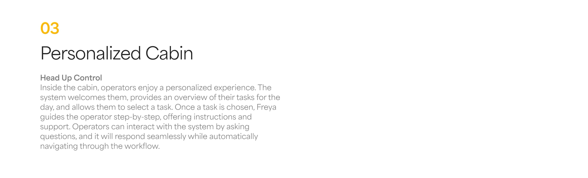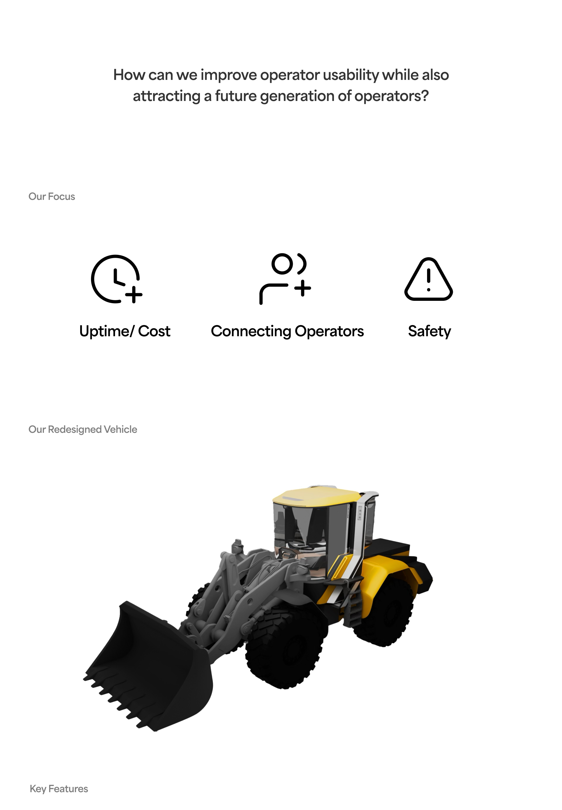 Freya was designed on focusing on improving operator usability in wheel loaders while thinking about how to attract the next generation of operators. By integrating intuitive controls, ergonomic design, and advanced technologies, the aim is to create equipment that enhances productivity and comfort, meeting the needs of current operators while appealing to future users.
