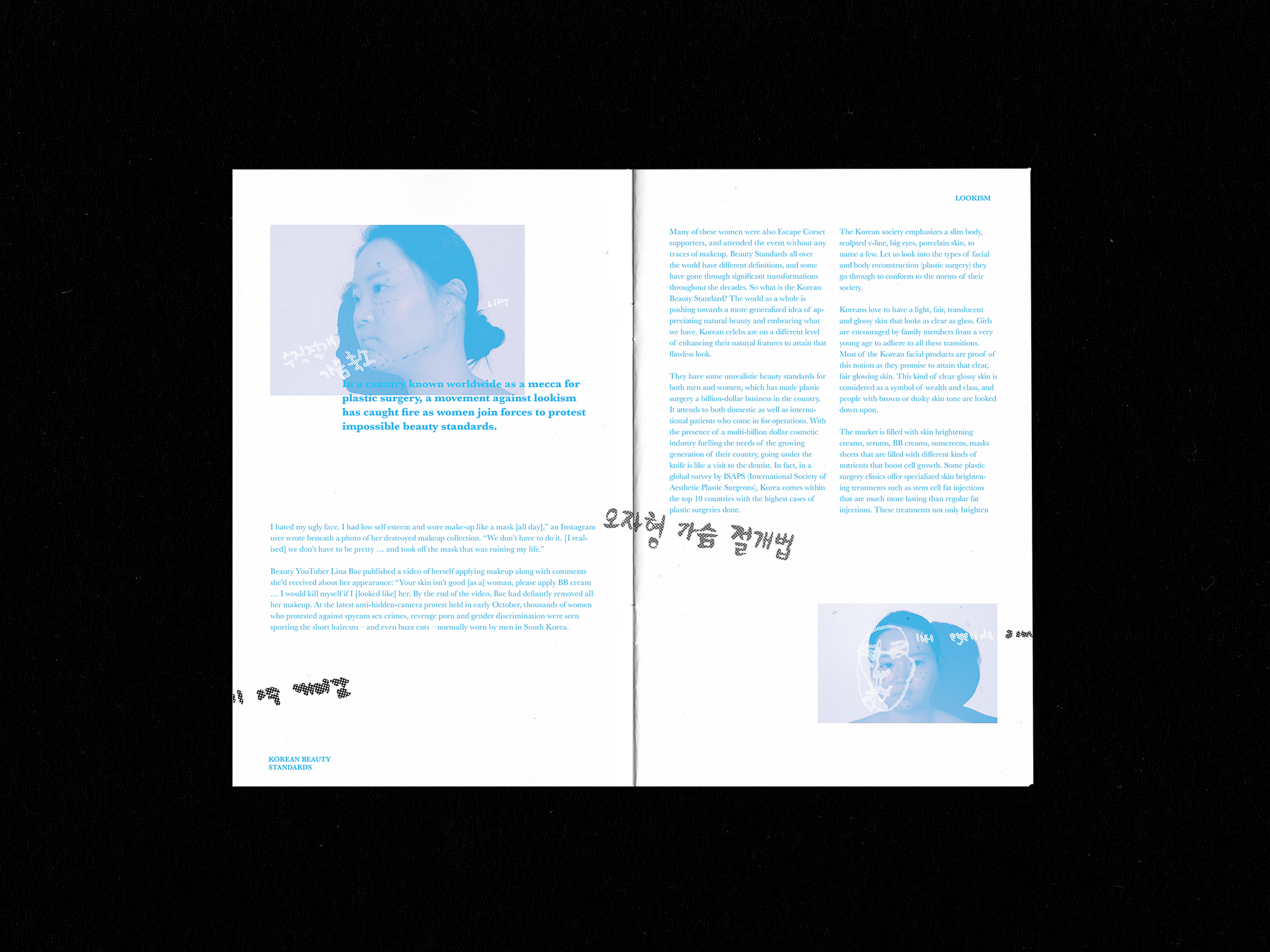 Throughout my zine, I use doodles that express the beauty related procedures, such as plastic surgery related stitches and procedures. I also express standards generally seen in Korea, such as head size or proportions. These doodles are shown throughout my zine.