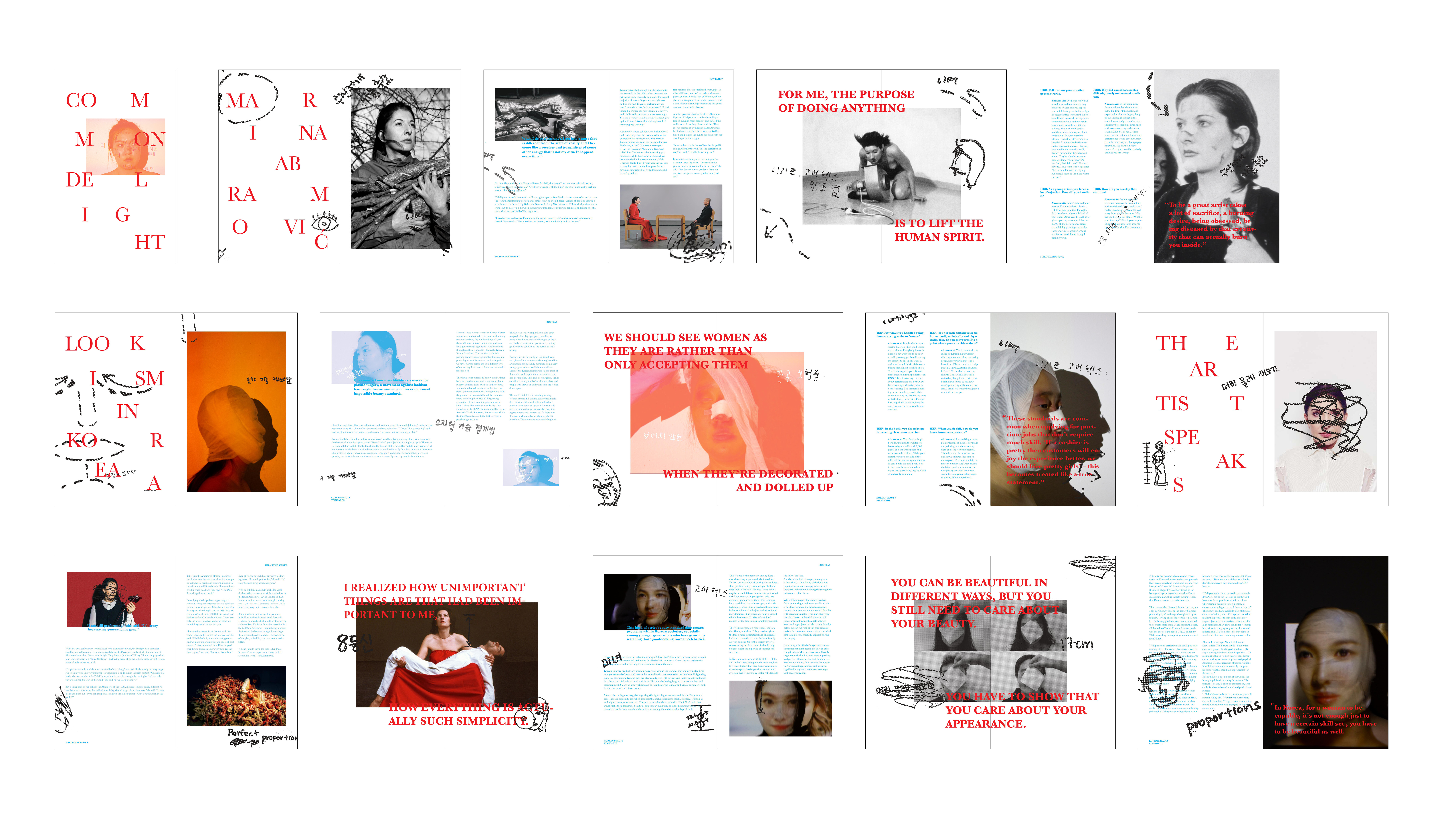 Common Delight is a multimedia project created in Communication Design 2. The project consisted of a zine, two motion posters, along with a short video that captured the mood of my zine. The project was based off combining two things, an (assigned) artist along with a chosen topic. In my case, my chosen topic was beauty standards in Korea. Through this project, I expressed the extreme and unrealistic beauty standards of Korea.