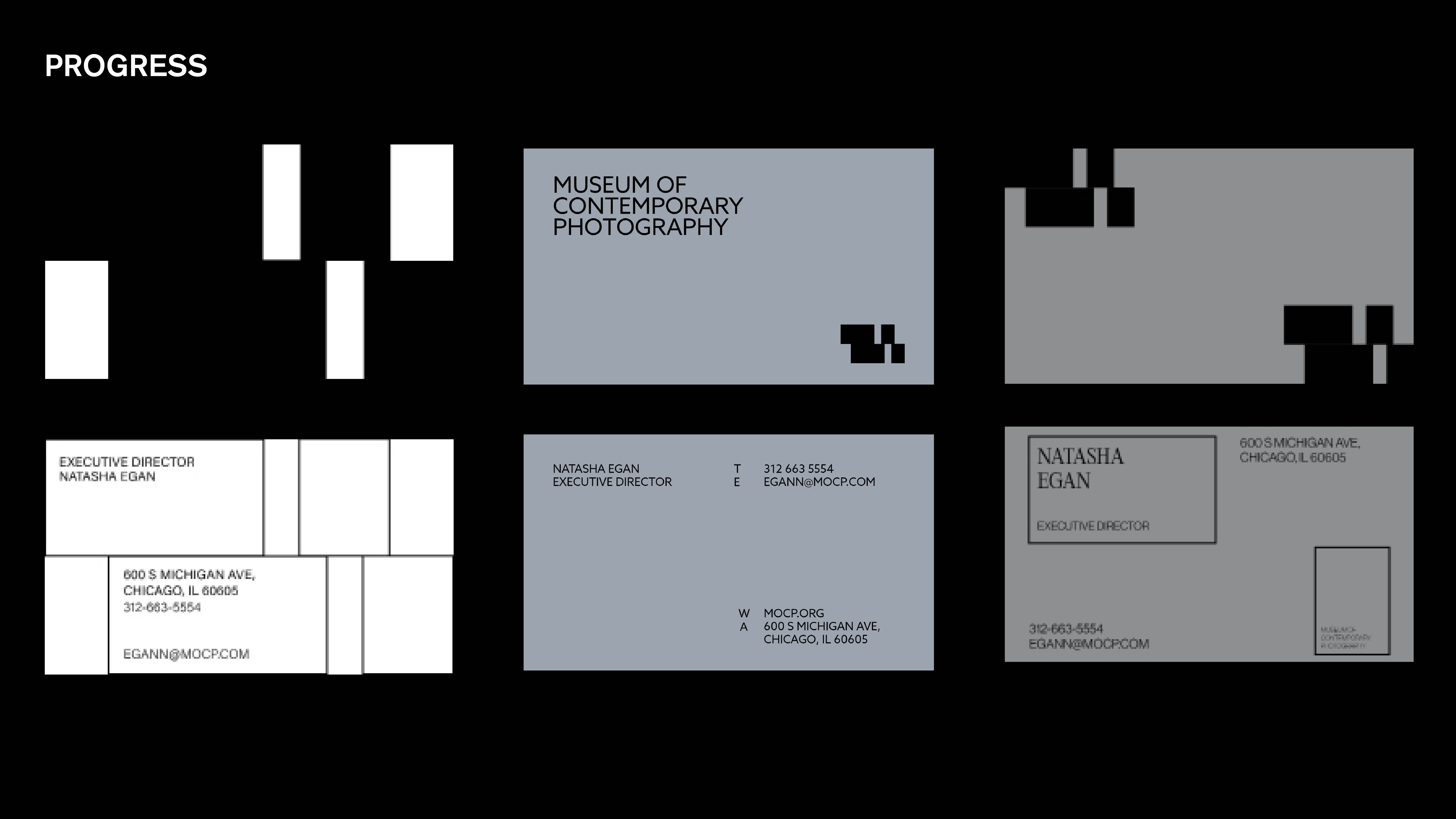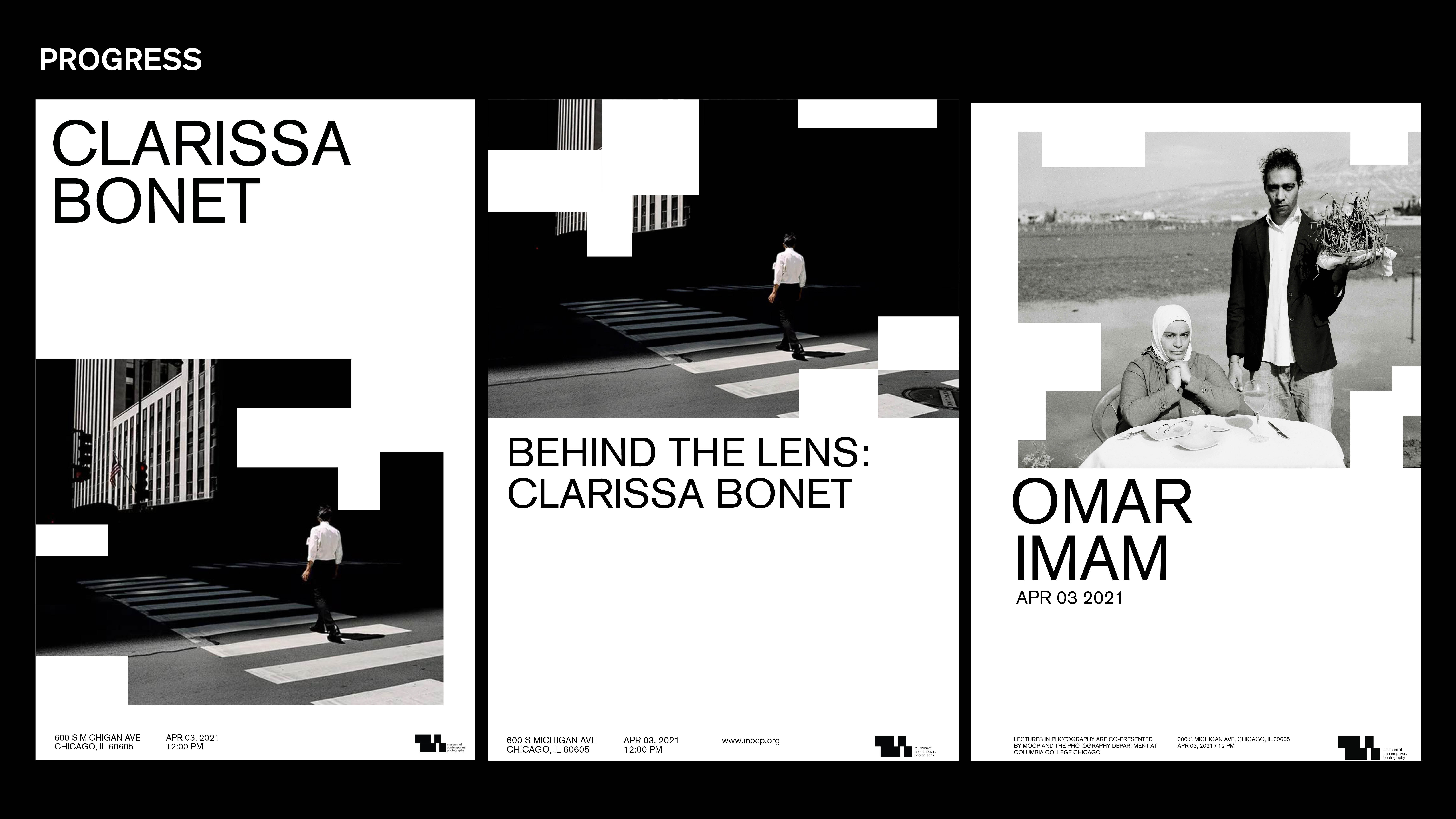 To give a background on my logo, through my research, I noticed that the museum focuses on cultivating ideas and provoking dialogue through their community. In a way, through their photography—they are connecting the past to the present with the photography presented. Thus, that became the gateway and focus of my identity. My logo also translates to an abstract form of a film strip—translating to something that is revealed which is shown through my short form logo.