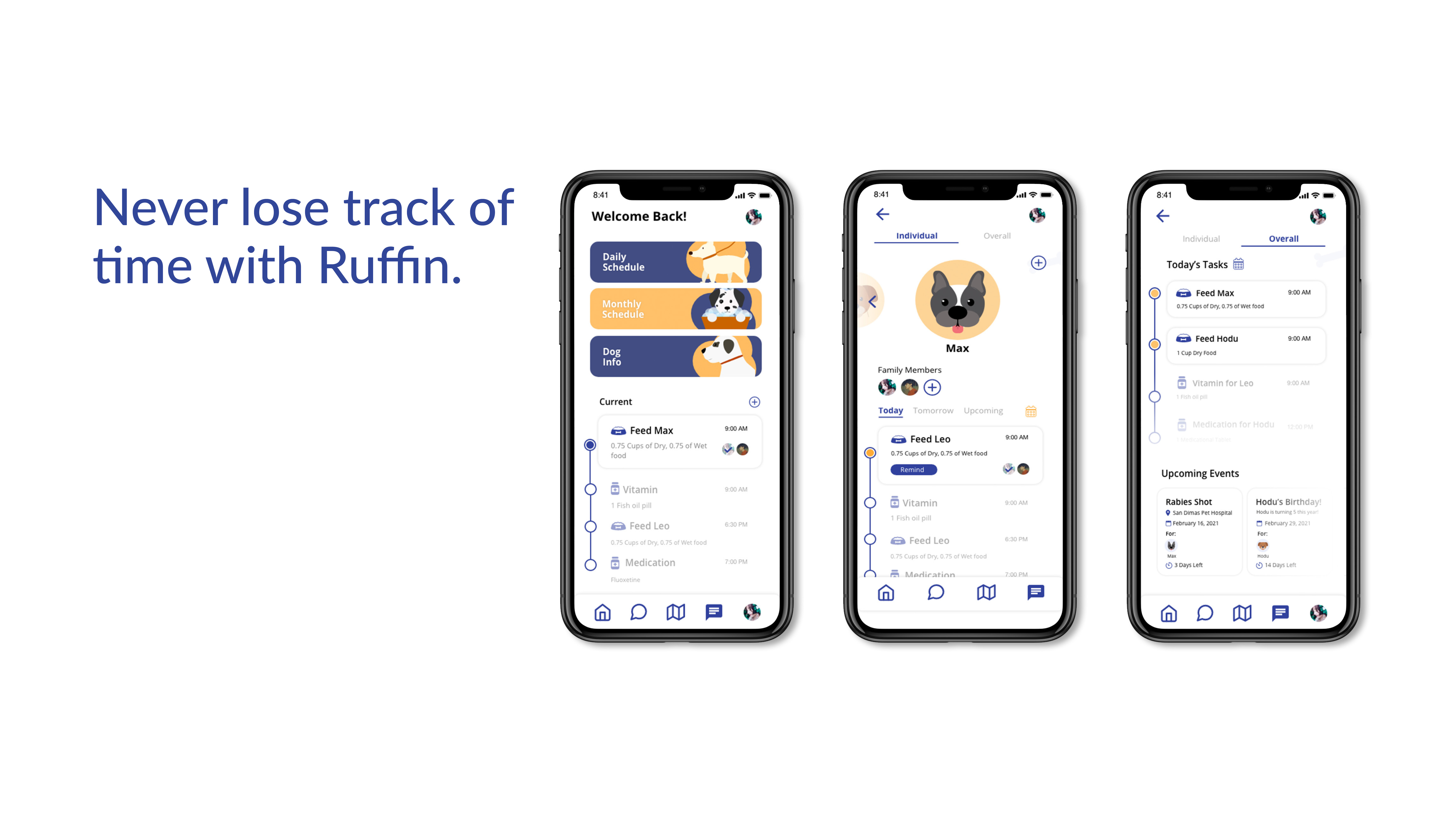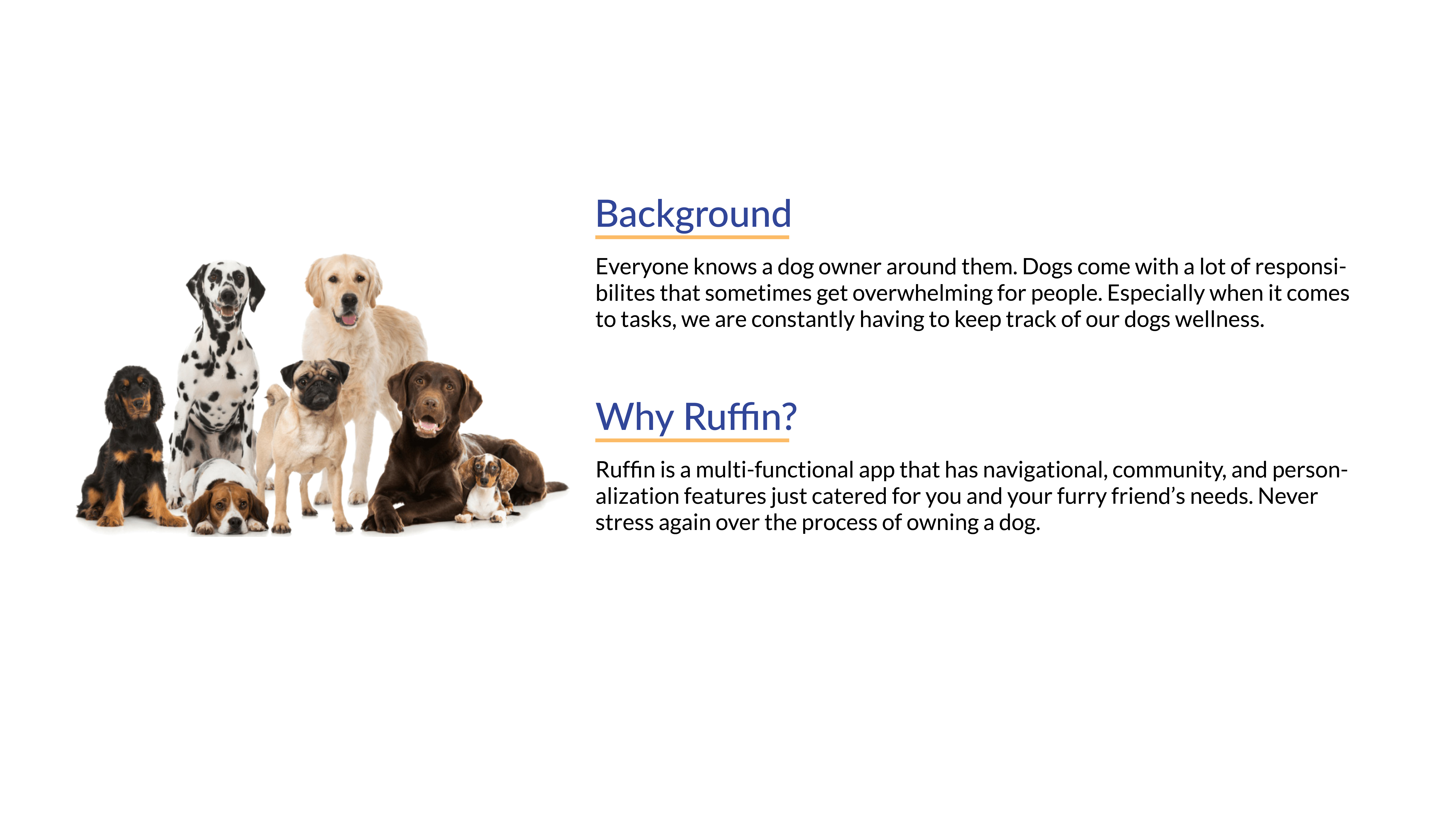 Behind my process and why I decided to create Ruffin for dog owners—dog owners are constantly having to keep track of tasks for their dogs, especially when you own multiple it can get hectic. The demand for the dog industry only continues to grow and as a fellow dog owner myself, I wanted to create an app where it would be functional and useful for fellow dog owners.