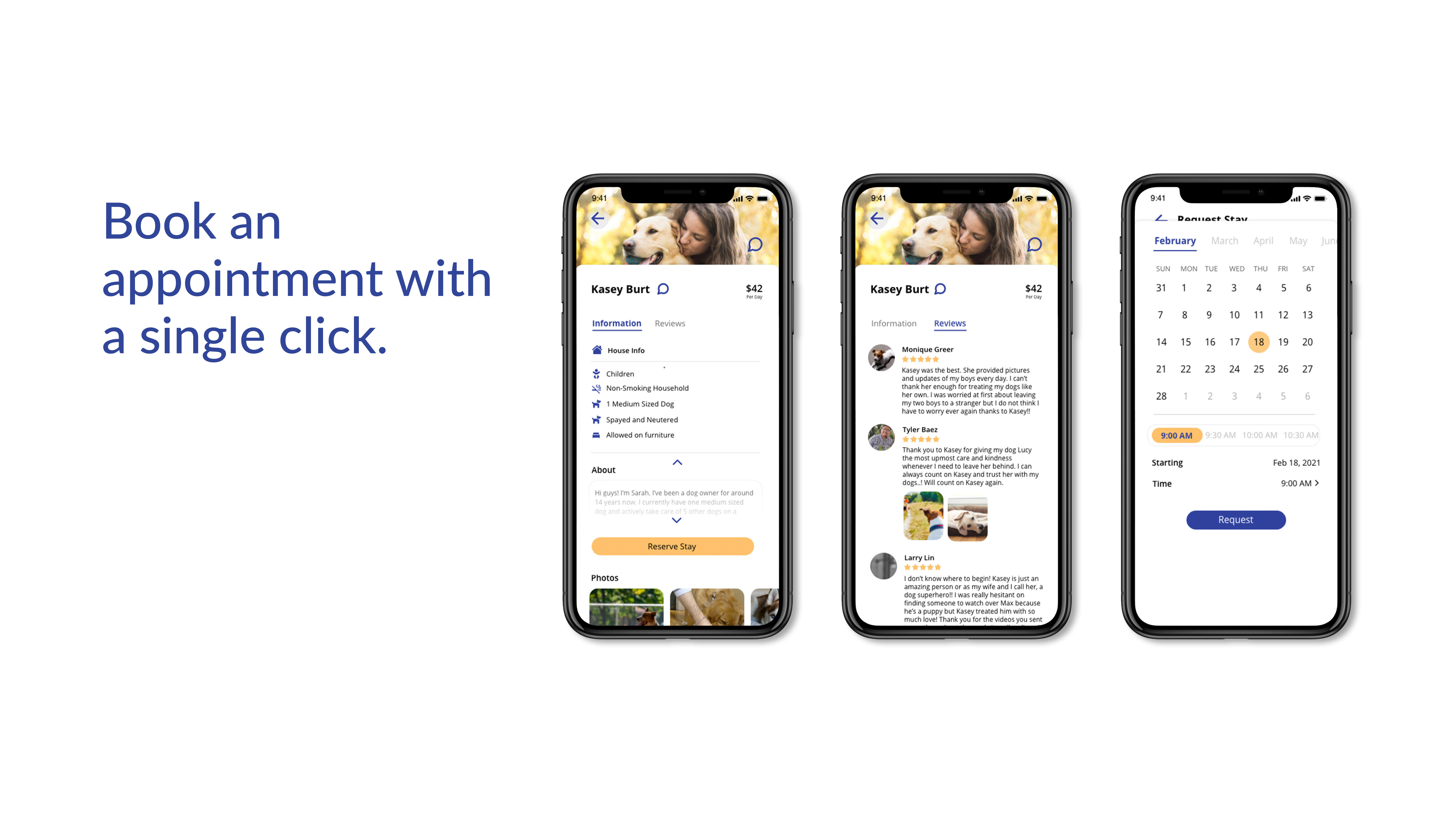 Booking appointments with one single click. Don't worry about sending records to your new doctor — Ruffin has all your dogs information stored so that you can easily move records from vet clinic to clinic.