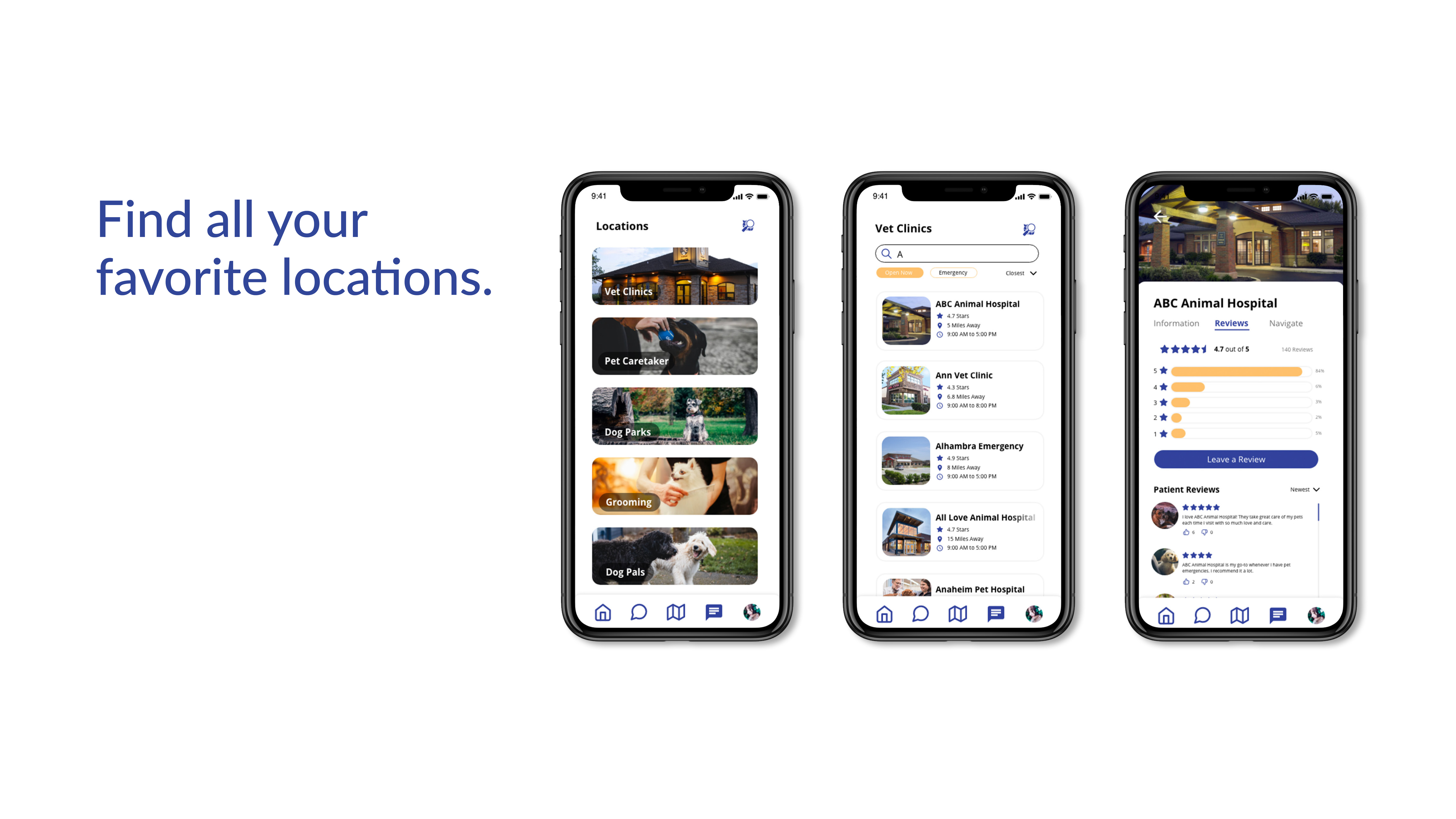Find dog specific locations — from dog parks to dog pals. Sort by closest, highest ratest, etc., Read and write reviews and recommend your favorite locations to other people!