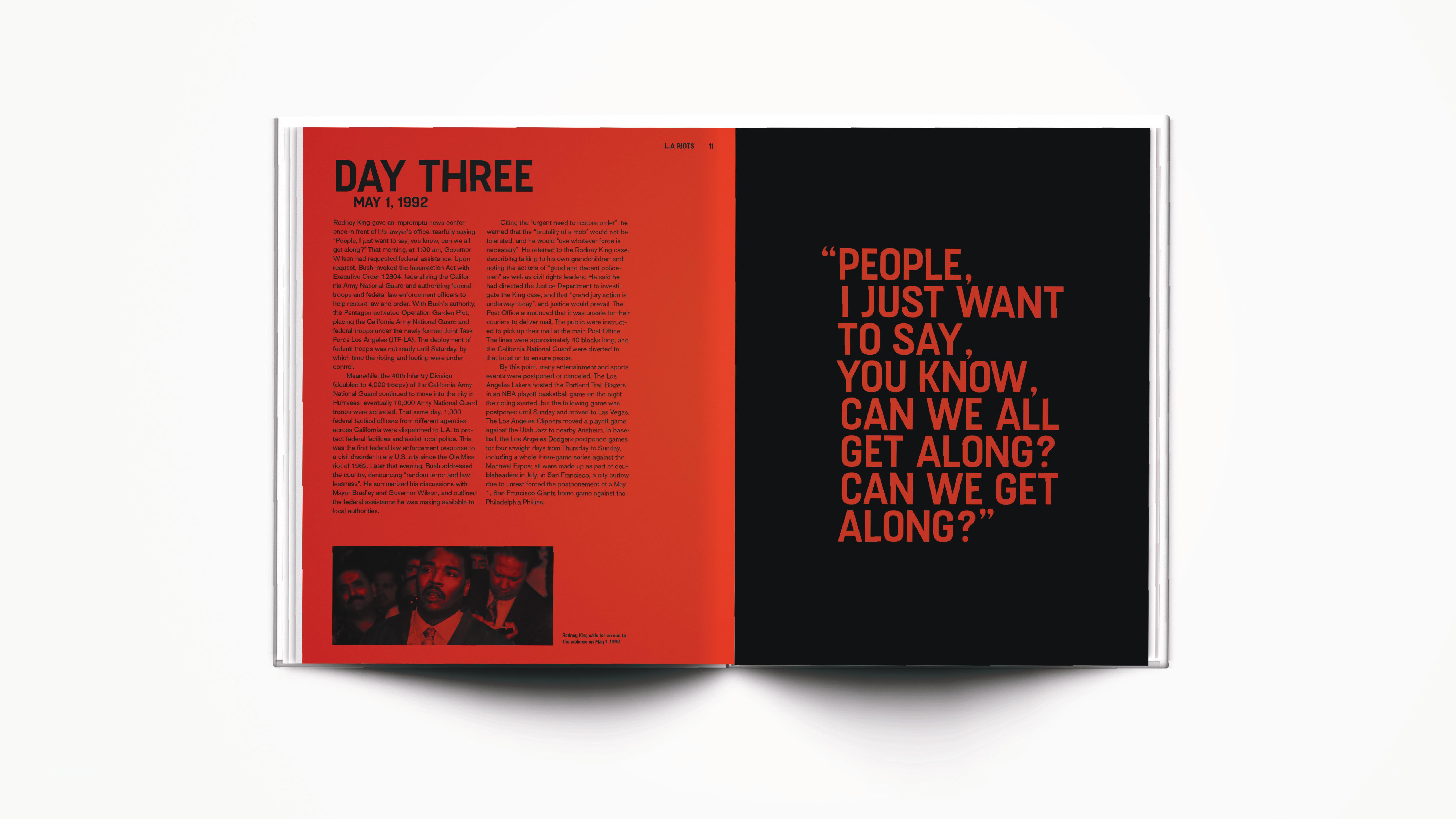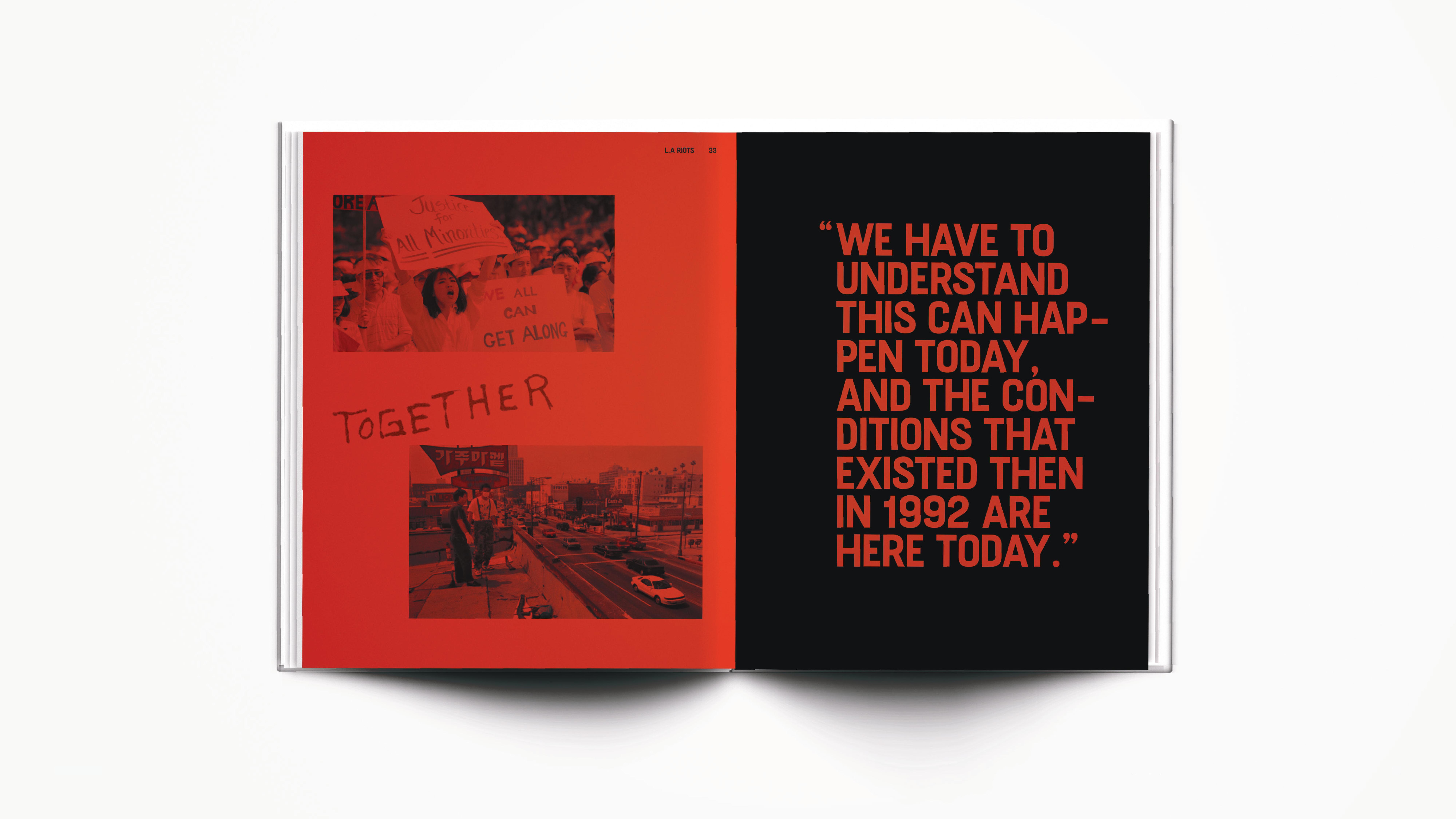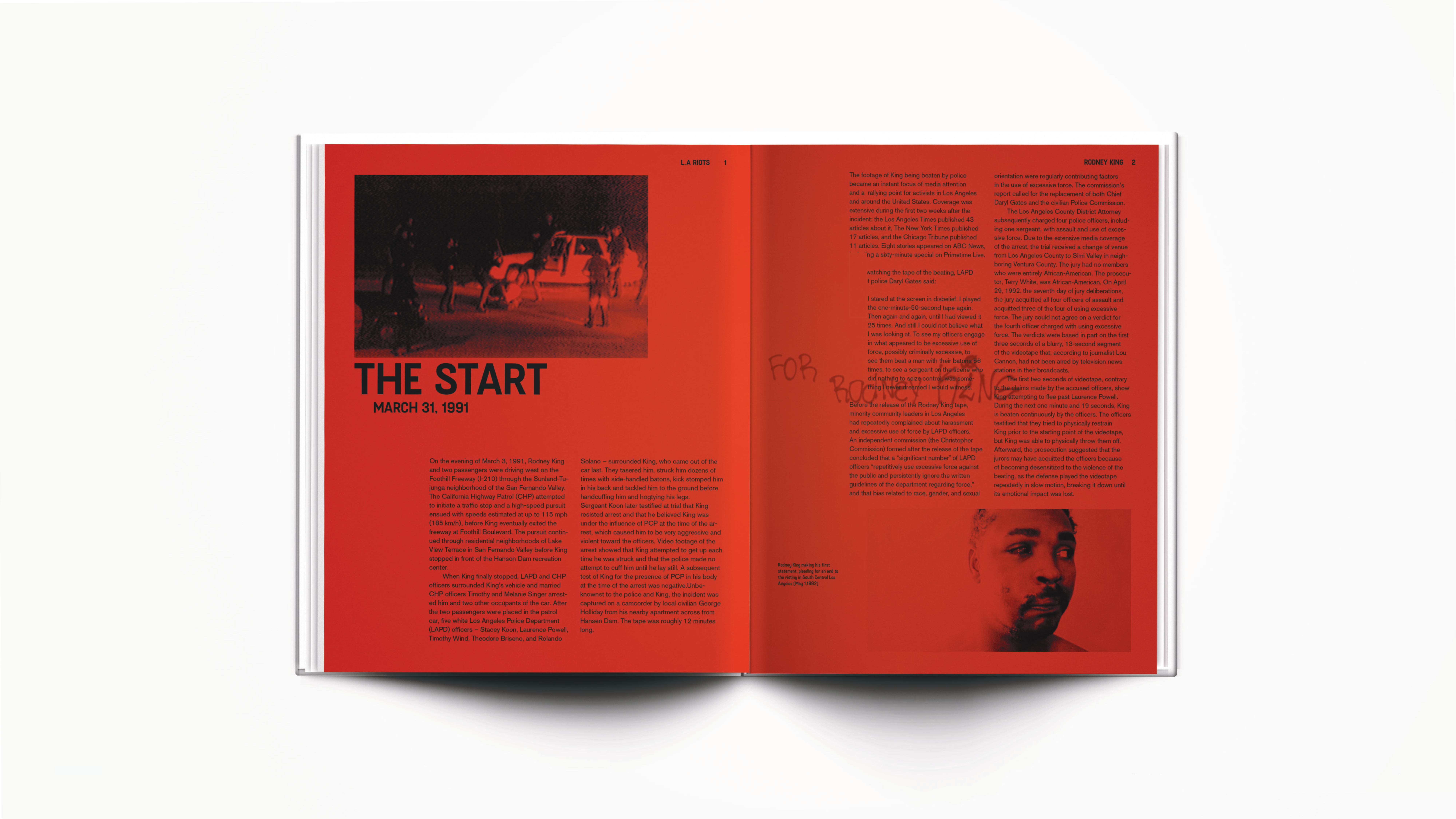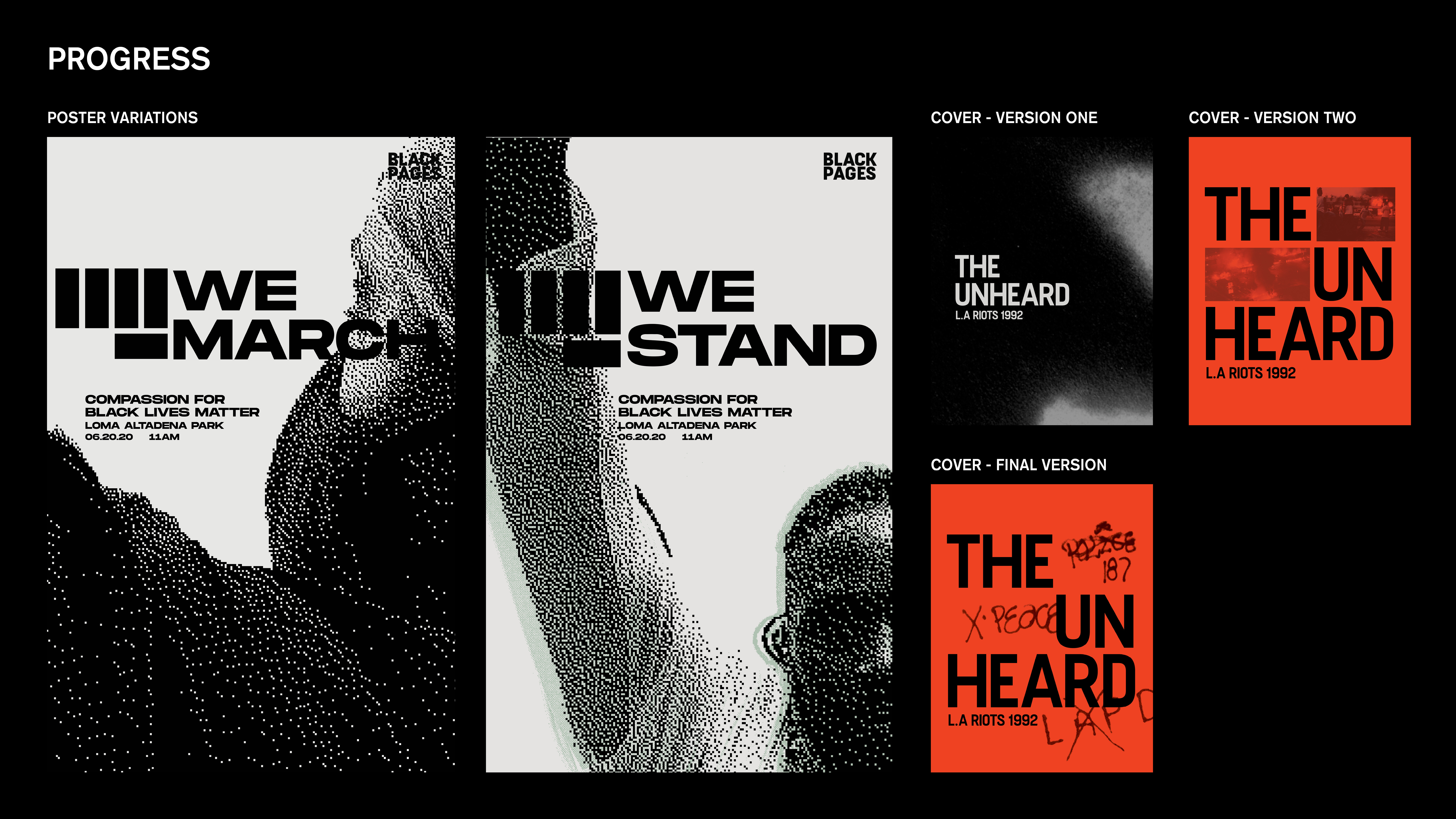 This shows the process of a few posters and cover versions I created. For the poster, at first, I only chose photos that showed individual people. Through various critiques and progress however, I learned that perhaps changing the last poster to something that represented the community would work better. The right shows a color variation I did as well — a color that was derived inspiration from the Black Liberation flag. The first cover variations I did were used with type and imagery/color from my book. However, through progress, I took graffiti from the L.A Riots itself because I felt that strongly expressed the defiance and significance of my event.