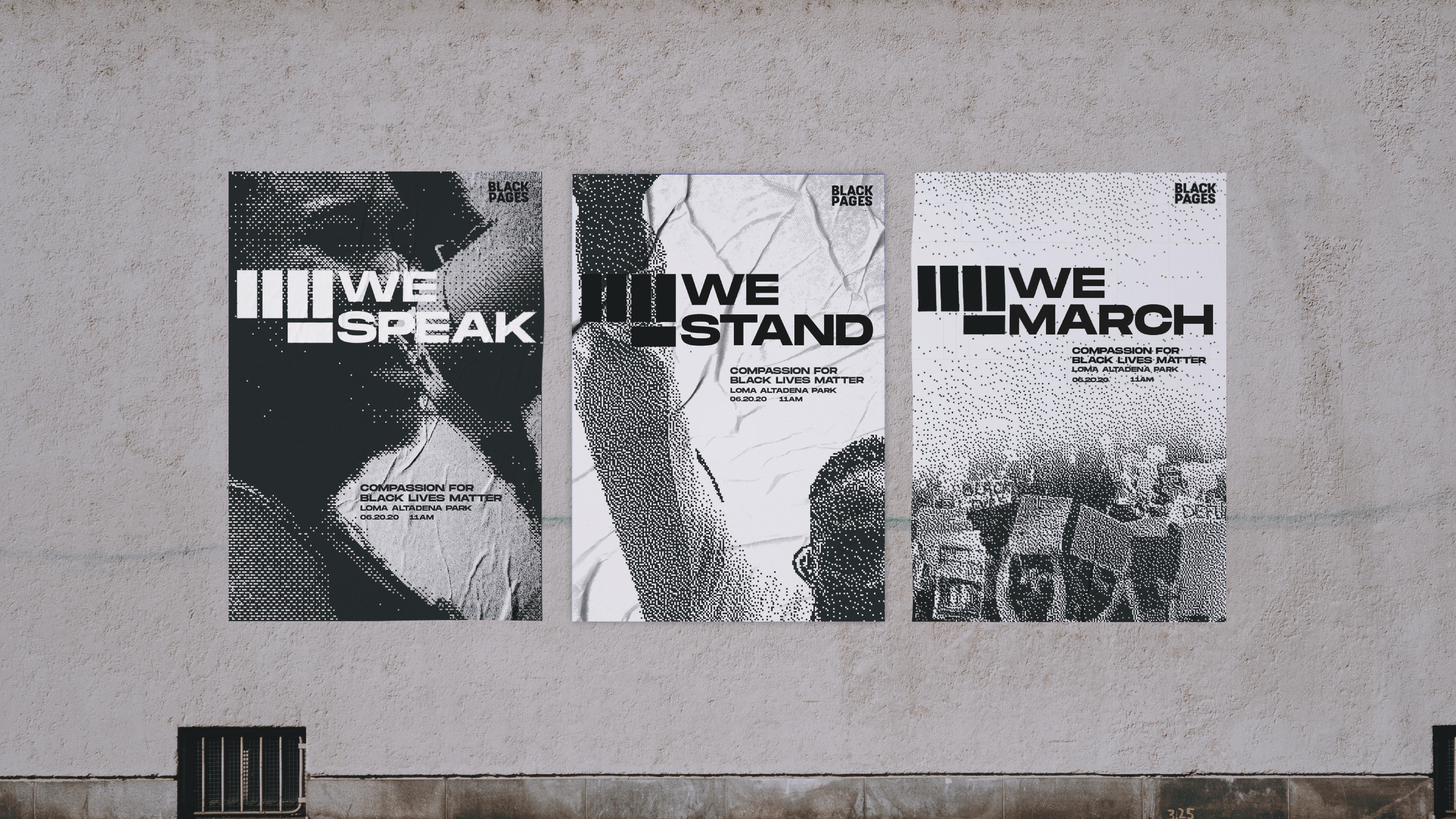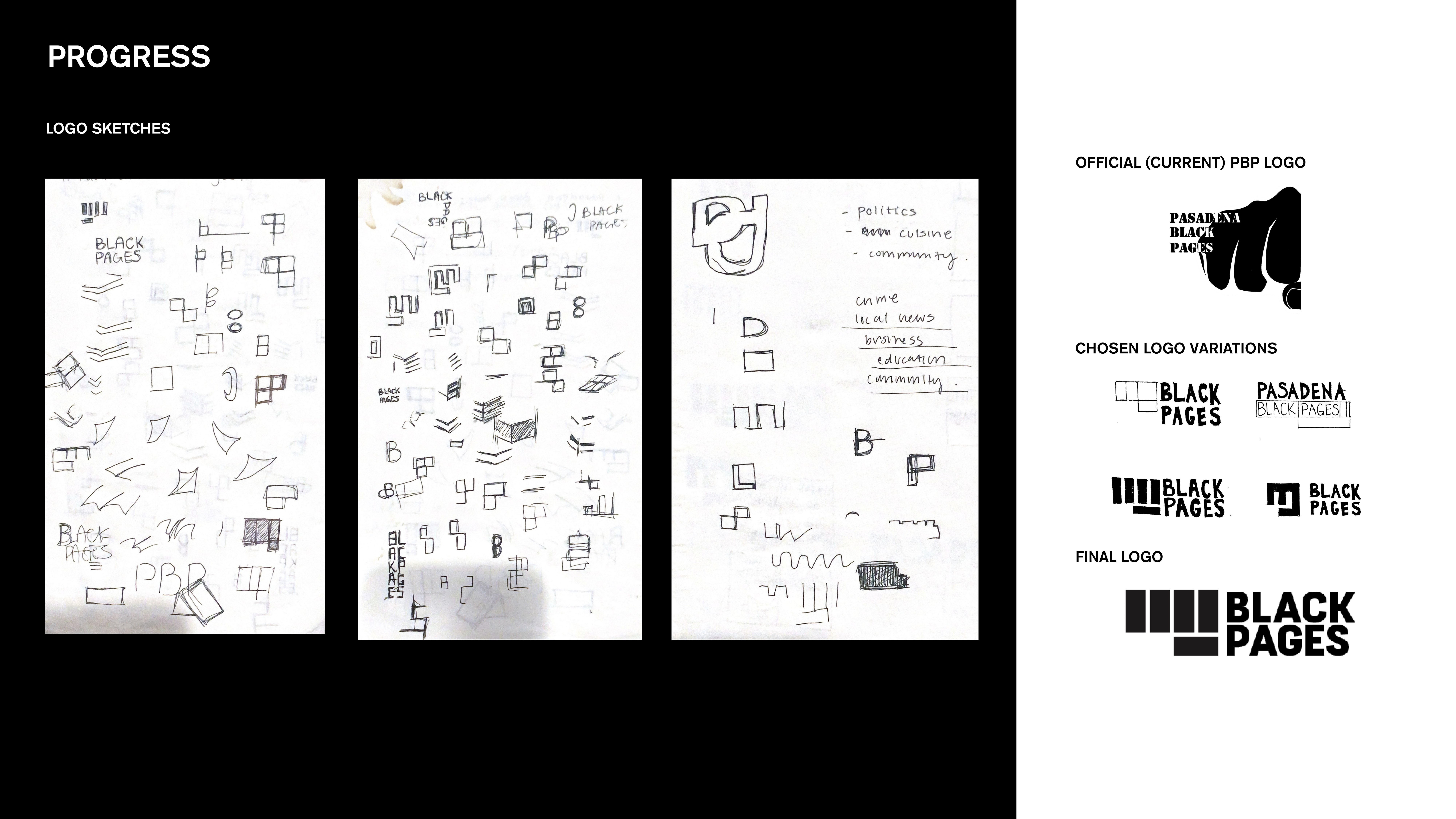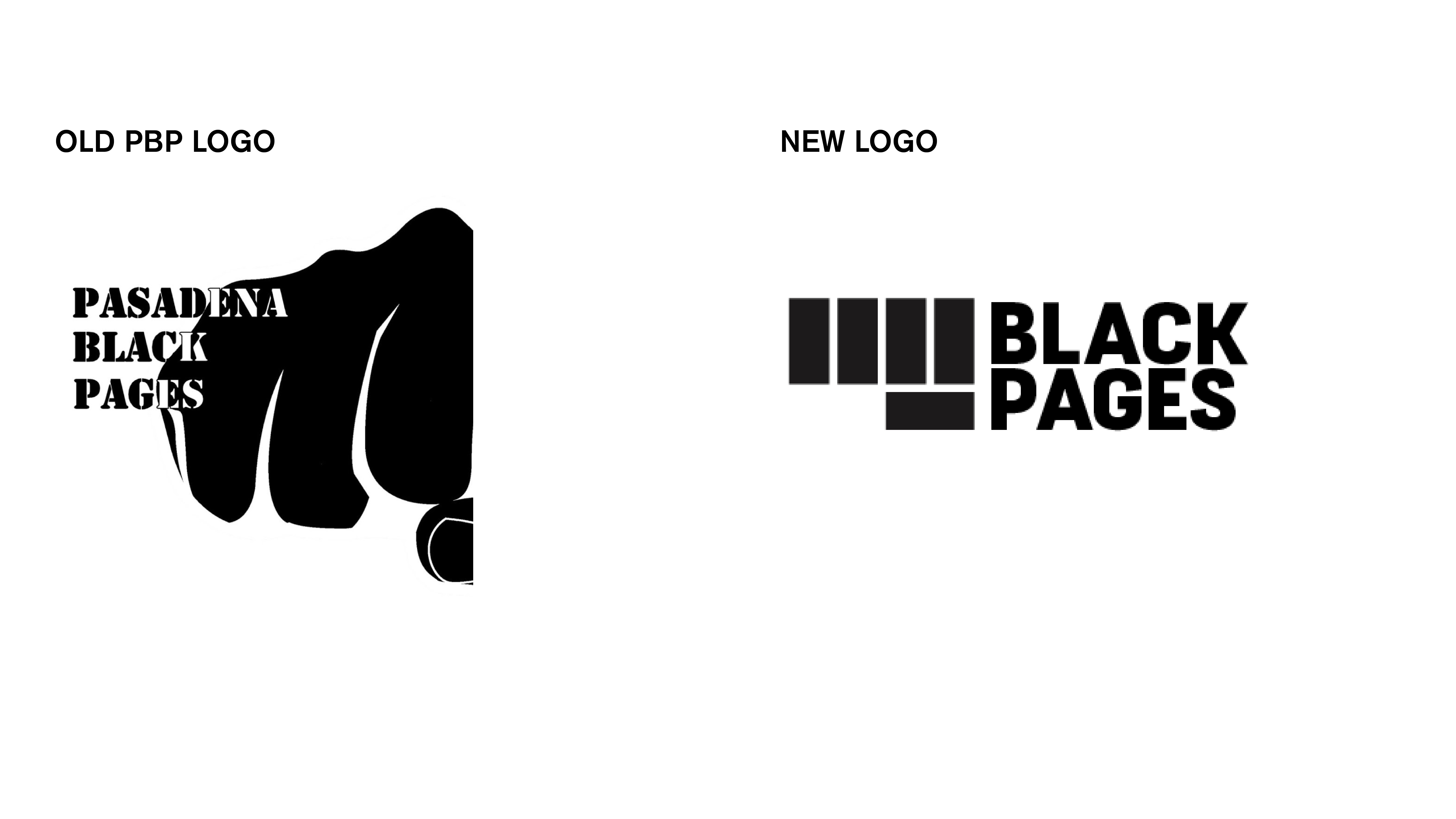 For logos, my main goal of creating a logo for Pasadena Black Pages was to create something that will feel less outdated but still was recognizable in terms of representation of the community. I tried various versions as shown in the progress pictures. The raised fist is a significant symbol for the black community (which the organization represents) representing solidarity and unity. The original logo for PBP (as shown to the right) was a raised fist that was directed towards the viewer — so with the original logo in mind, I created a logo that visually represents a raised fist to further visually communicate the symbol of resistance and defiance.