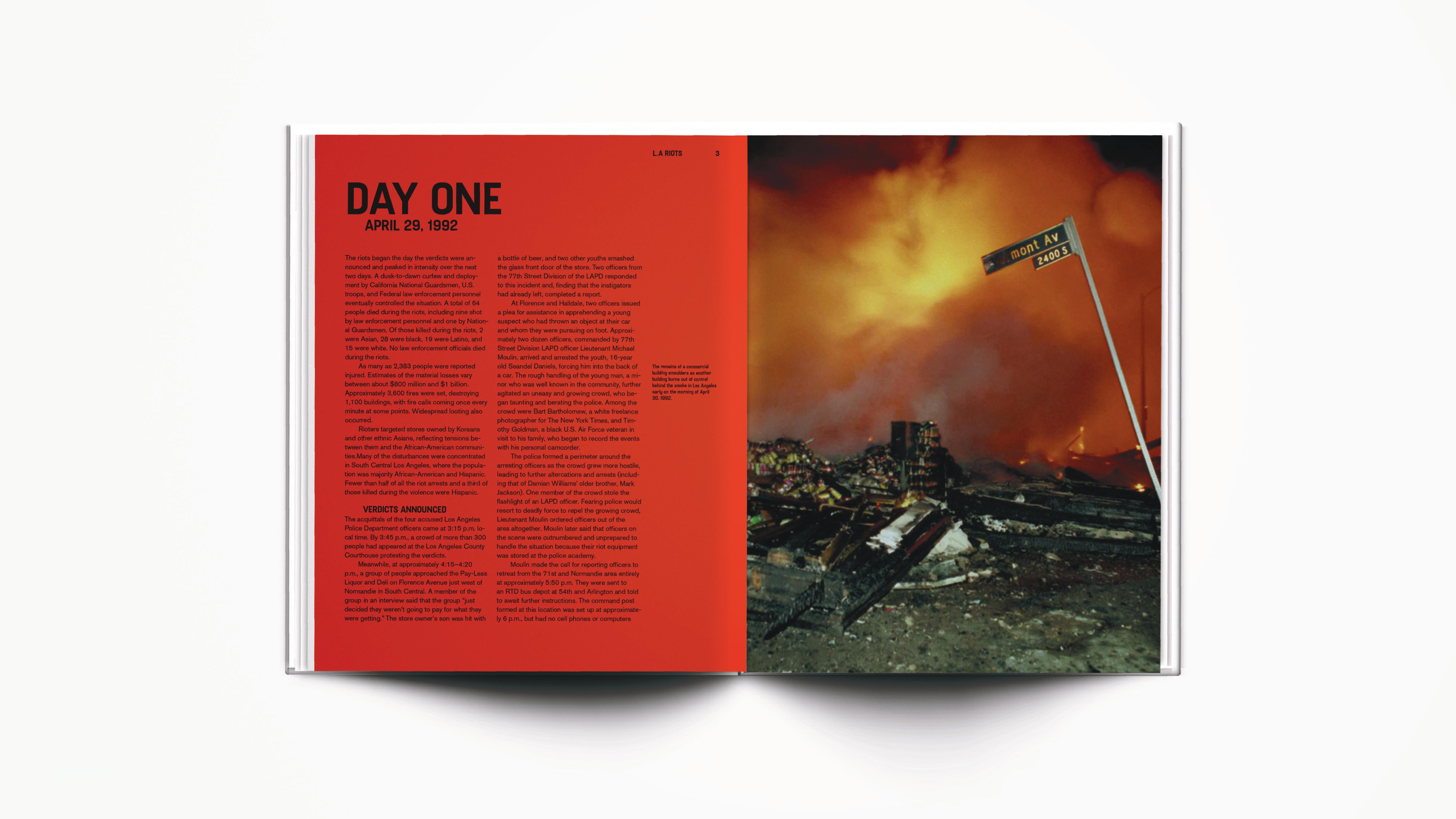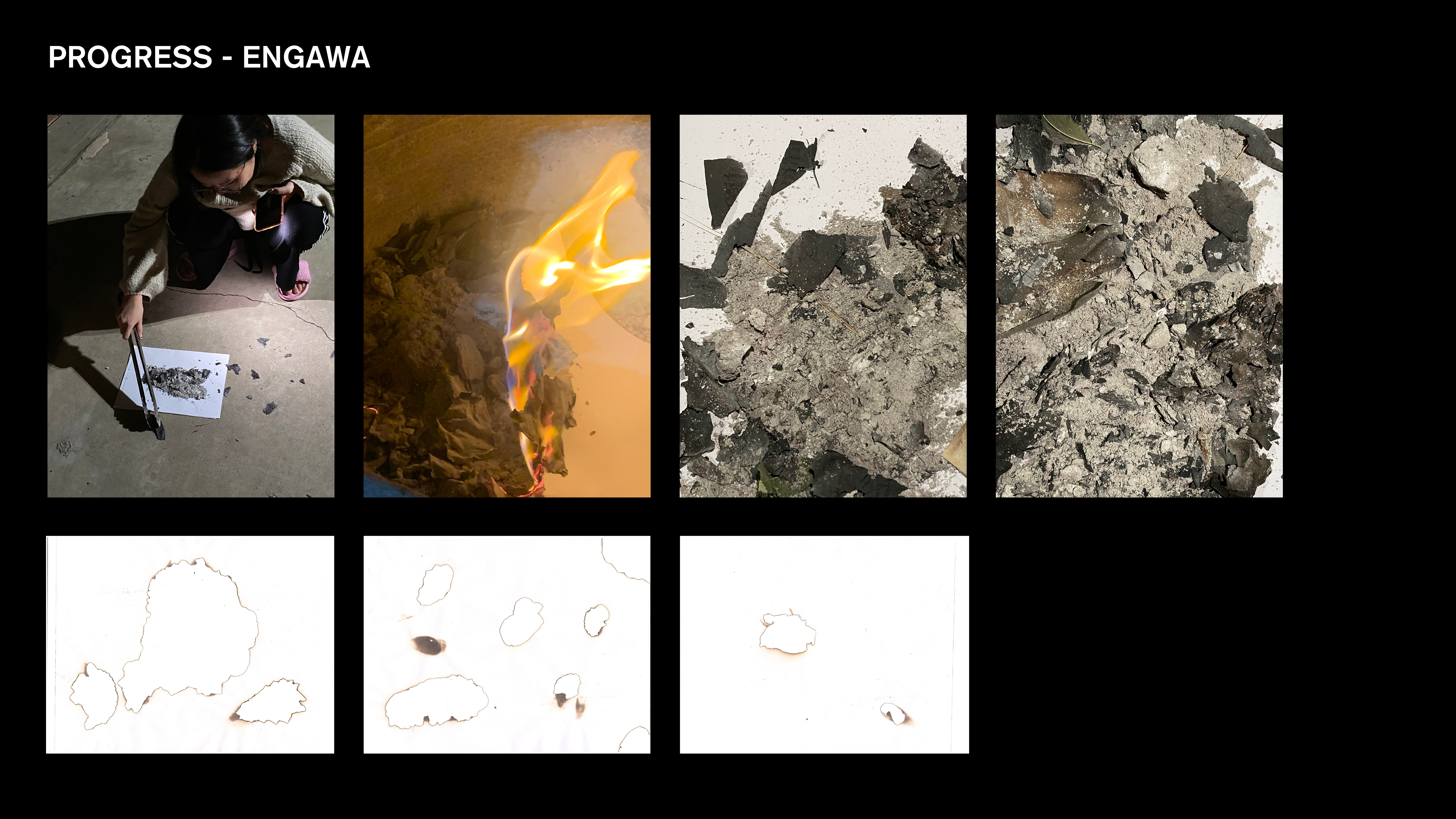 We were tasked on to create an Engawa of the book. The Engawa can be seen as the "opening spreads" for a book that leads the audience to the feeling and tone of your book — like an opening. Since my book talks about the L.A Riots of 1992, I wanted to visually communicate a tone that felt powerful and strong. The L.A Riots were an important event in our history and I wanted to fully be able to communicate the rage and anger that the people of color were affected. Through that in mind, fire was one of the main important signifiers of the L.A Riots. Not only does "burning" fire represent the chaos and anger, when a fire burns out, there are remnants of ashes that signify something has been destructed and cannot be reverted. So through this in mind, I wanted to represent the L.A Riots in an abstract way but still visually communicate the events of the L.A Riots and the events proceeding after the riots. I burned paper at my home, using remnants of ashes and fire. I scanned in paper I burned in as well to create imagery for my engawa.