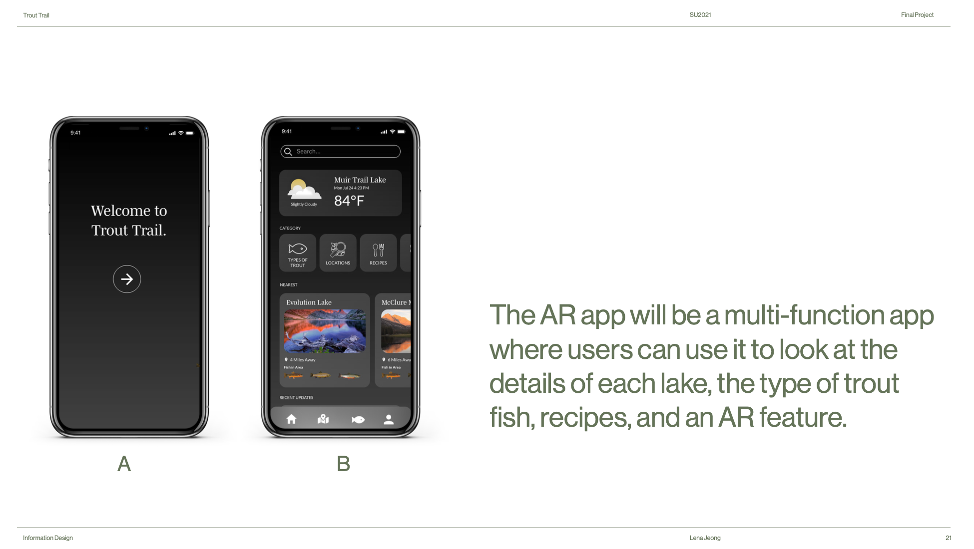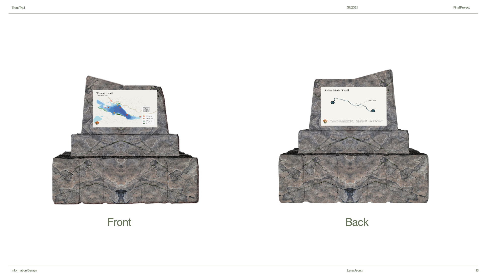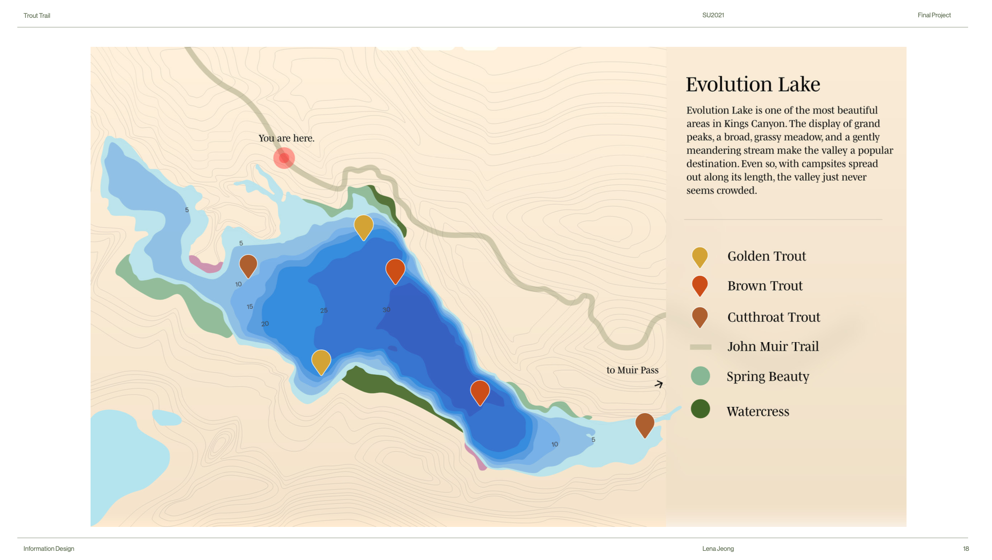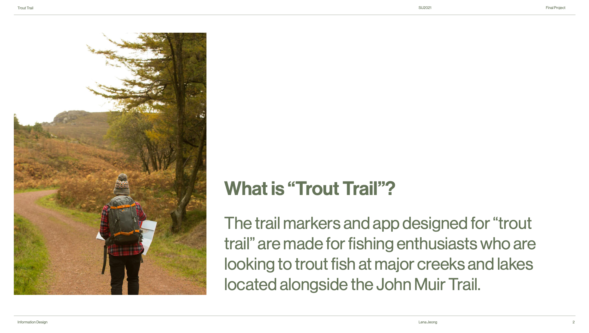 Trout trail is an exhibition design that includes trail markers, an AR app, and a map for fishing enthusiasts who are looking to trout fish at major creeks and lakes located alongside the John Muir Trail.