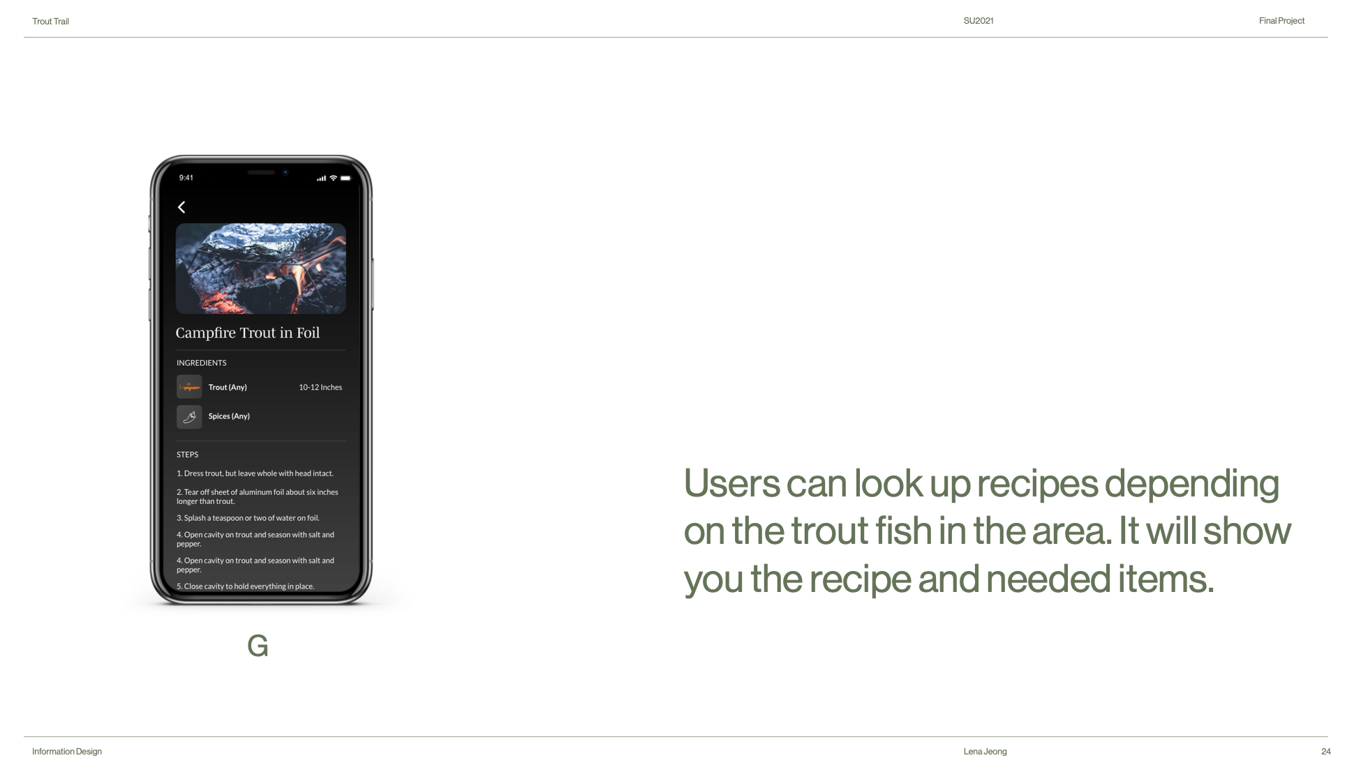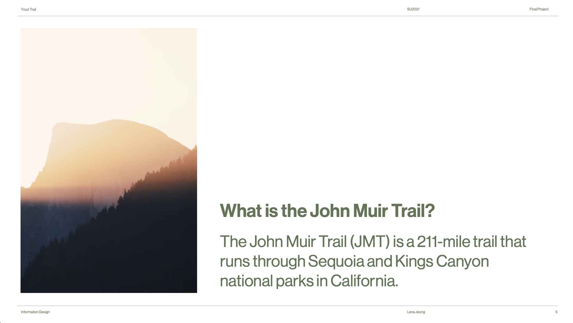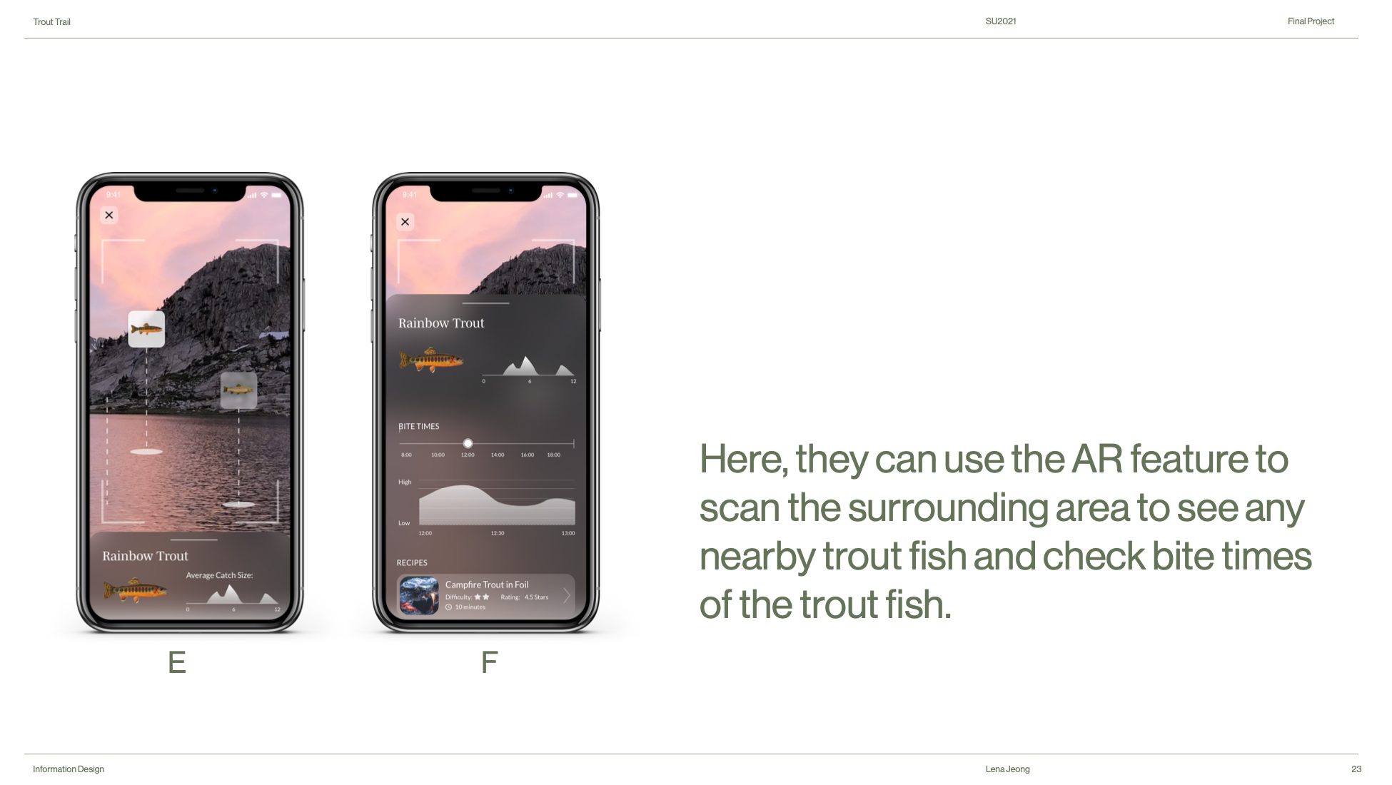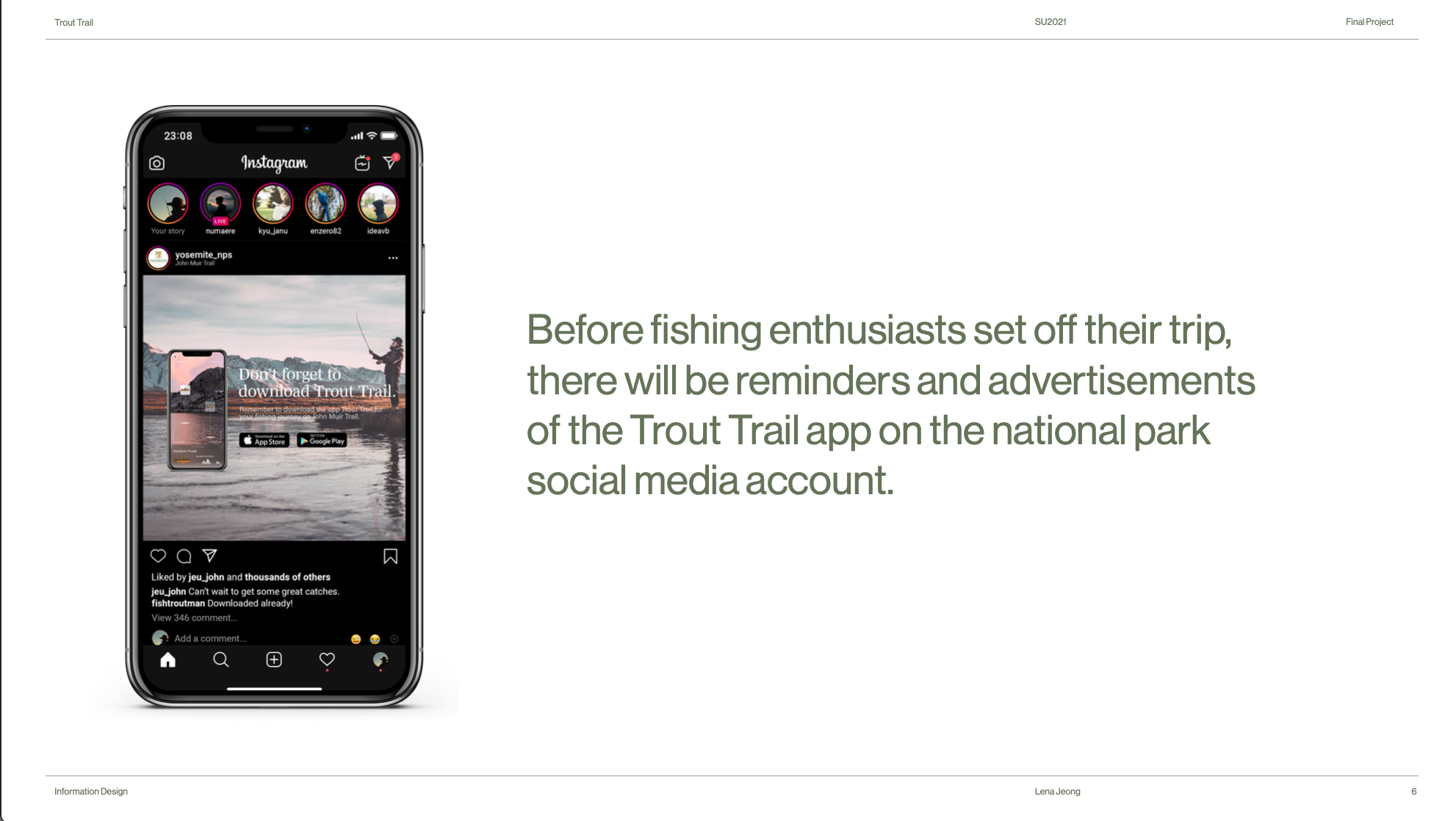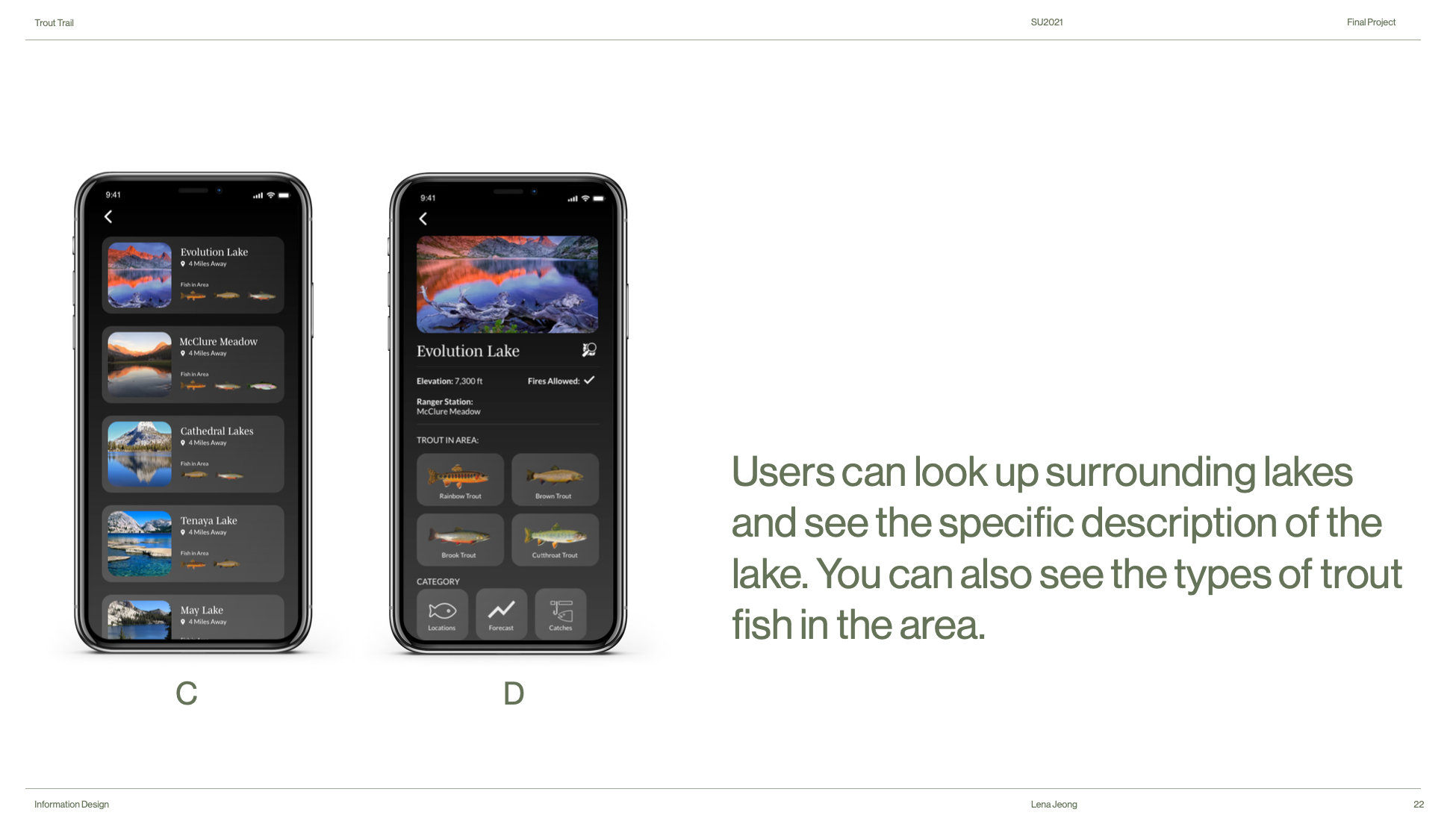 Trout trail is an exhibition design that includes trail markers, an AR app, and a map for fishing enthusiasts who are looking to trout fish at major creeks and lakes located alongside the John Muir Trail.