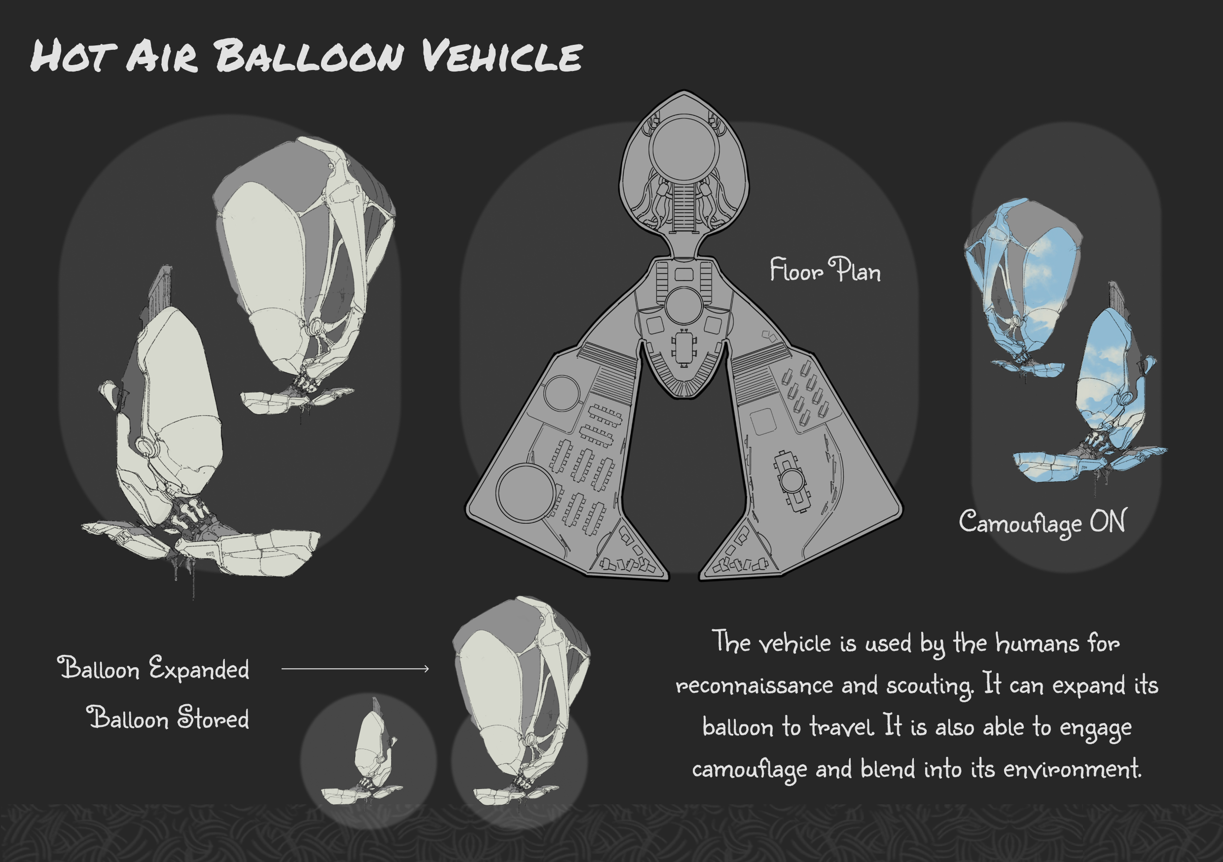 The vehicle is used by the humans for reconnaissance and scouting. It can expand its balloon to travel. It is also able to engage camouflage and blend into its environment.