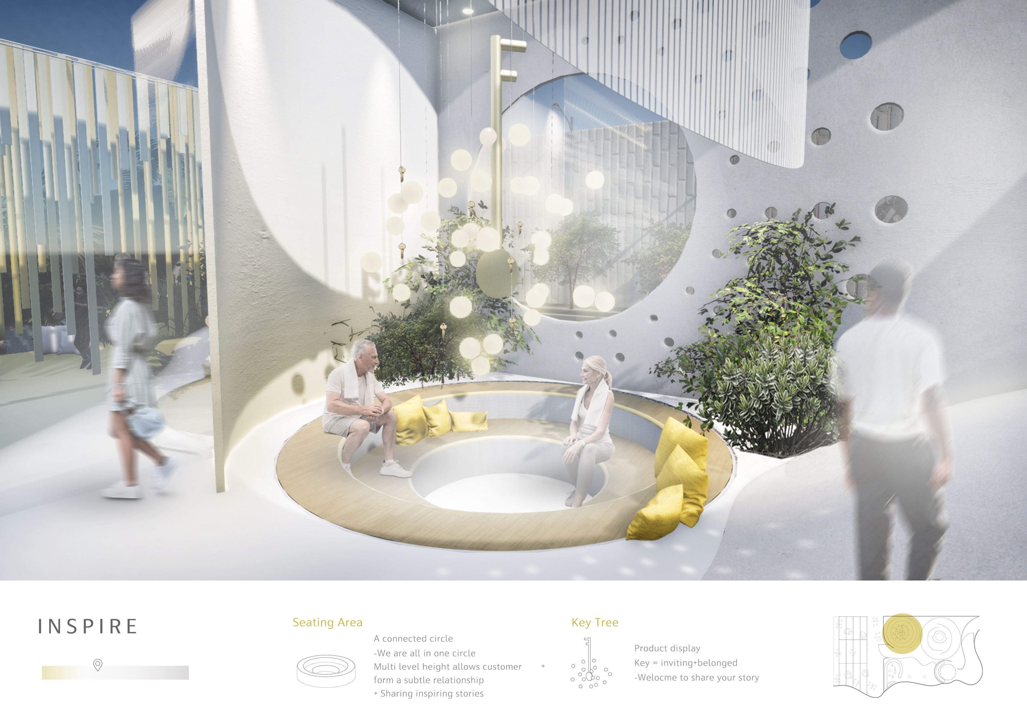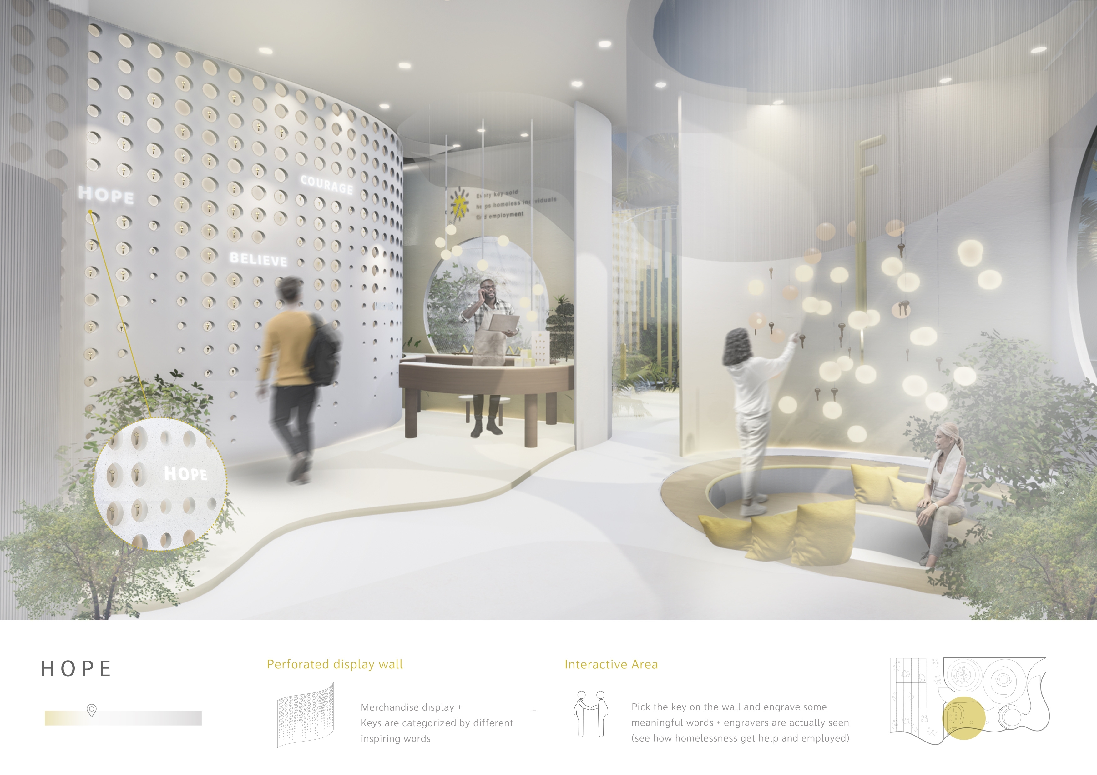The pandemic has brought suffering, fear, and helplessness to populations everywhere. Therefore, inspired by the Los Angeles-based accessories brand-The Giving Keys, this retail store is designed not only helps homeless individuals find employment and a chance to transition out of homelessness but also creates a space for customers to get a taste of hope, realize themselves and take action for a better life.