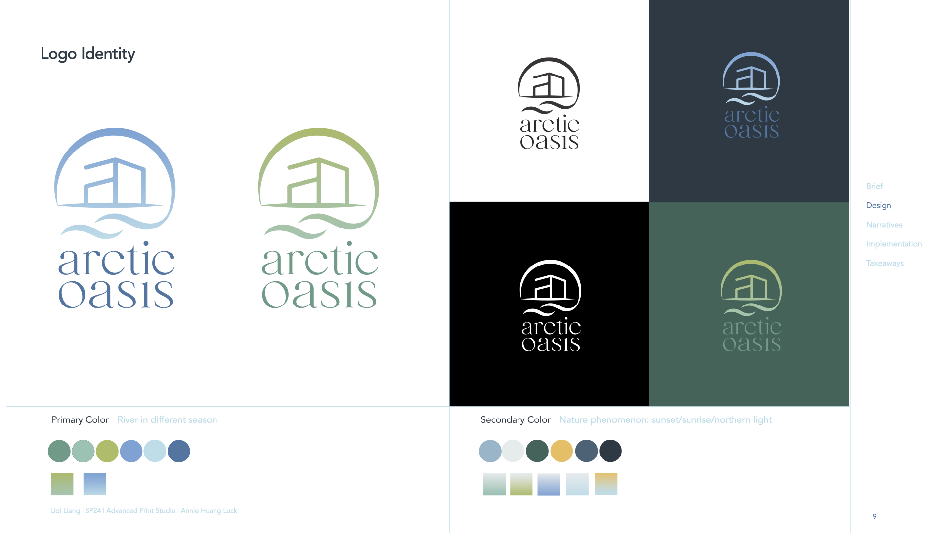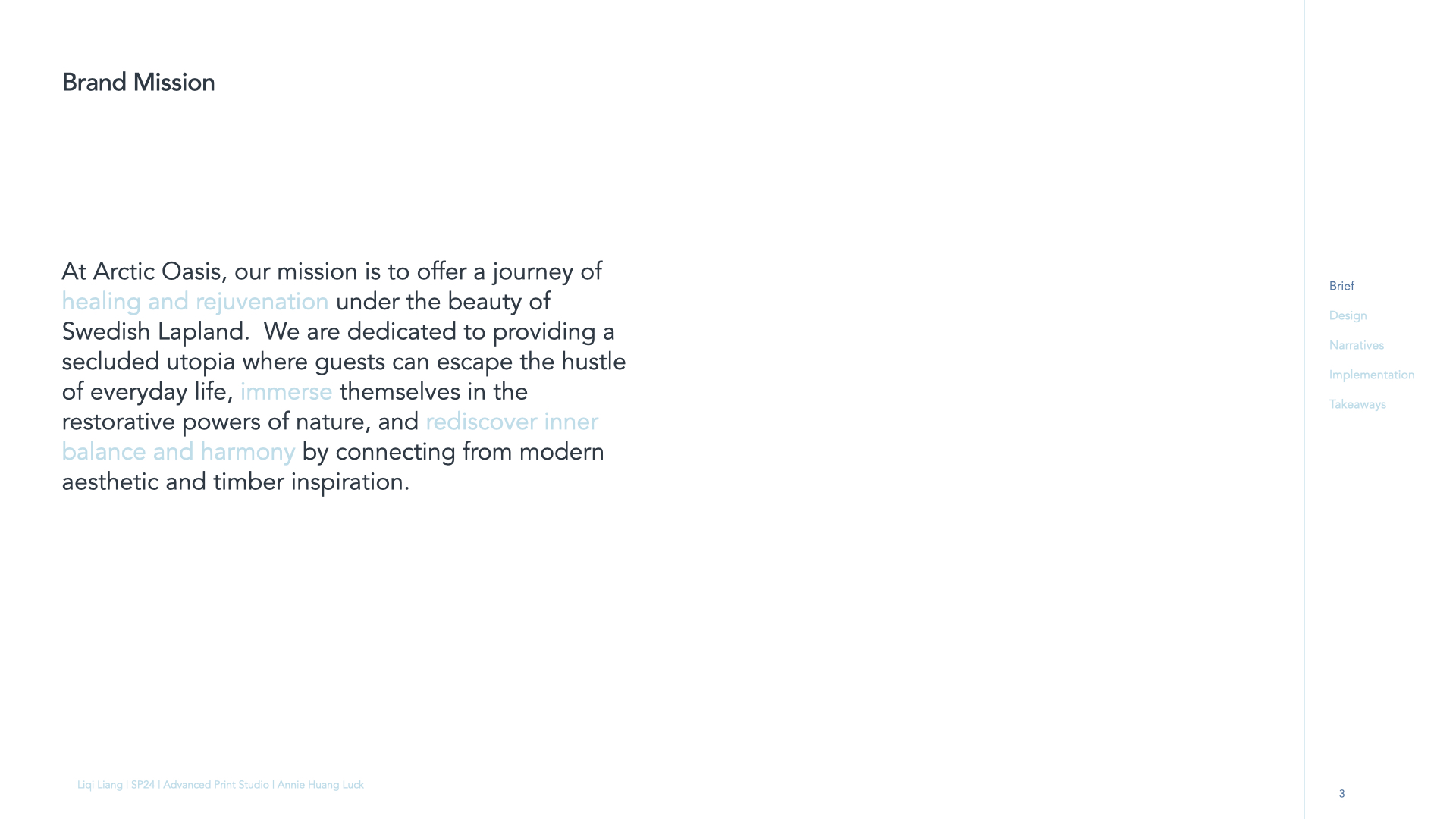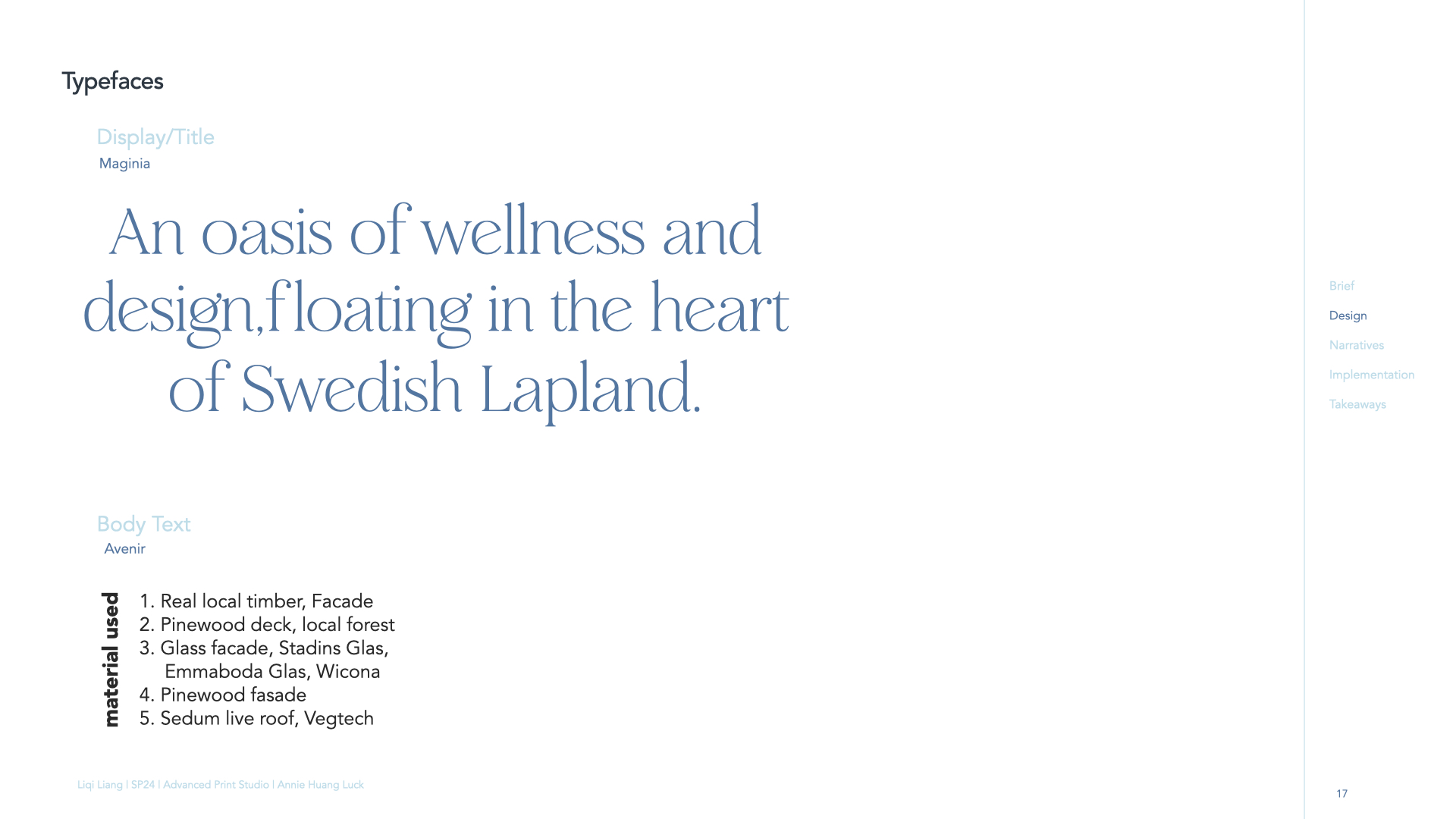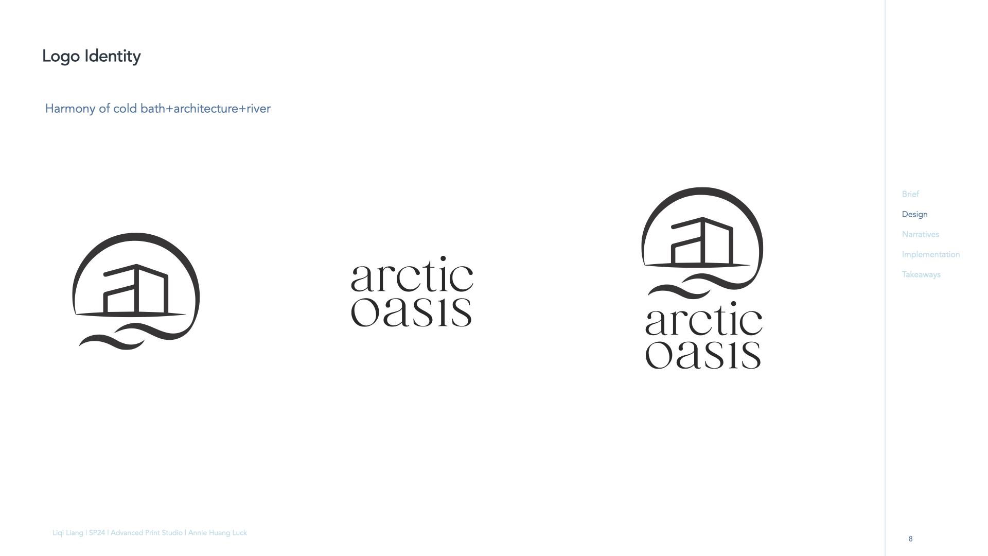 A hypothetical rebrand of Arctic Bath, the unique floating hotel located in the heart of Swedish Lapland on the Lule River, draws its inspiration from the timber floating era. My intention in rebranding this hotel is to raise its luxury and showcase the harmonious connection between the cold baths, architecture, and the Lule River; therefore, I renamed Arctic Bath to Arctic Oasis.
