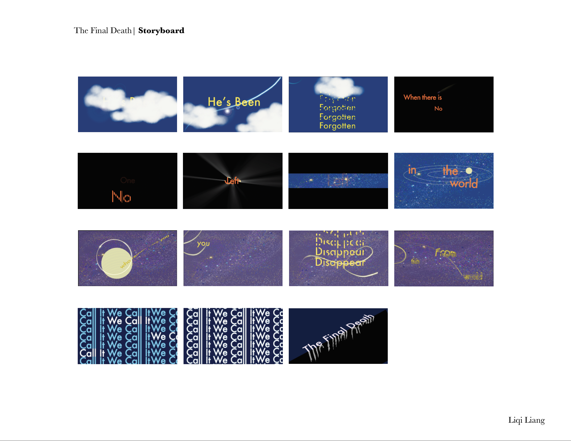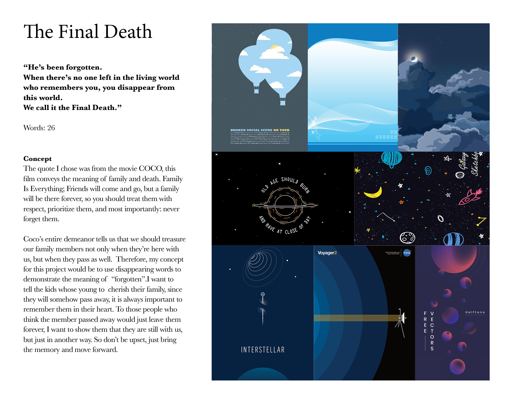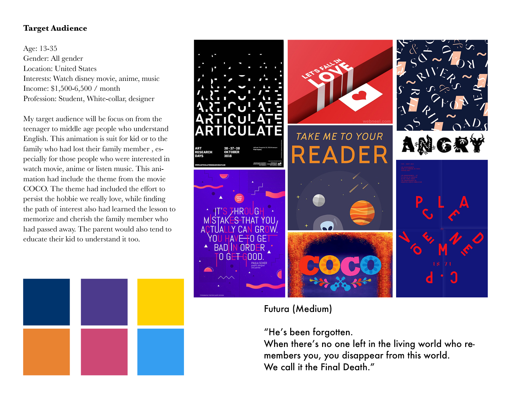 It was a kinetic typography. The quote in this animation was from the movie COCO, which convey the meaning of family and death. Friends will come and go, but a family will be there forever, so you should treat them with respect, prioritize them, and most importantly: never forget them.