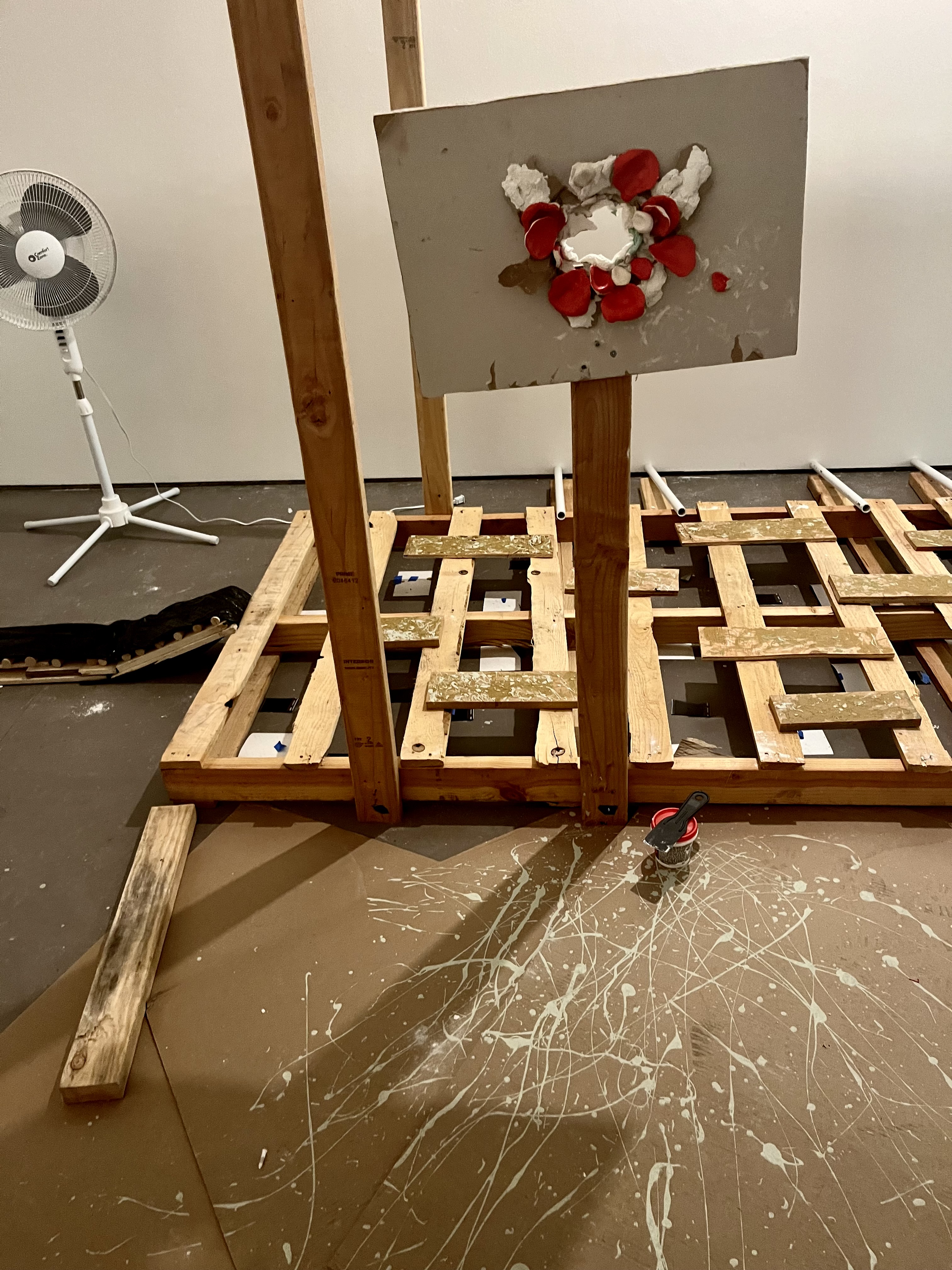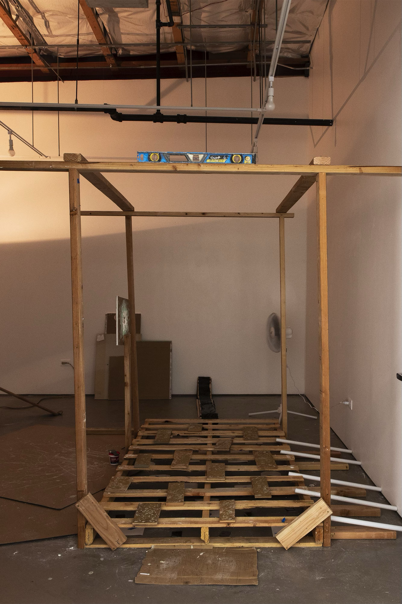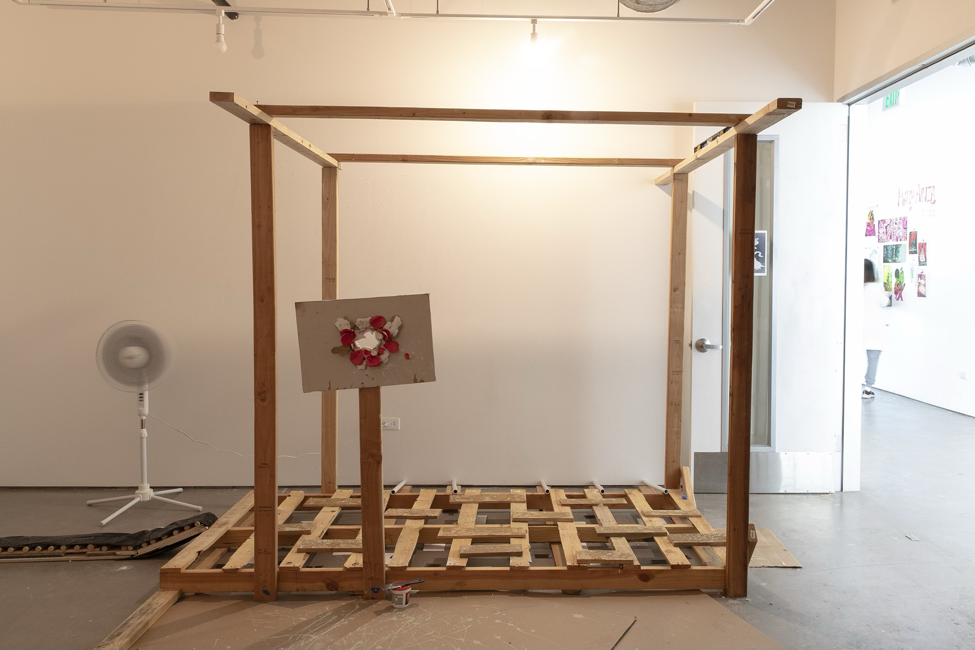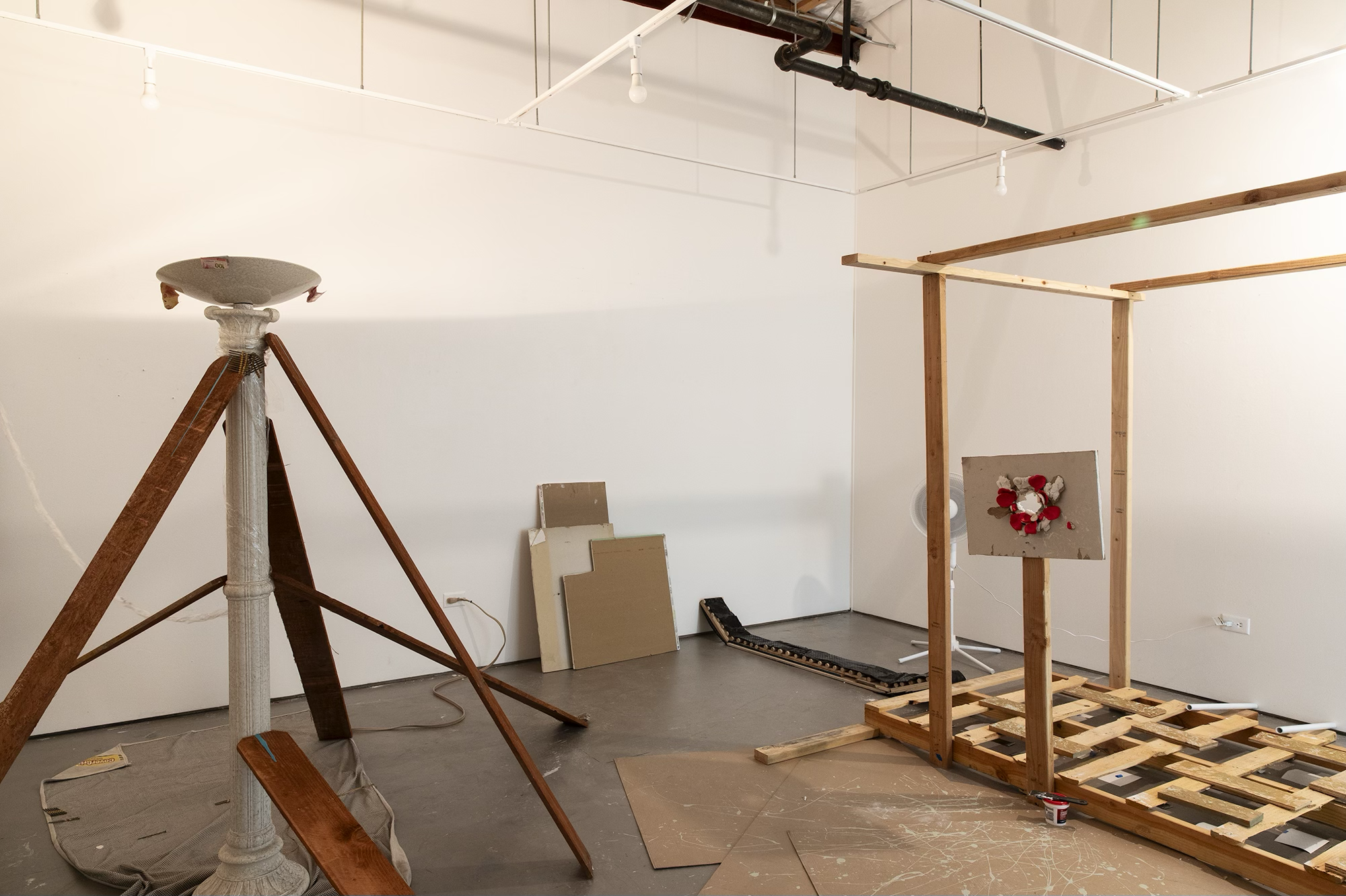 When the Lies Sound Truthful, 2024 Construction materials, wood pallets, air dry clay, house paint, vintage lamp, mirror, fan, light bulb, light switch, PVC pipes, Installation view, ArtCenter Spotlight Gallery, South Pasadena Photo: Aylee Rhodes and Lizeth Gonzalez